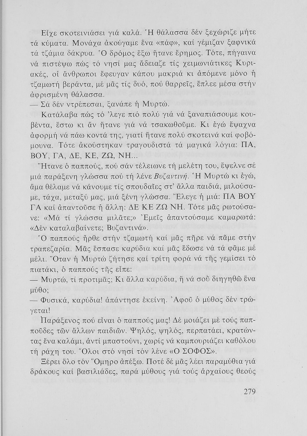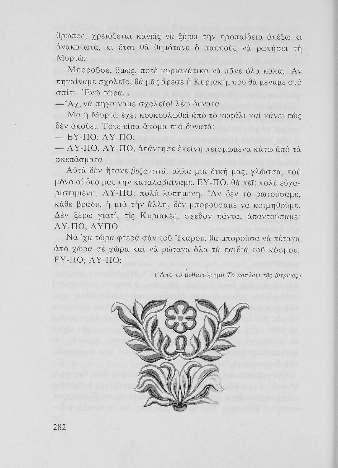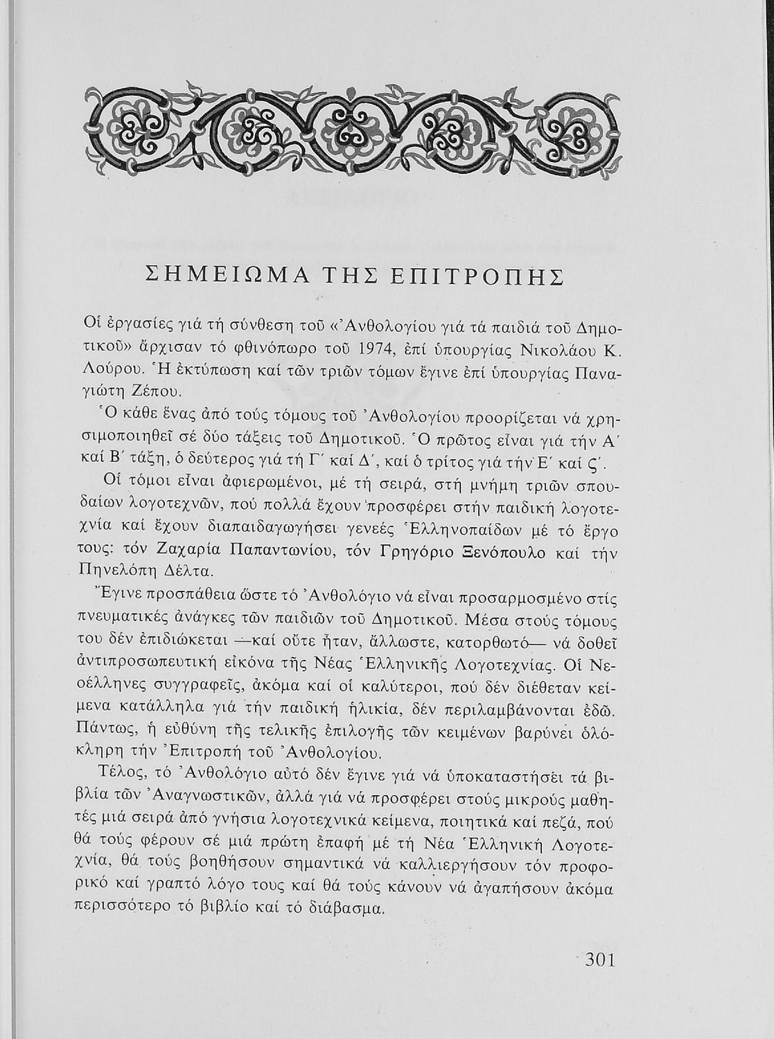 Αναγνωστικό για τις Ε' και ΣΤ΄ Δημοτικού που περιλαμβάνει πεζά και ποιήματα της Νέας Ελληνικής Λογοτεχνίας εμπνευσμένα από την καθημερινότητα των παιδιών και των οικογενειών τους, την ελληνική ιστορία, τις οικογενειακές στιγμές και εορτές, το παιχνίδι και την εθνική παράδοση, και τα δημοτικά και ακριτικά τραγούδια. Περιέχει και 5 κείμενα γραμμένα στην καθαρεύουσα με θέματα από τον κοινωνικό και εθνικό βίο, και ερμηνευτικό λεξιλόγιο.. Το βιβλίο είναι αφιερωμένο στη μνήμη της Πηνελόπης Δέλτα.