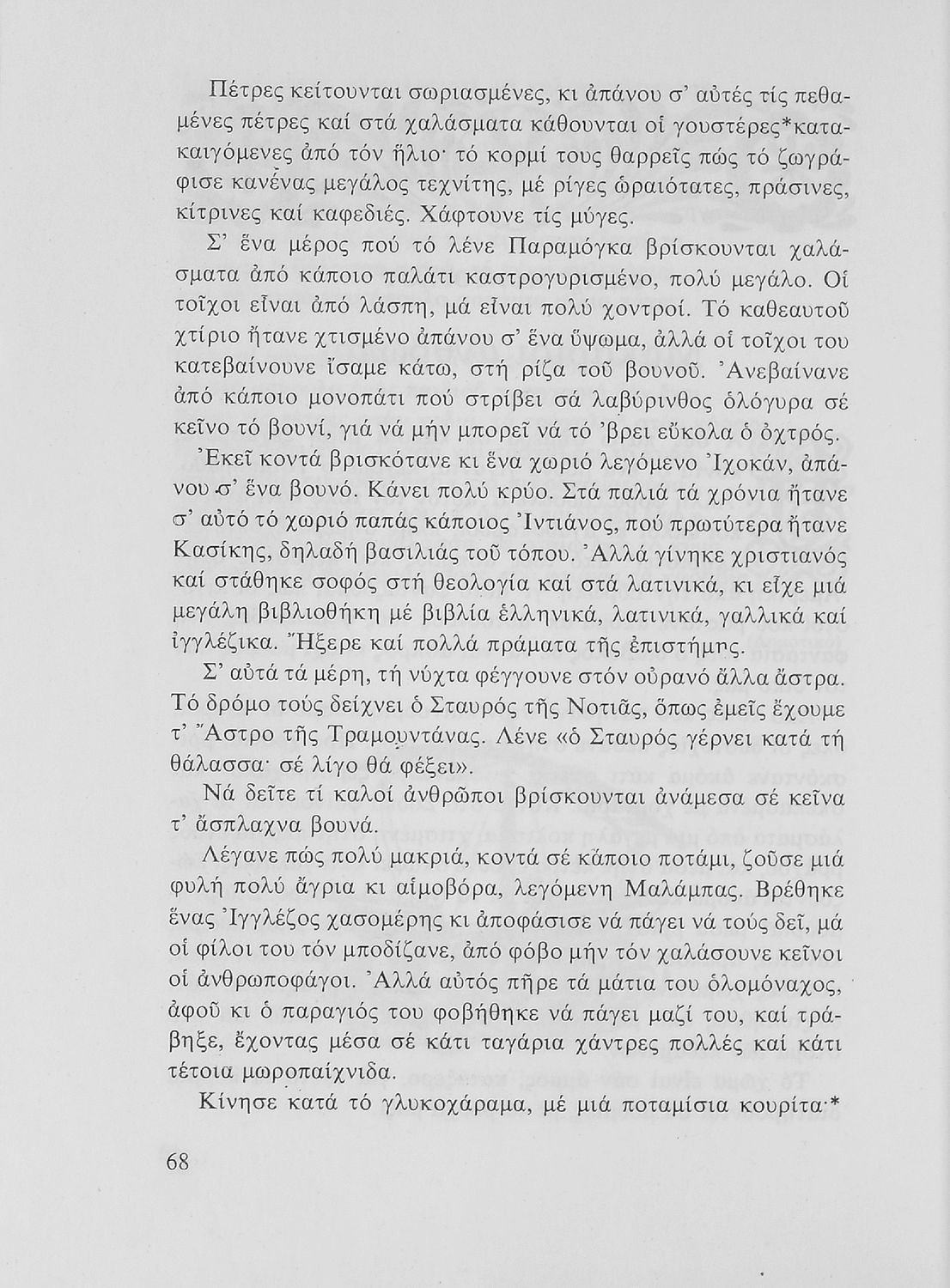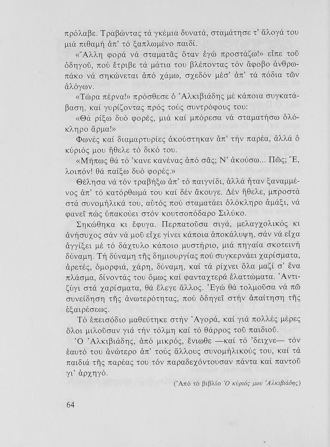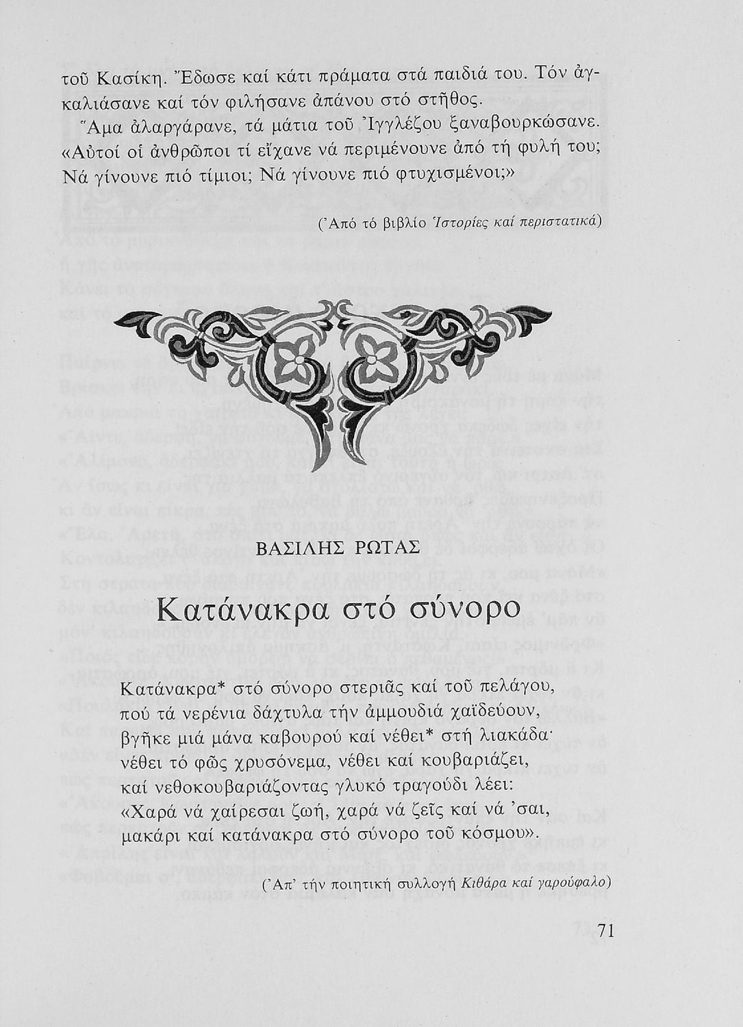 Αναγνωστικό για τις Ε' και ΣΤ΄ Δημοτικού που περιλαμβάνει πεζά και ποιήματα της Νέας Ελληνικής Λογοτεχνίας εμπνευσμένα από την καθημερινότητα των παιδιών και των οικογενειών τους, την ελληνική ιστορία, τις οικογενειακές στιγμές και εορτές, το παιχνίδι και την εθνική παράδοση, και τα δημοτικά και ακριτικά τραγούδια. Περιέχει και 5 κείμενα γραμμένα στην καθαρεύουσα με θέματα από τον κοινωνικό και εθνικό βίο, και ερμηνευτικό λεξιλόγιο.. Το βιβλίο είναι αφιερωμένο στη μνήμη της Πηνελόπης Δέλτα.