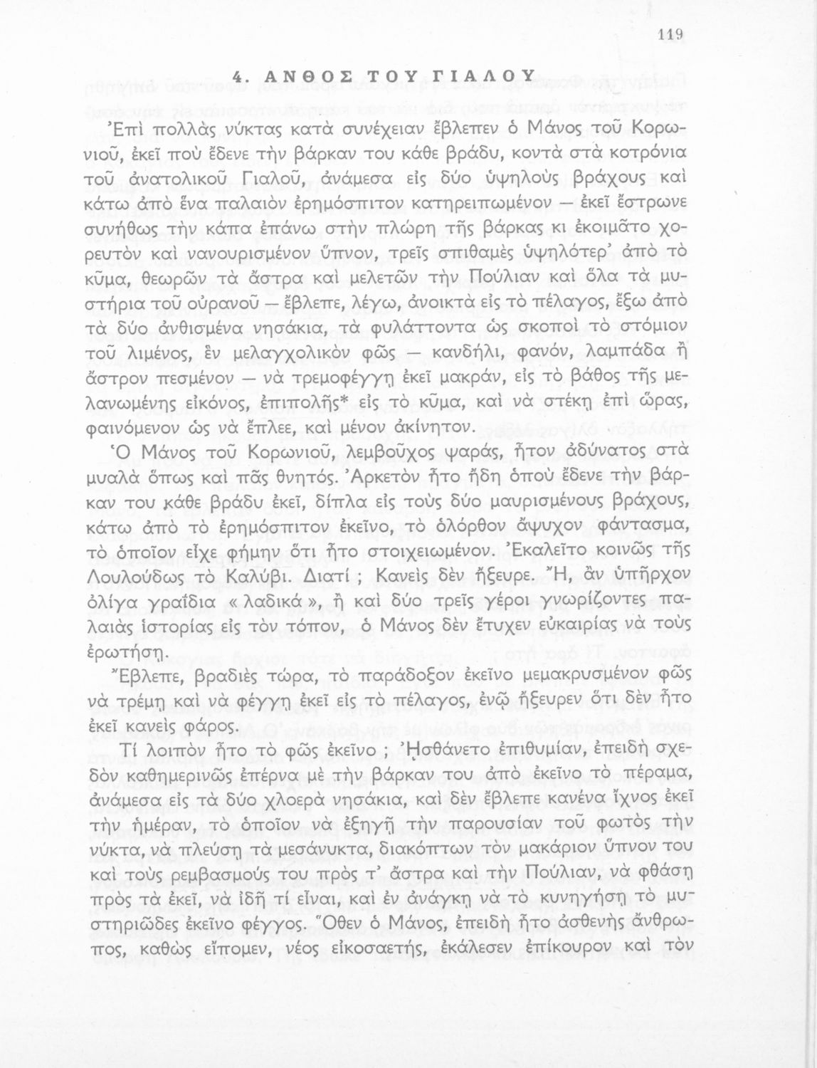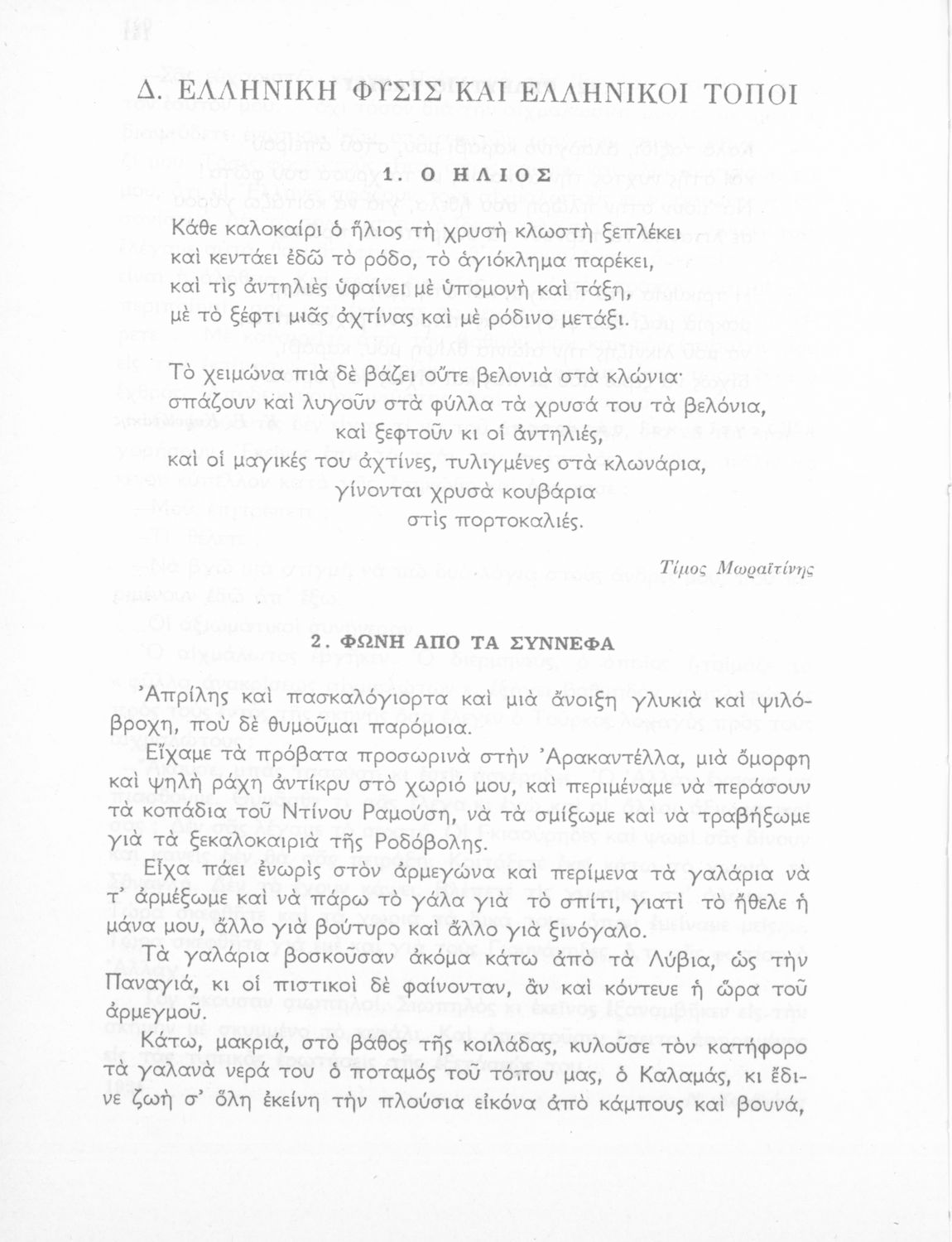 Σχολικό εγχειρίδιο Νέων Ελληνικών Δ' Γυμνασίου που περιλαμβάνει πεζά, ποιήματα και παροιμίες Ελλήνων συγγραφέων εμπνευσμένα από τη θρησκευτική και κοινωνική ζωή, τη βυζαντινή ιστορία, την αρχαία και σύγχρονη ελληνική ιστορία, και την ελληνική φύση. Περιέχει παράρτημα με βιογραφίες των συγγραφέων και λεξιλόγιο.
