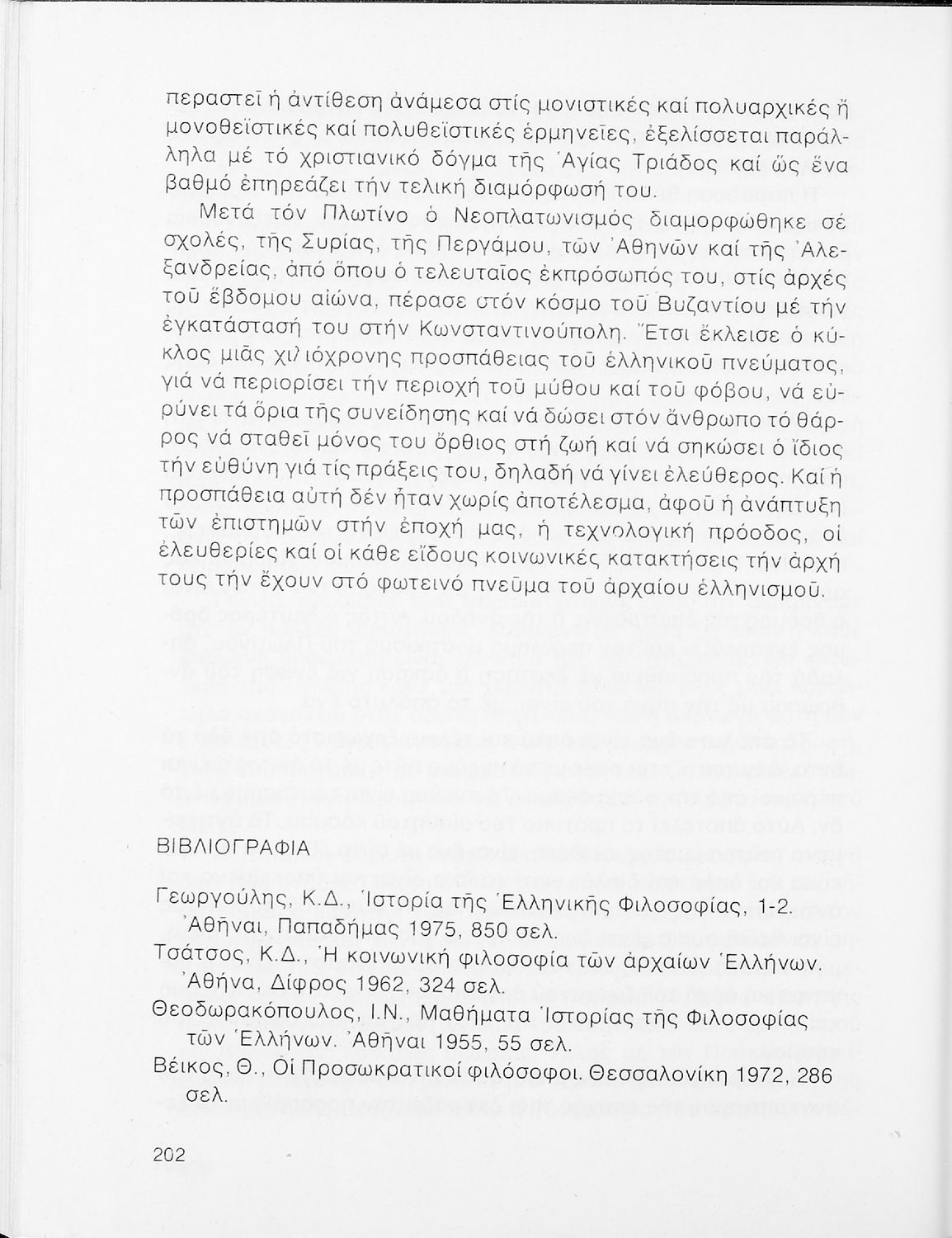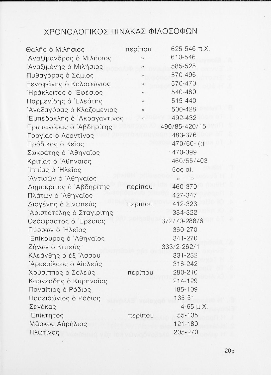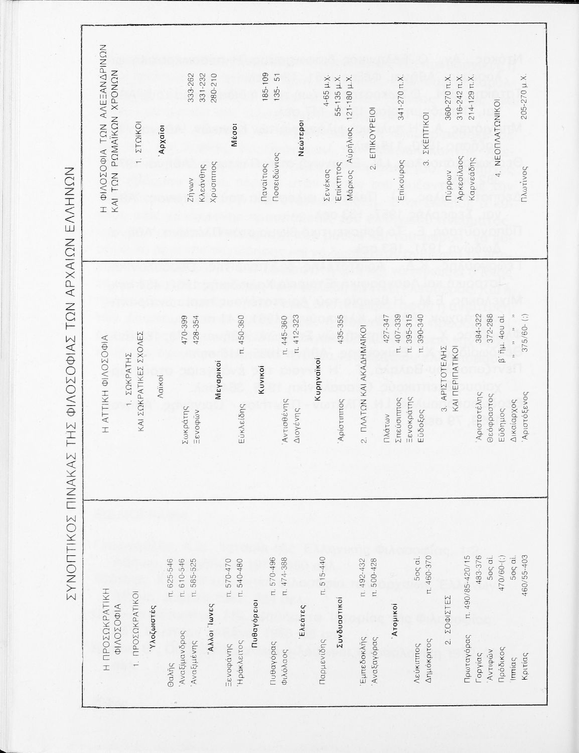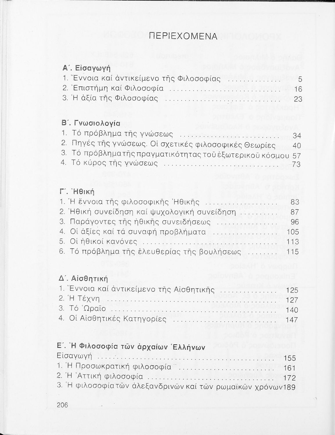 Σχολικό εγχειρίδιο Φιλοσοφίας Γ΄ Λυκείου που ακολουθεί μια ιστορική πραγμάτευση επιστημολογικών, ηθικών και αισθητικών ζητημάτων και καλύπτει δύο περιόδους: α) την ελληνική αρχαιότητα και β) την σύγχρονη ευρωπαϊκή σκέψη από τον Descartes και τον Kant στον λογικό θετικισμό και τον νεοκαντιανισμό. Περιέχει εκτενές κεφάλαιο για τους προσωκρατικούς.