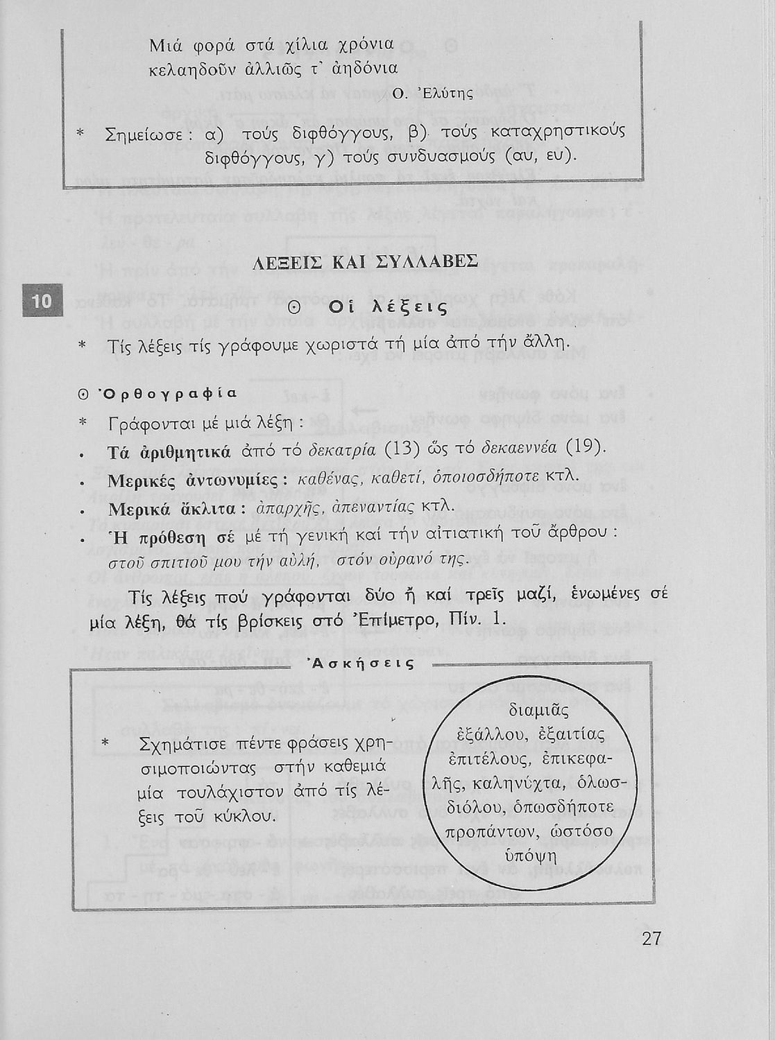 Σχολικό εγχειρίδιο για την Ε΄ και ΣΤ΄ τάξη Δημοτικού με γραμματικούς κανόνες και παραδείγματα για τα κλιτά και άκλιτα μέρη του λόγου.