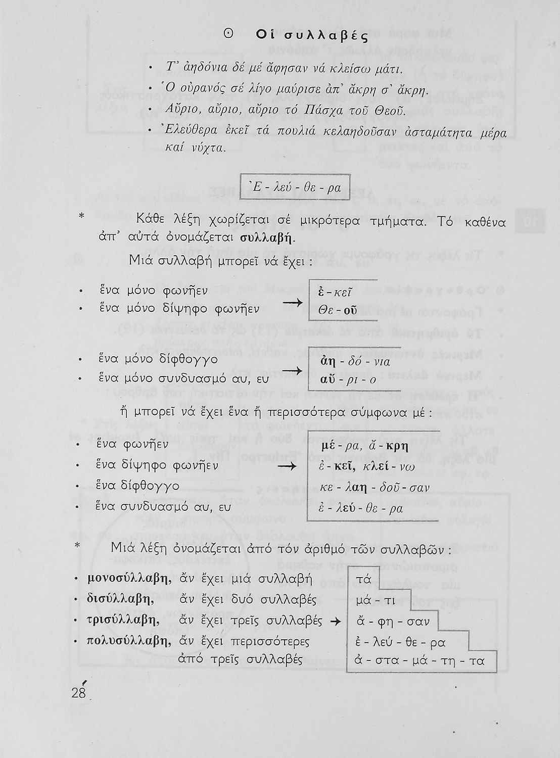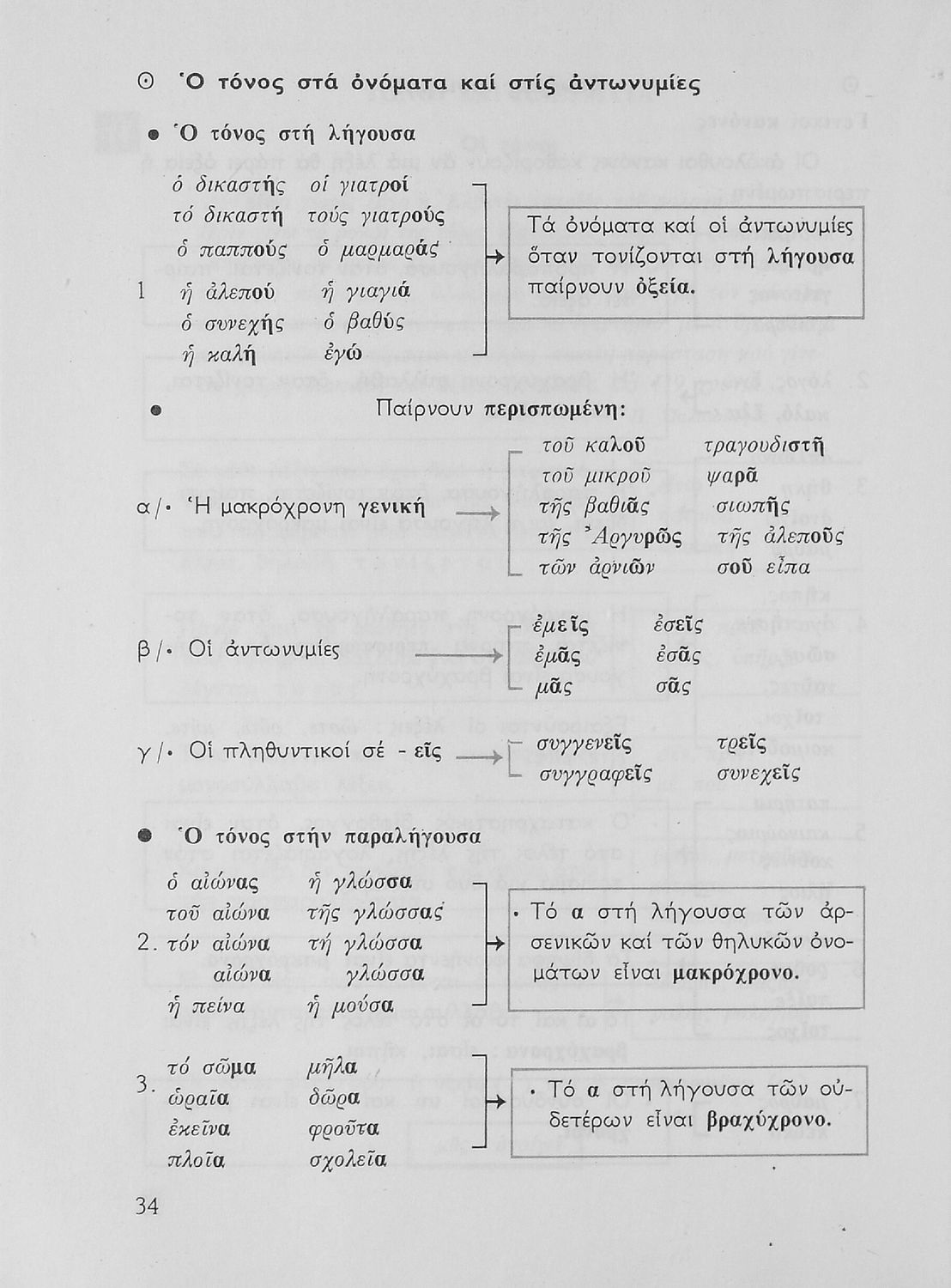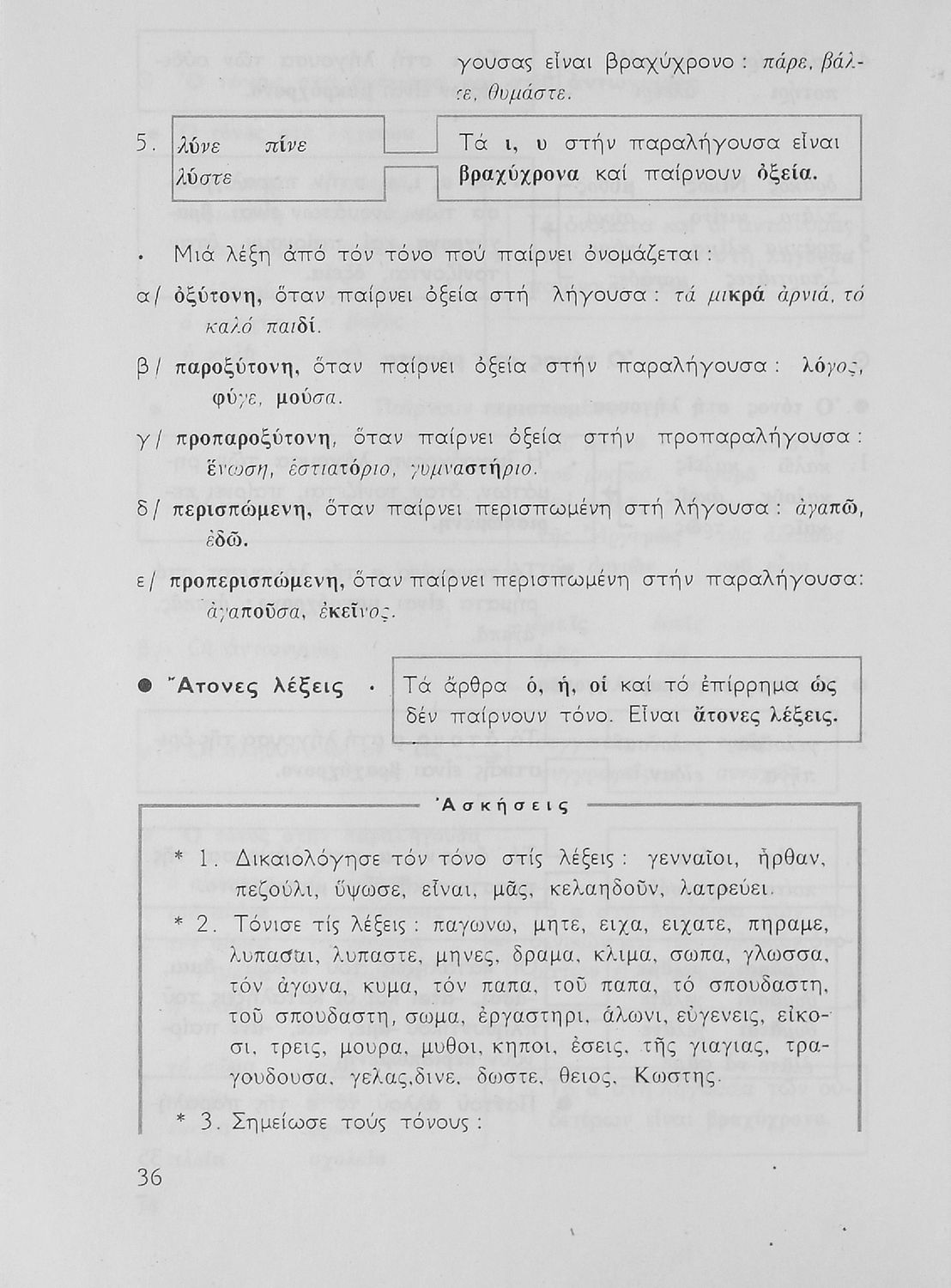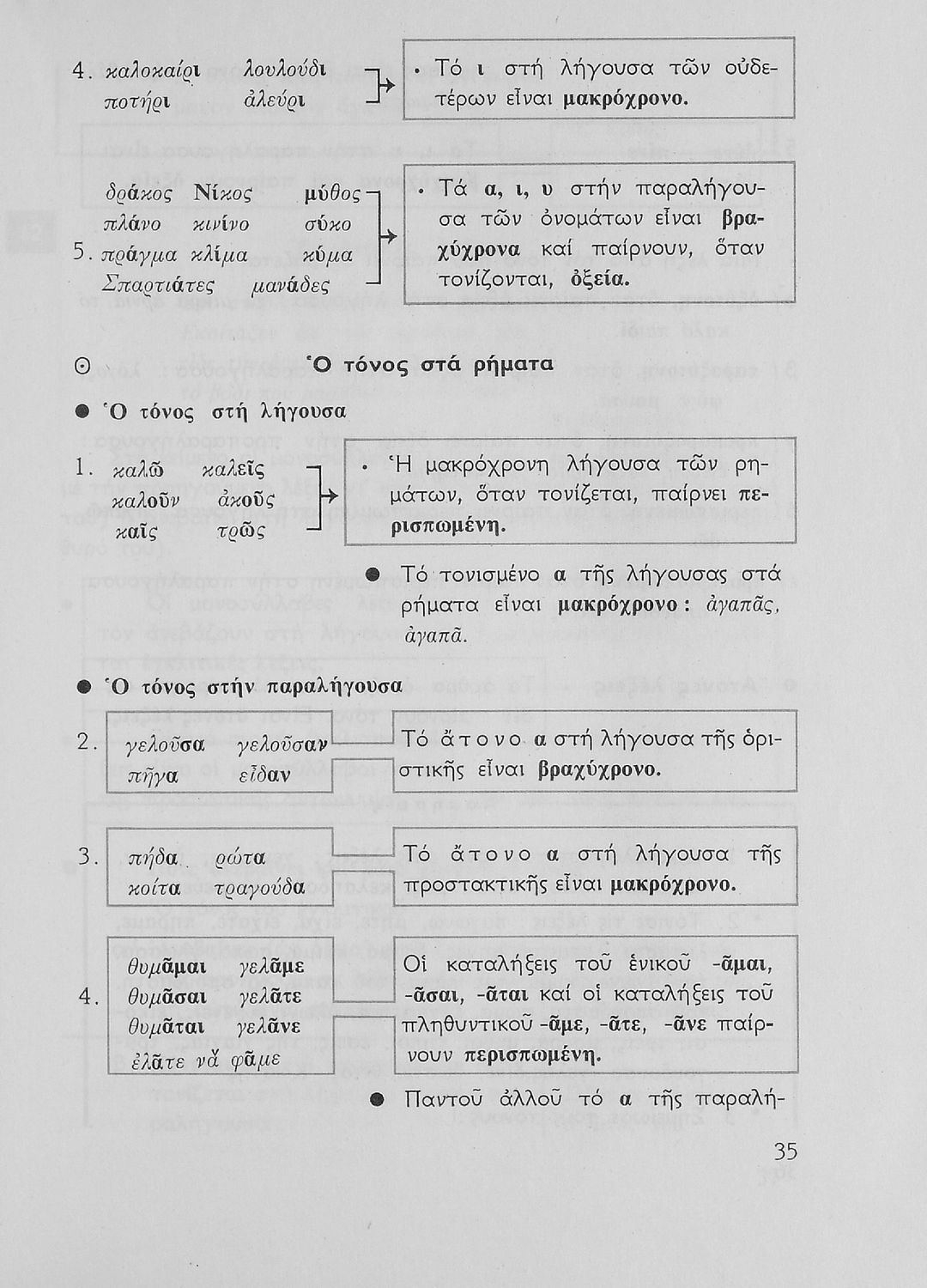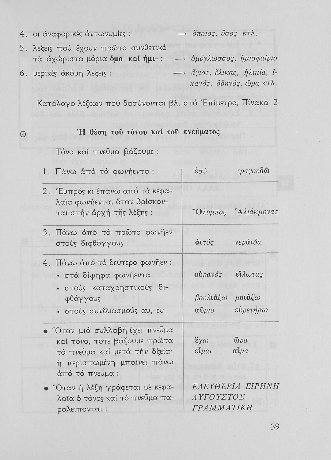Σχολικό εγχειρίδιο της Ε΄ και ΣΤ΄ τάξης Δημοτικού για την γραμματική της ελληνικής γλώσσας με κανόνες και παραδείγματα. Στο επίμετρο υπάρχουν πίνακες με ανώμαλους σχηματισμούς ρημάτων.