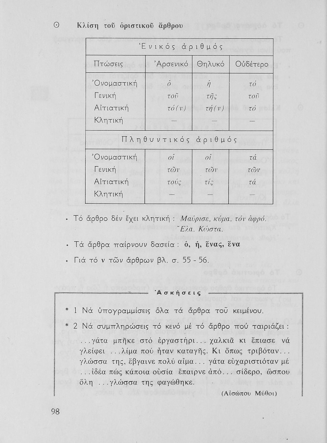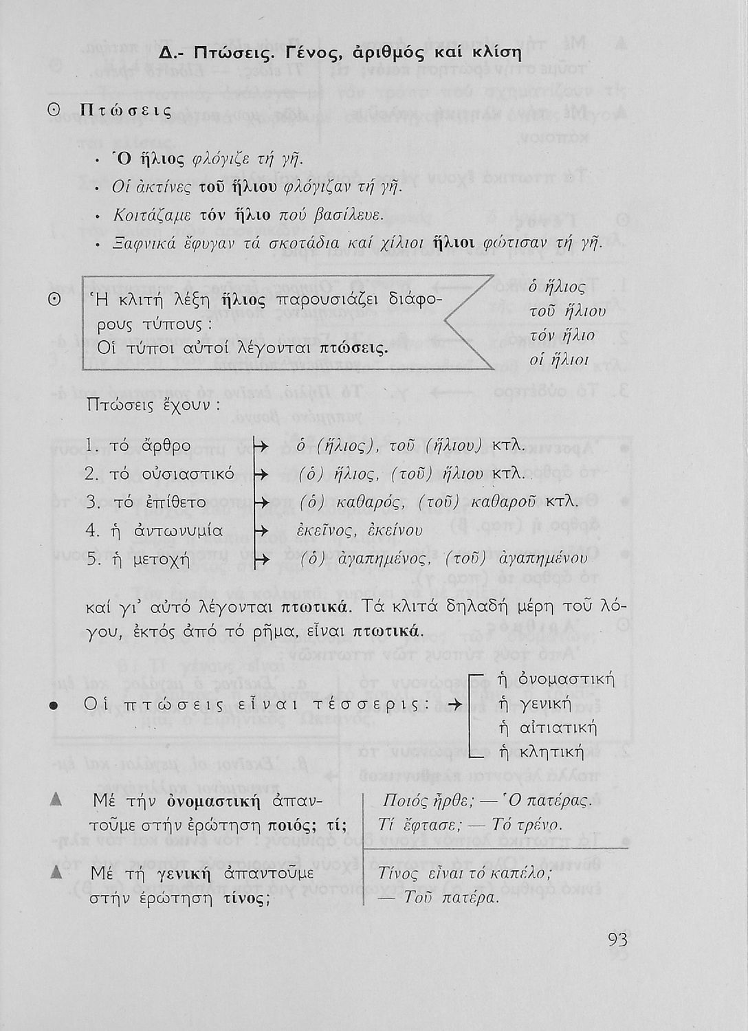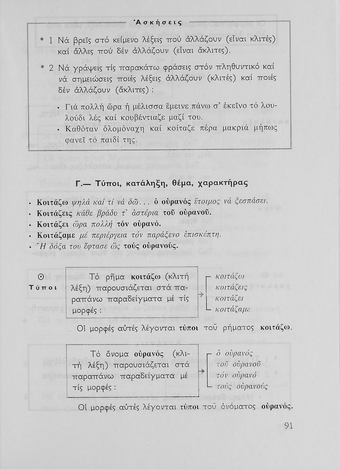Σχολικό εγχειρίδιο της Ε΄ και ΣΤ΄ τάξης Δημοτικού για την γραμματική της ελληνικής γλώσσας με κανόνες και παραδείγματα. Στο επίμετρο υπάρχουν πίνακες με ανώμαλους σχηματισμούς ρημάτων.