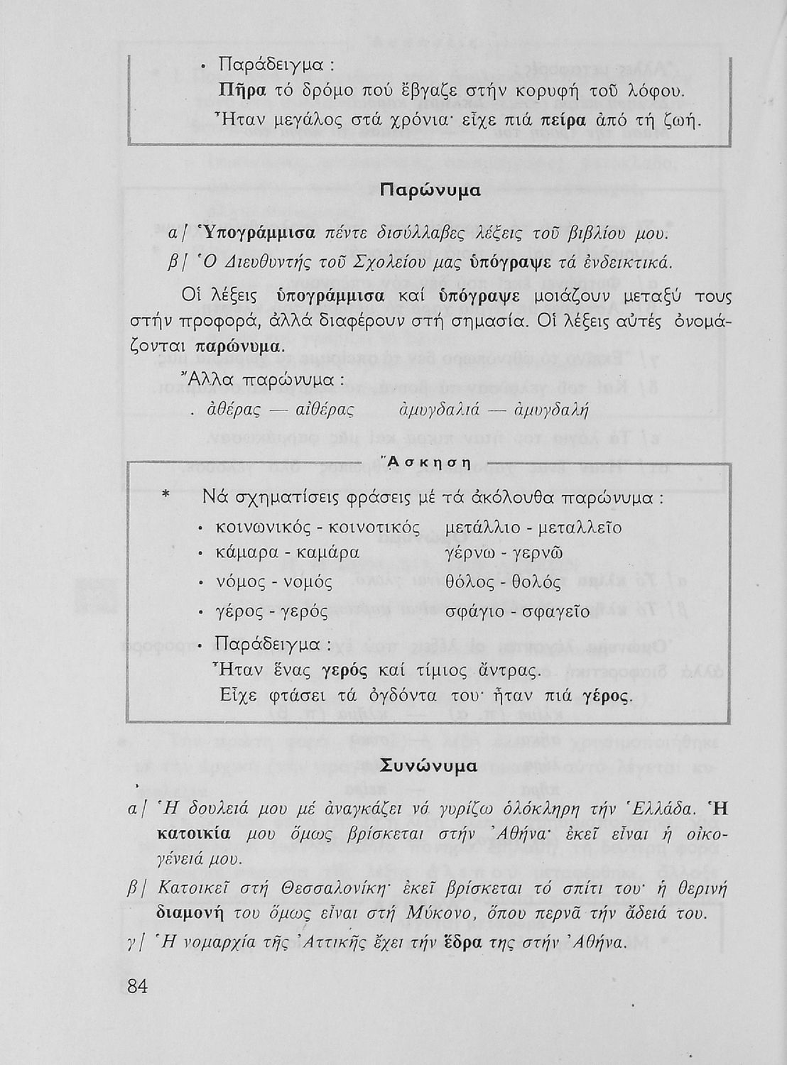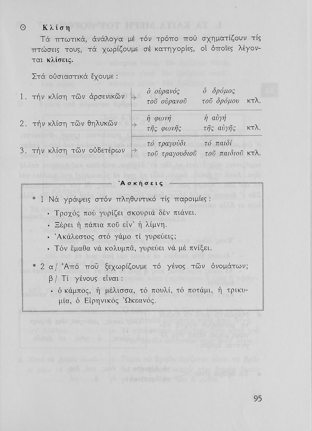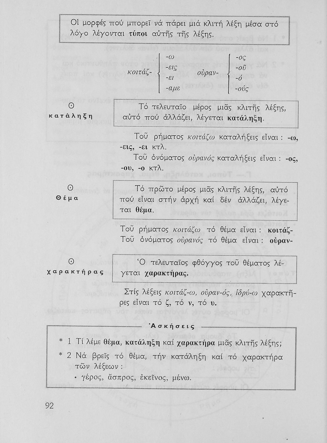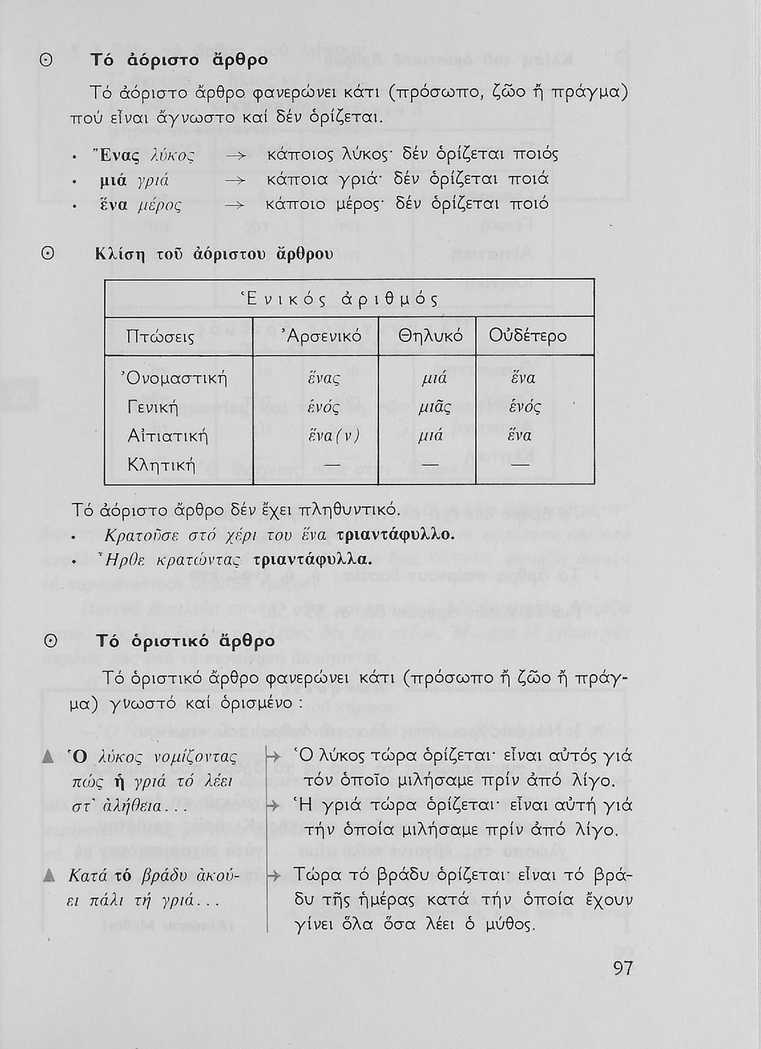 Σχολικό εγχειρίδιο της Ε΄ και ΣΤ΄ τάξης Δημοτικού για την γραμματική της ελληνικής γλώσσας με κανόνες και παραδείγματα. Στο επίμετρο υπάρχουν πίνακες με ανώμαλους σχηματισμούς ρημάτων.