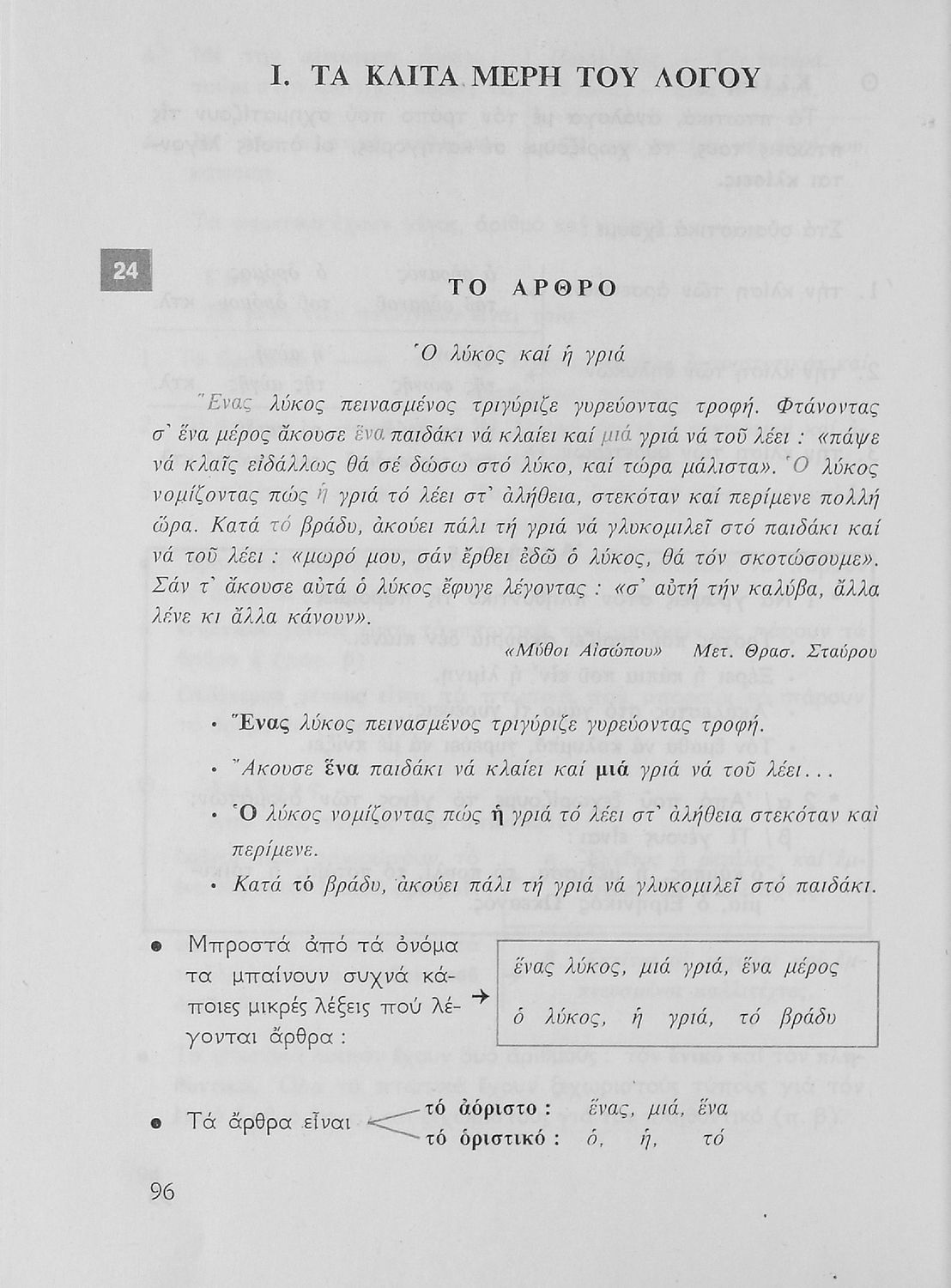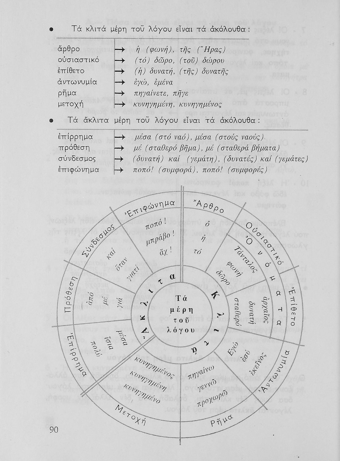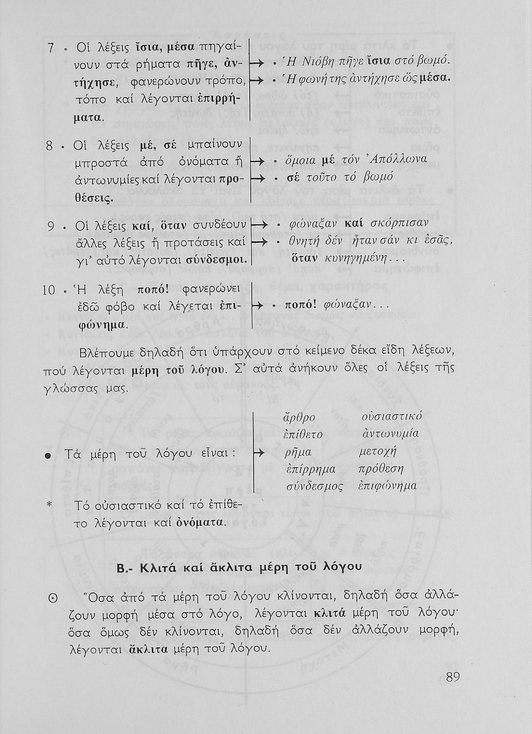 Σχολικό εγχειρίδιο για την Ε΄ και ΣΤ΄ τάξη Δημοτικού με γραμματικούς κανόνες και παραδείγματα για τα κλιτά και άκλιτα μέρη του λόγου.