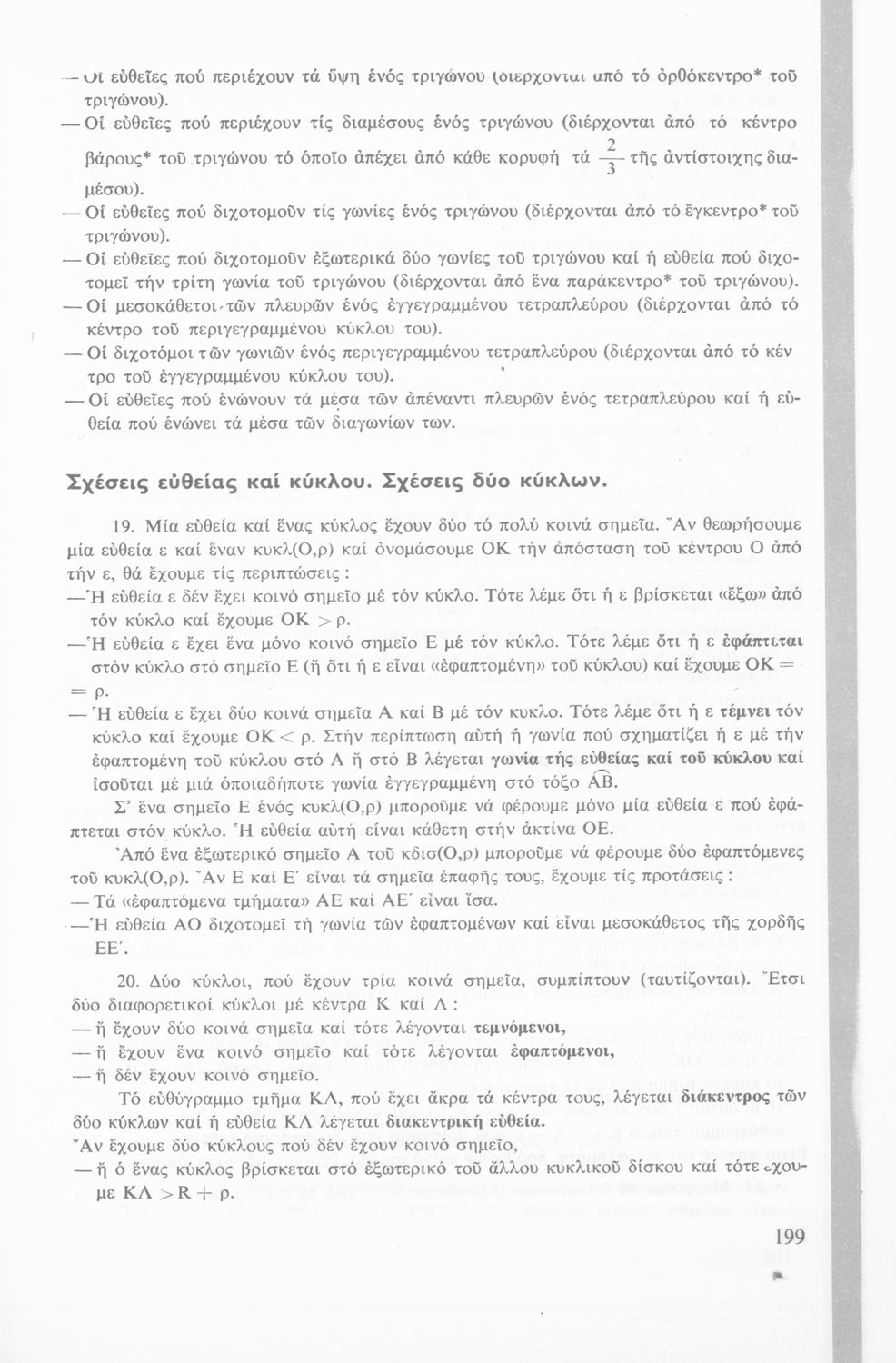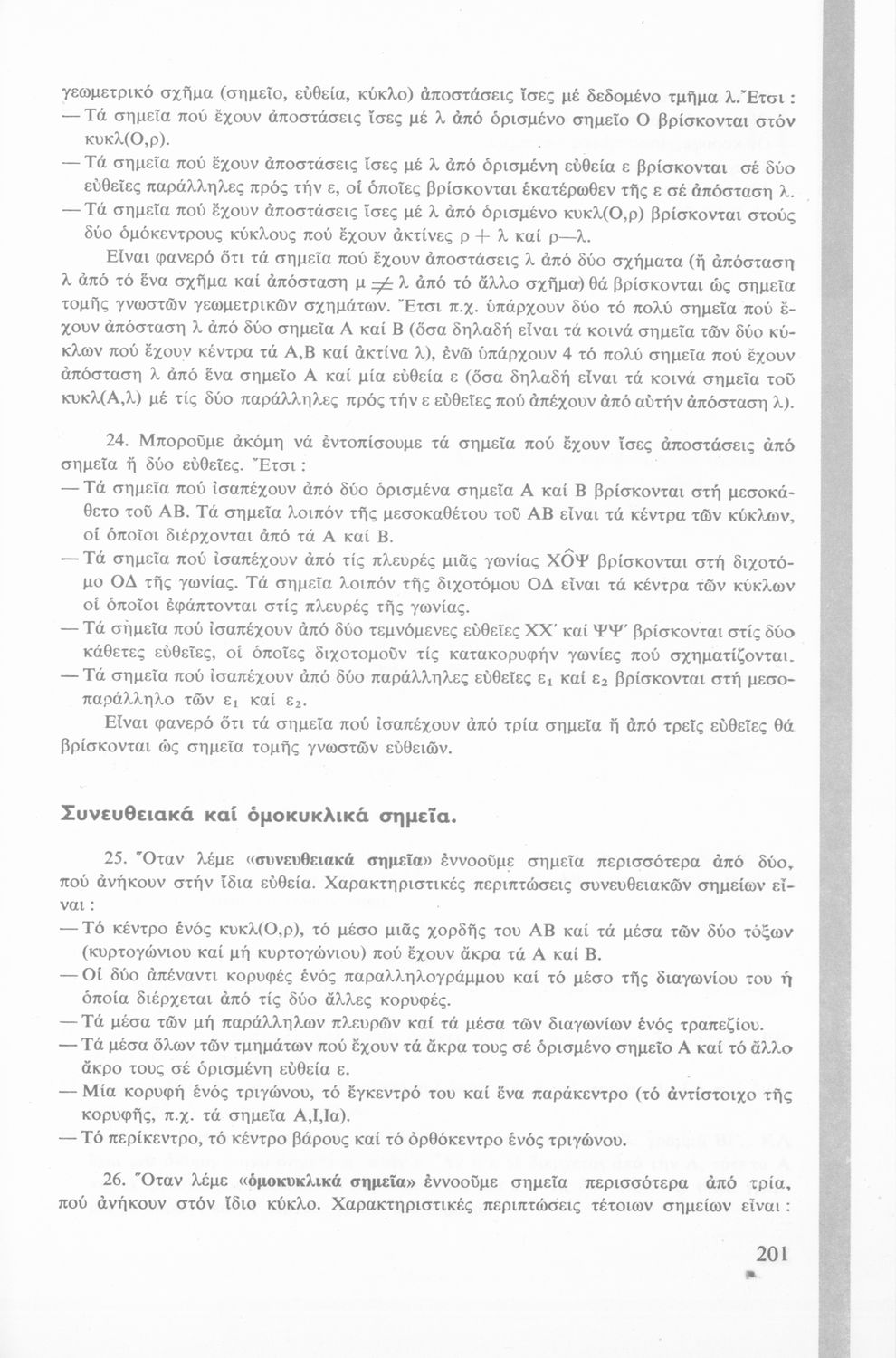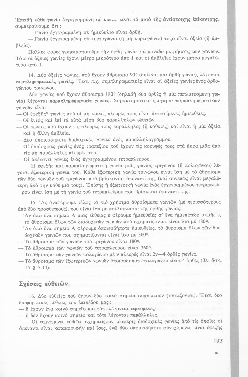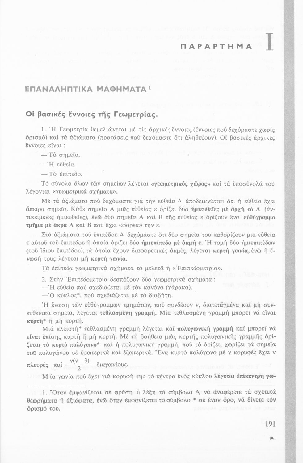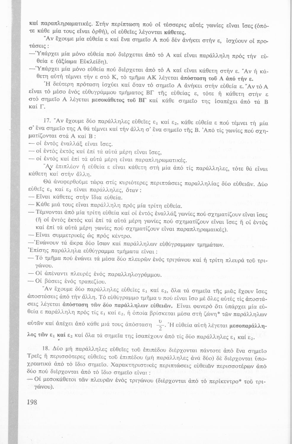 Σχολικό εγχειρίδιο Γεωμετρίας Α΄ Λυκείου χωρισμένο σε θεωρήματα, λυμένες ασκήσεις, ασκήσεις και επαναλήψεις κεφαλαίου. Περιέχει ένα παράρτημα με επαναληπτικά μαθήματα και ένα με ευρετήριο όρων.