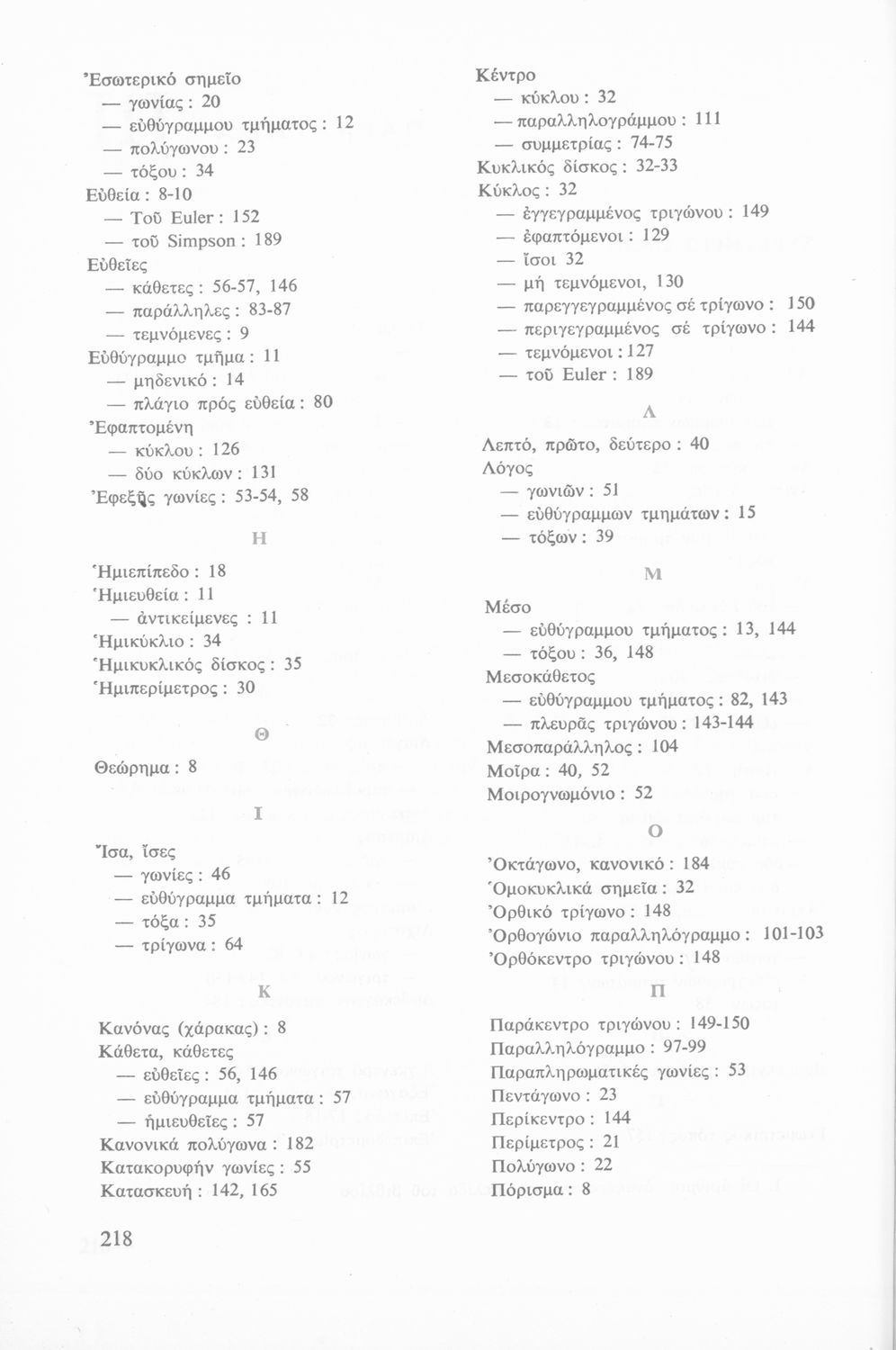 Σχολικό εγχειρίδιο Γεωμετρίας Α΄ Λυκείου χωρισμένο σε θεωρήματα, λυμένες ασκήσεις, ασκήσεις και επαναλήψεις κεφαλαίου. Περιέχει ένα παράρτημα με επαναληπτικά μαθήματα και ένα με ευρετήριο όρων.