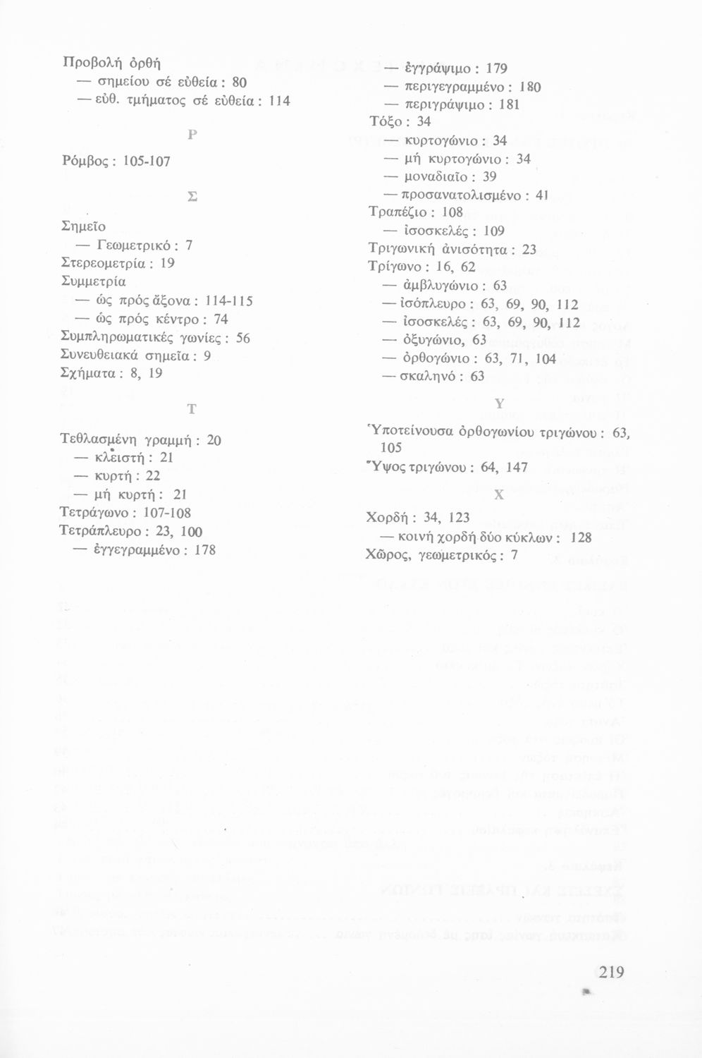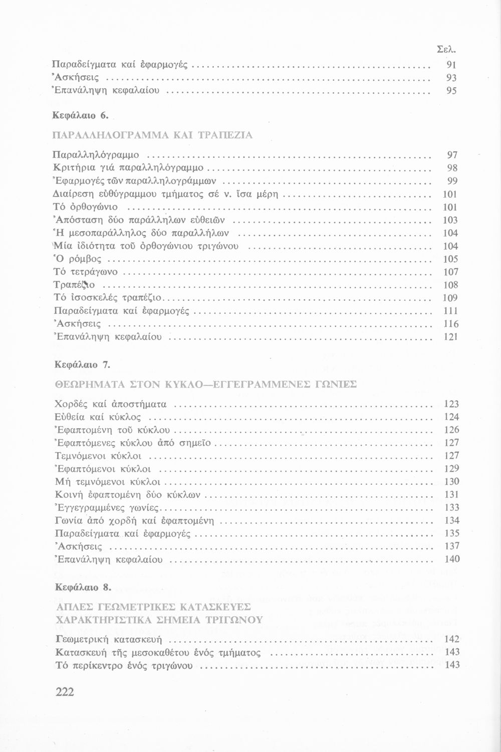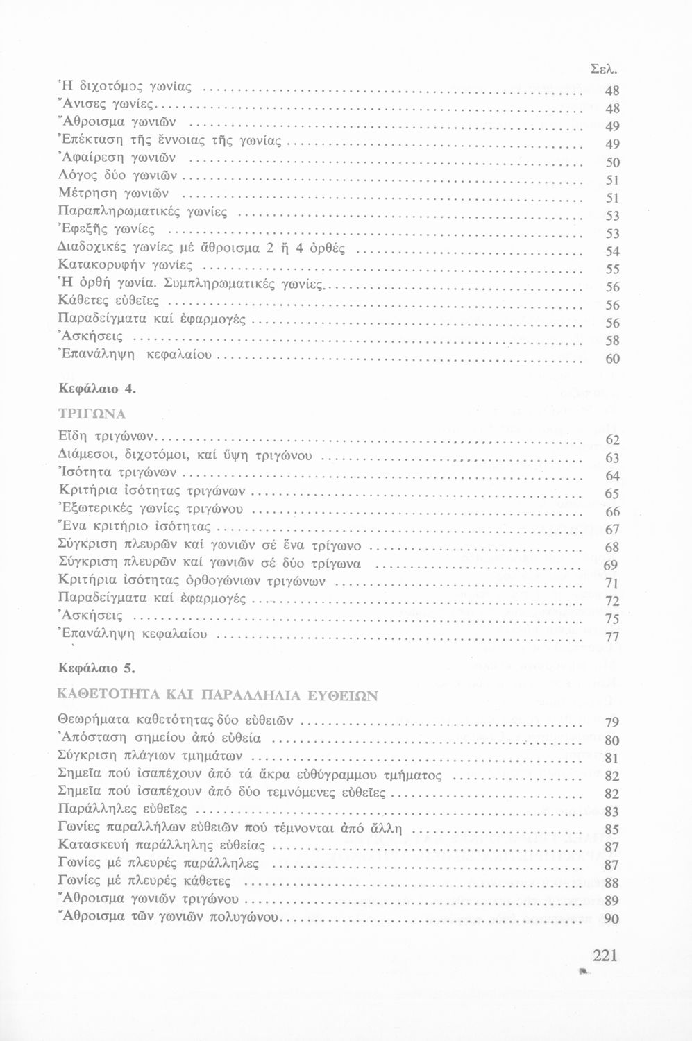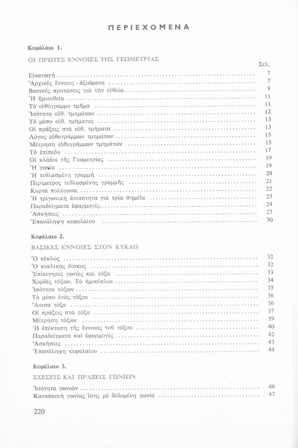 Σχολικό εγχειρίδιο Γεωμετρίας Α΄ Λυκείου χωρισμένο σε θεωρήματα, λυμένες ασκήσεις, ασκήσεις και επαναλήψεις κεφαλαίου. Περιέχει ένα παράρτημα με επαναληπτικά μαθήματα και ένα με ευρετήριο όρων.