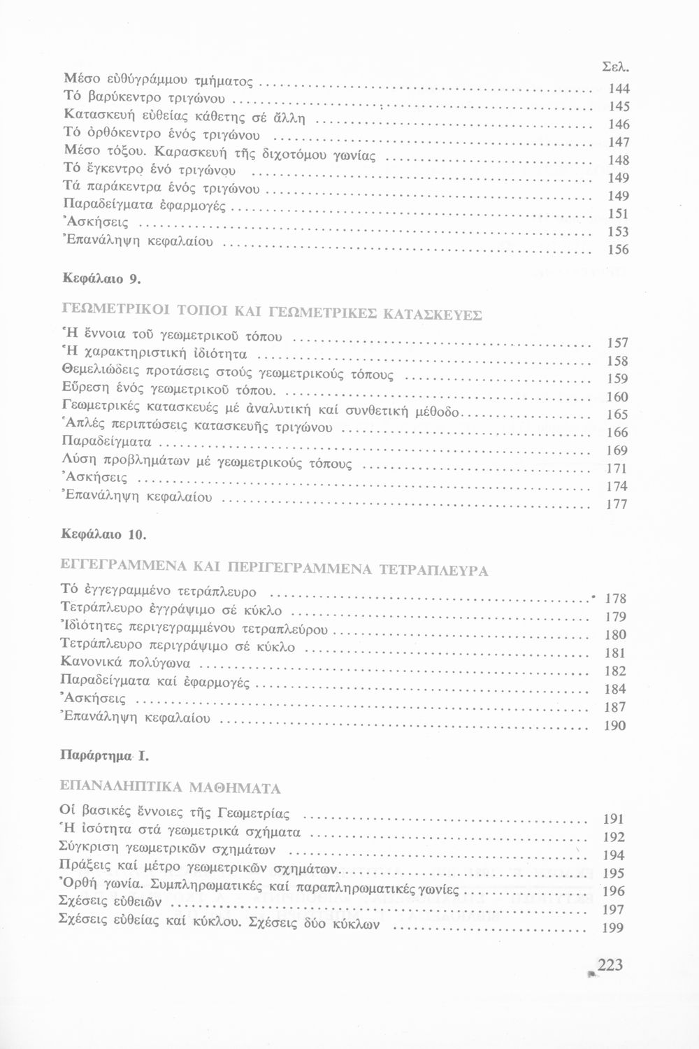Σχολικό εγχειρίδιο Γεωμετρίας Γ΄ Γυμνασίου χωρισμένο σε θεωρήματα, λυμένες ασκήσεις, ασκήσεις και επαναλήψεις κεφαλαίου. Περιέχει ένα παράρτημα με επαναληπτικά μαθήματα και ένα με ευρετήριο όρων.