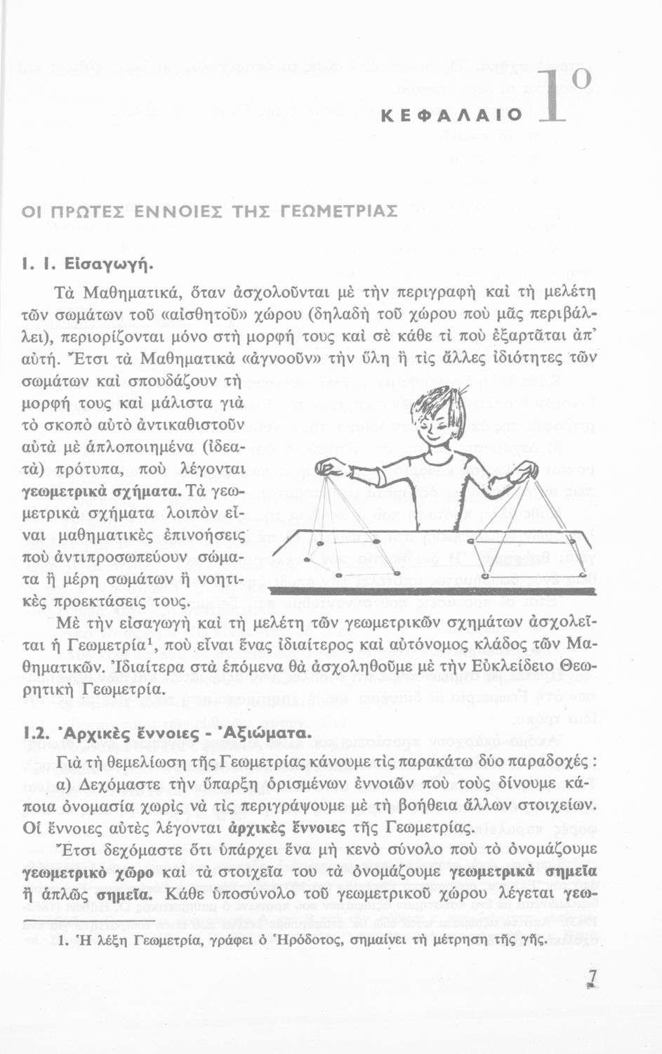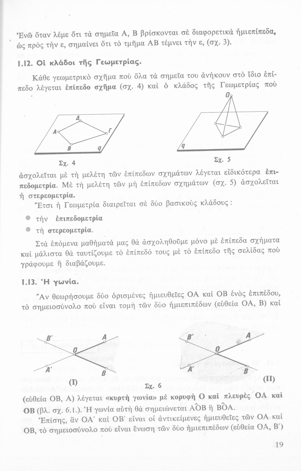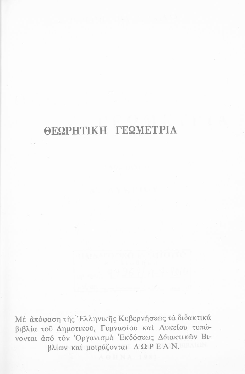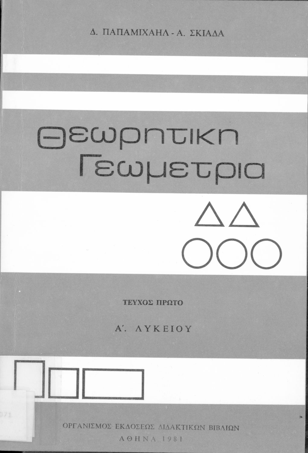 Σχολικό εγχειρίδιο Γεωμετρίας Α΄ Λυκείου χωρισμένο σε θεωρήματα, λυμένες ασκήσεις, ασκήσεις και επαναλήψεις κεφαλαίου. Περιέχει ένα παράρτημα με επαναληπτικά μαθήματα και ένα με ευρετήριο όρων.