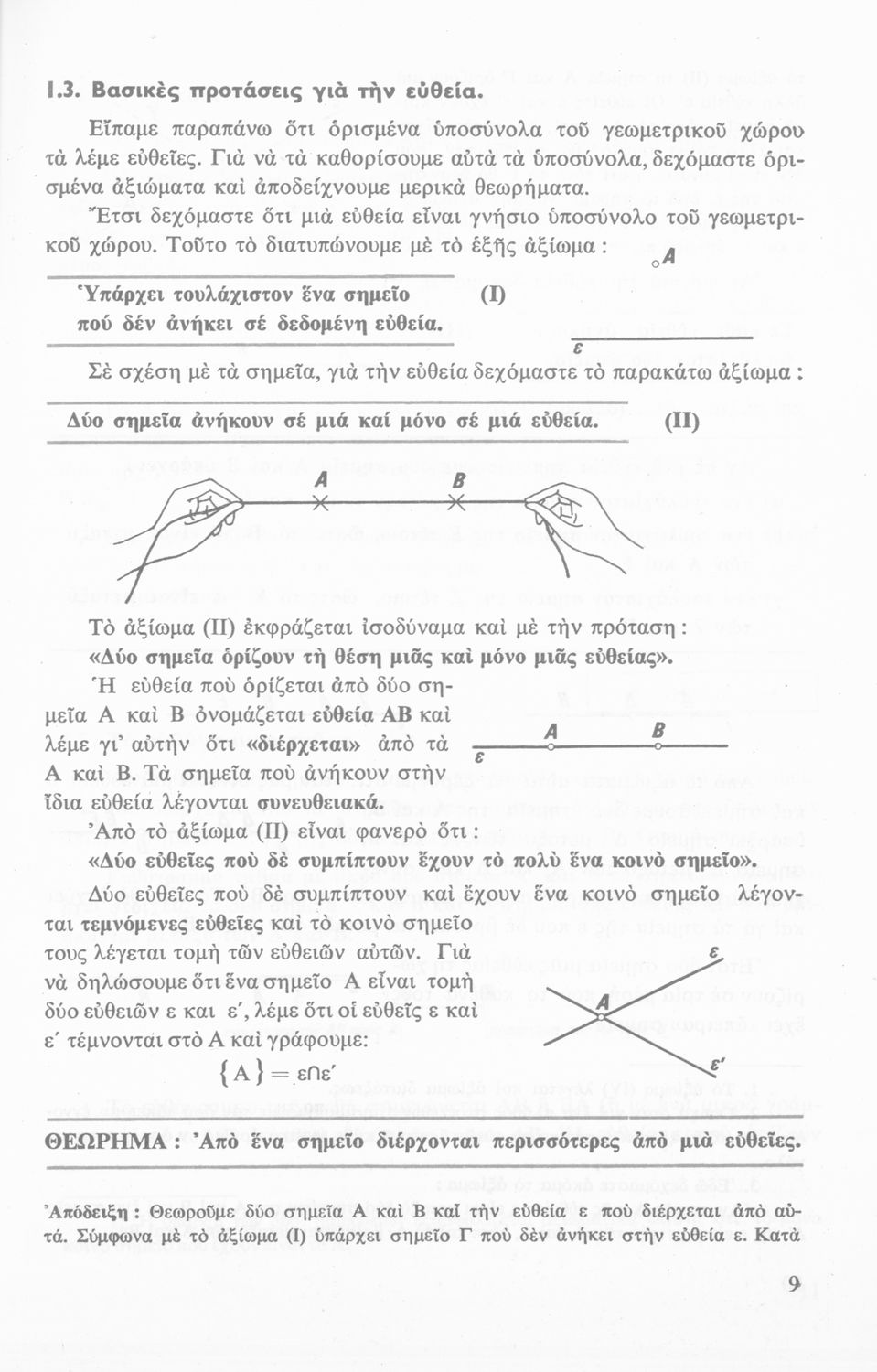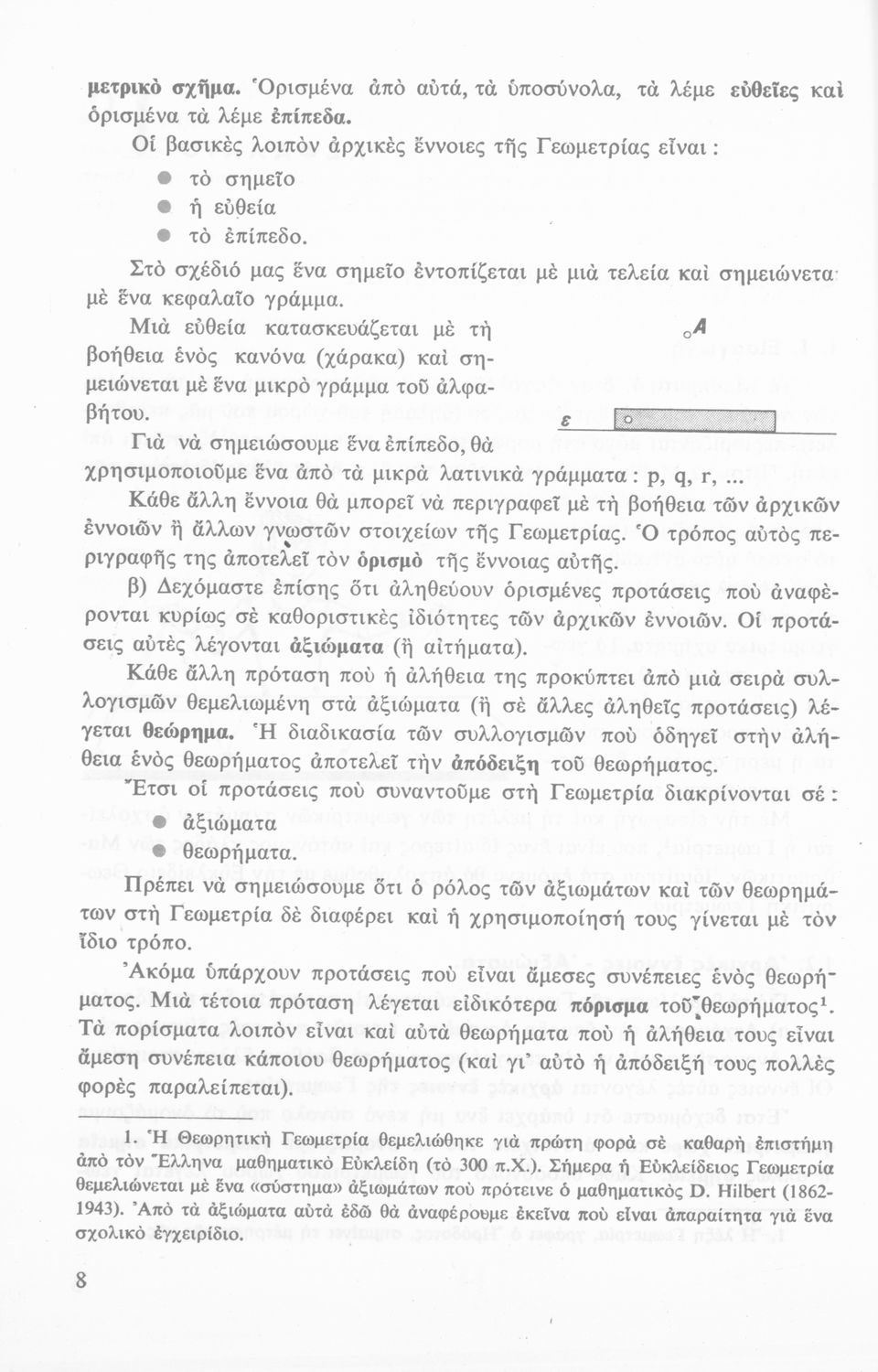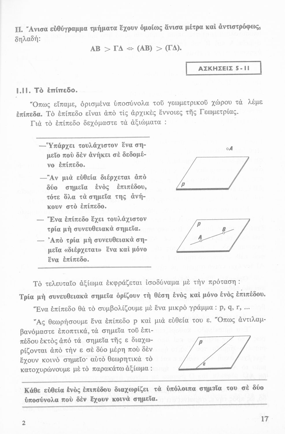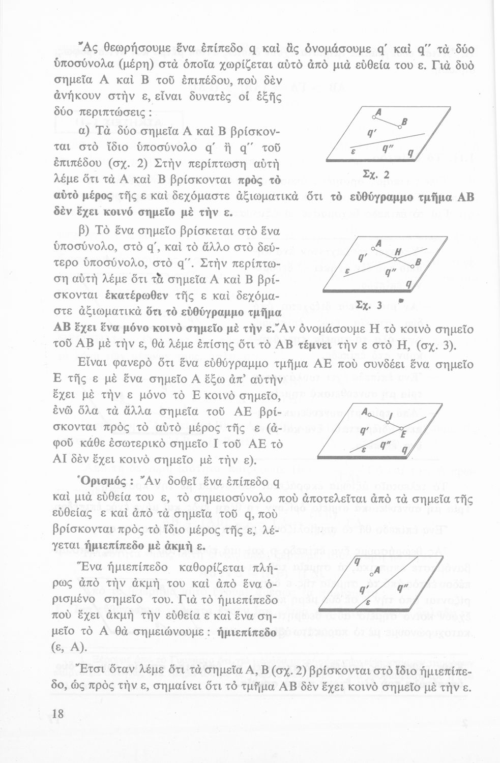 Σχολικό εγχειρίδιο Γεωμετρίας Α΄ Λυκείου χωρισμένο σε θεωρήματα, λυμένες ασκήσεις, ασκήσεις και επαναλήψεις κεφαλαίου. Περιέχει ένα παράρτημα με επαναληπτικά μαθήματα και ένα με ευρετήριο όρων.