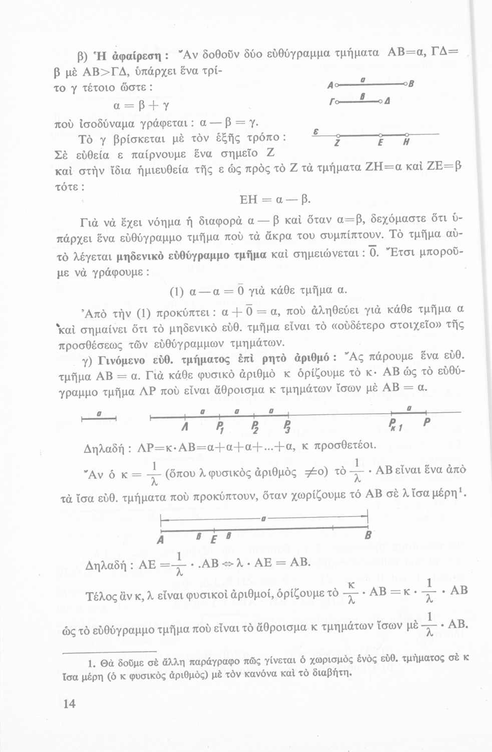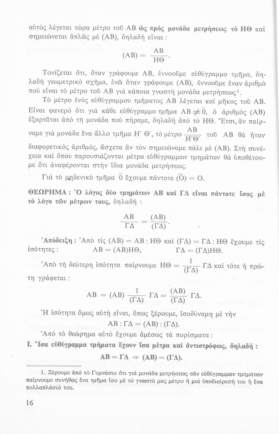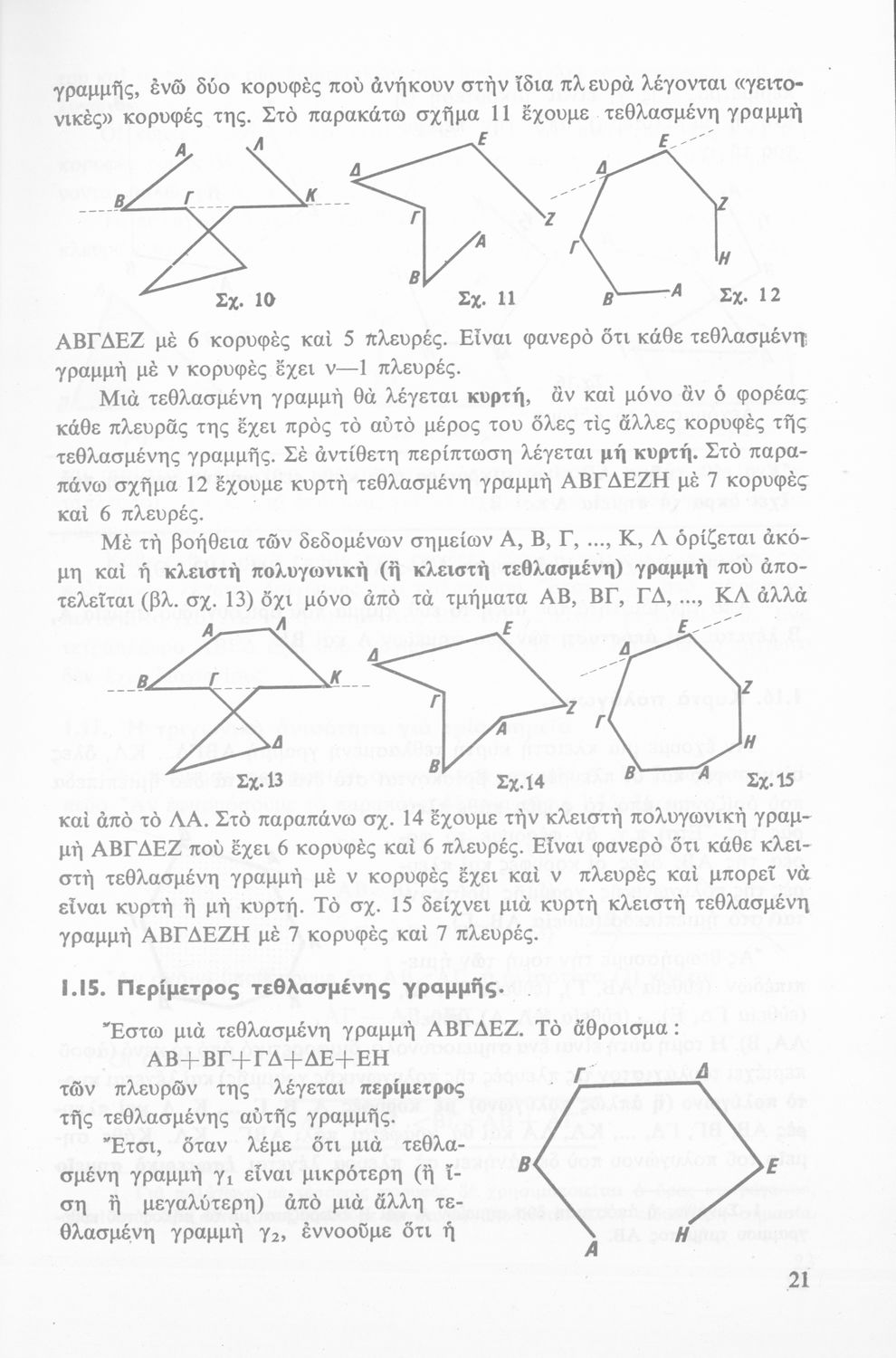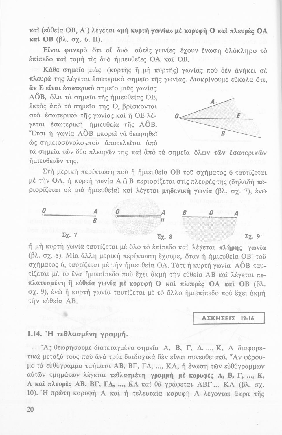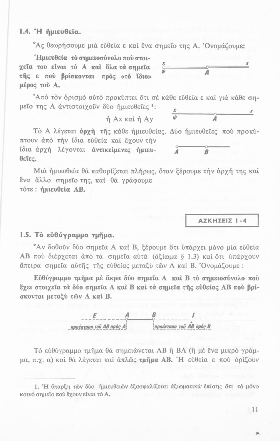 Σχολικό εγχειρίδιο Γεωμετρίας Α΄ Λυκείου χωρισμένο σε θεωρήματα, λυμένες ασκήσεις, ασκήσεις και επαναλήψεις κεφαλαίου. Περιέχει ένα παράρτημα με επαναληπτικά μαθήματα και ένα με ευρετήριο όρων.