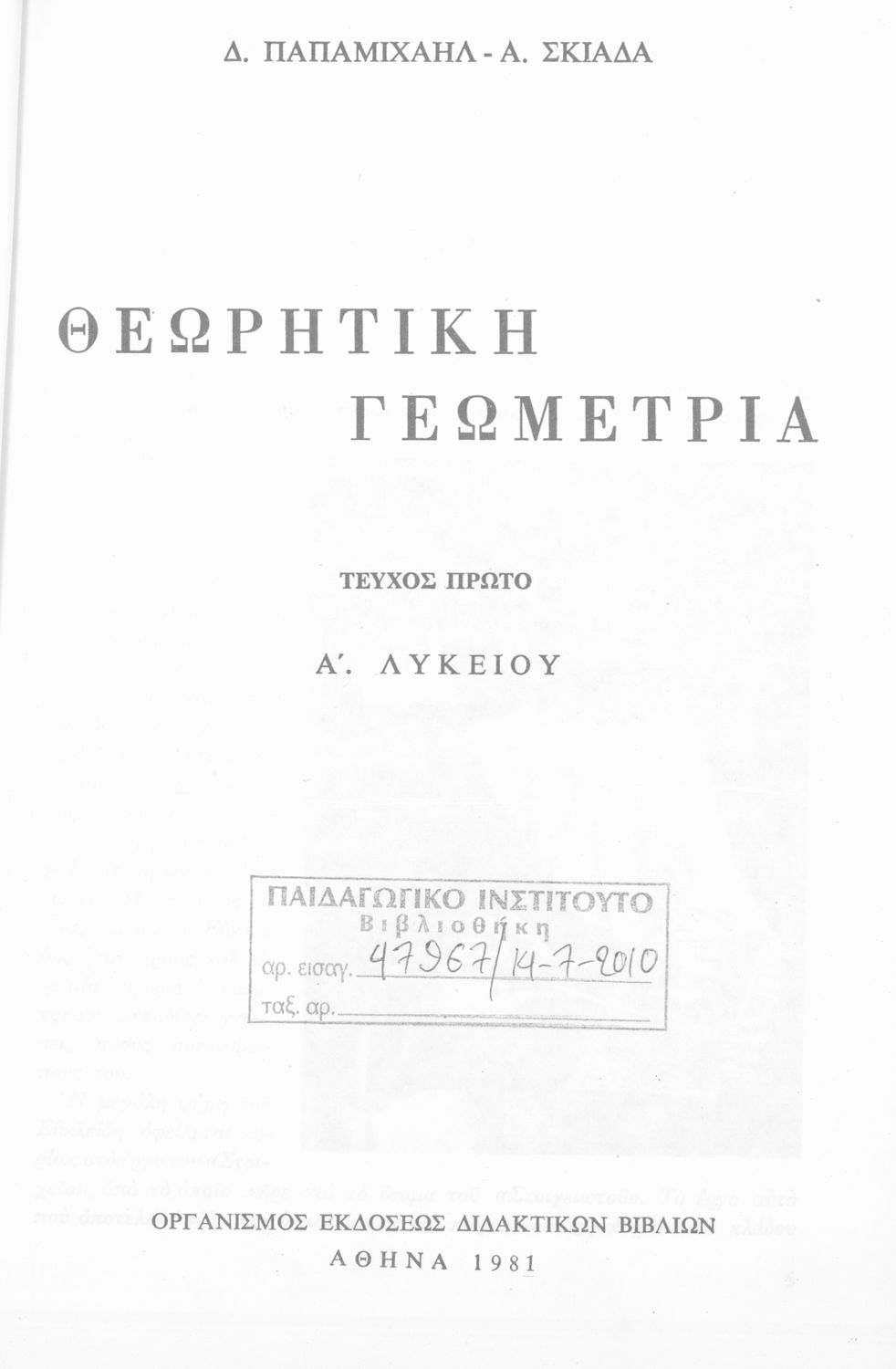 Κωδικός αναγνώρισης: 01-47967 Τίτλος: Θεωρητική γεωμετρία Α΄ Λυκείου, τεύχος Α΄ Συγγραφέας: Δημήτριος Κ. Παπαμιχαήλ, Α. Σκιαδάς Μέγεθος και υπόστρωμα: Σχολικό εγχειρίδιο, 23εκ., μαλακό εξώφυλλο, 224 σελίδες. |