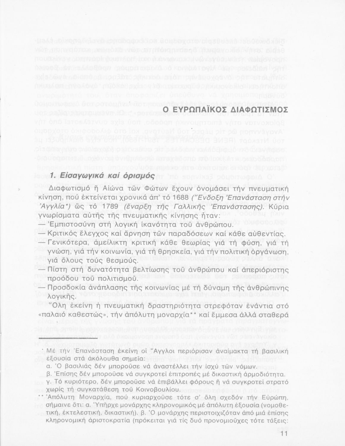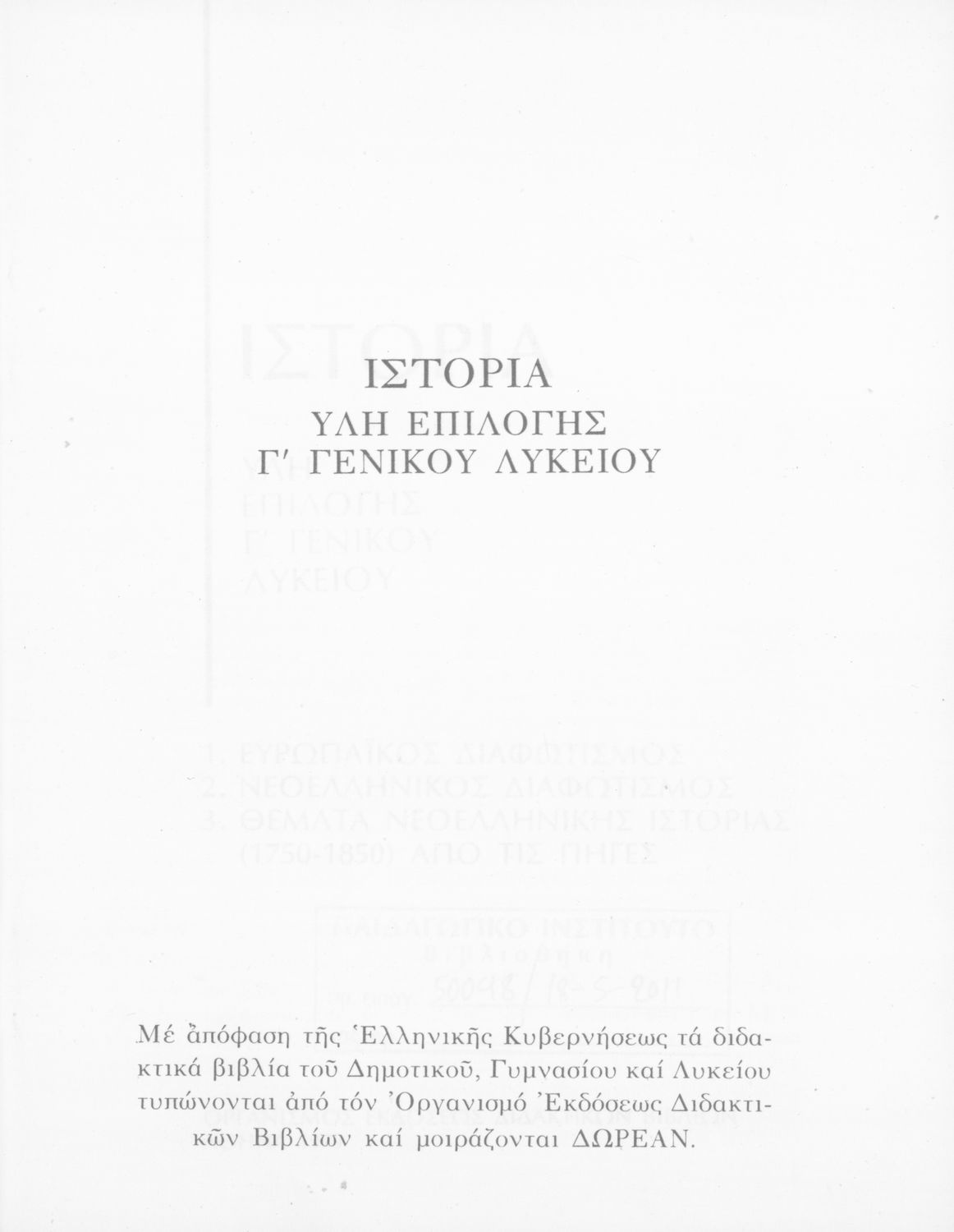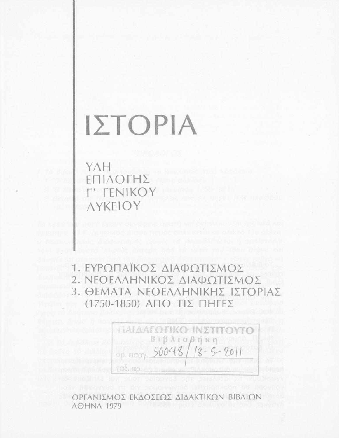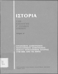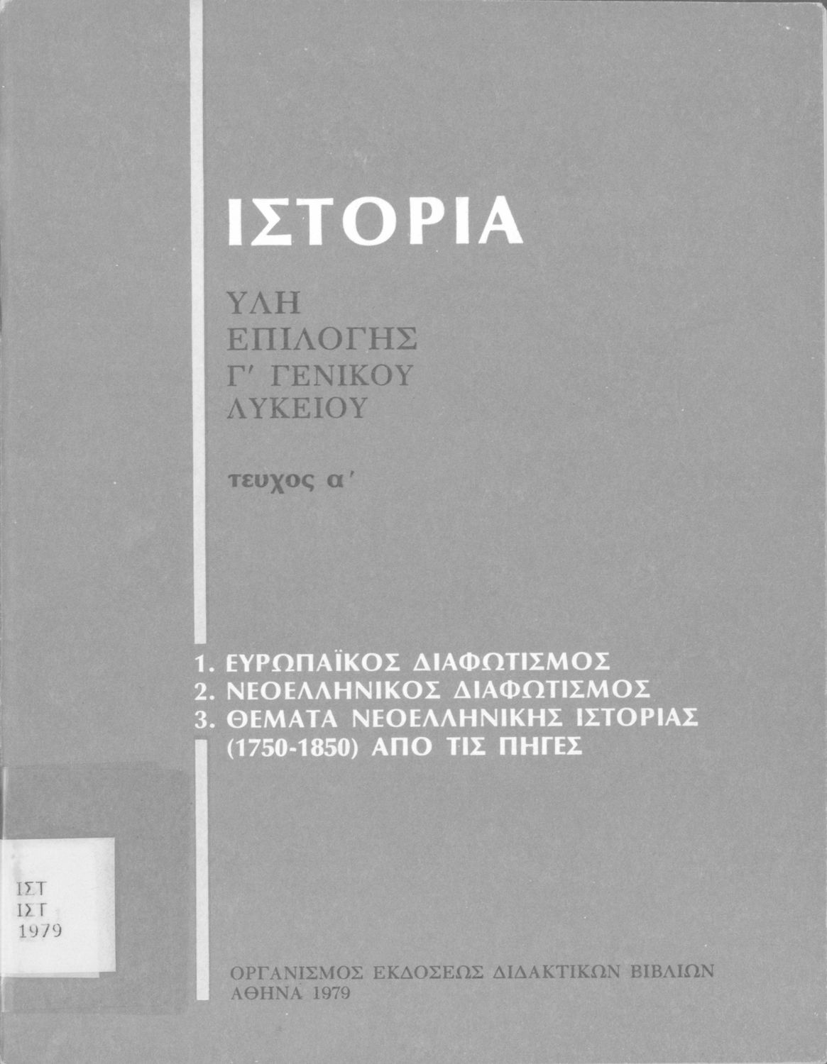 Σχολικό εγχειρίδιο Ιστορίας Γ΄ Λυκείου που πραγματεύεται τον ευρωπαϊκό διαφωτισμό, νεοελληνικό διαφωτισμό και θέματα νεοελληνικής ιστορίας (1750-1850) από πηγές.
