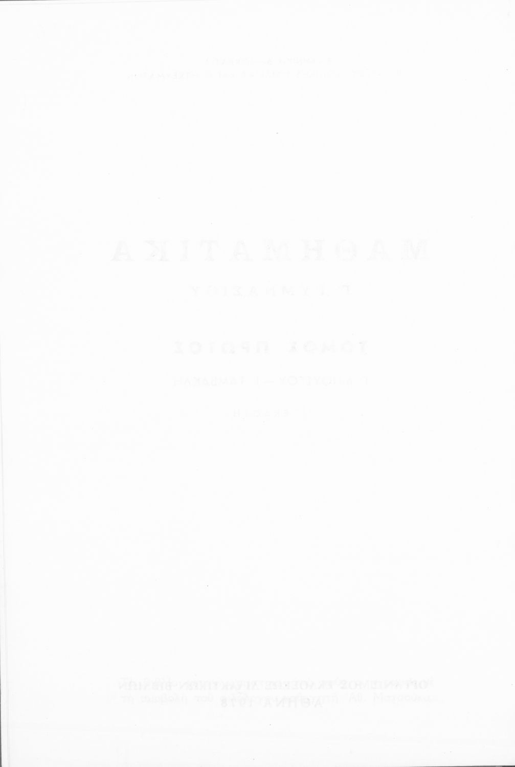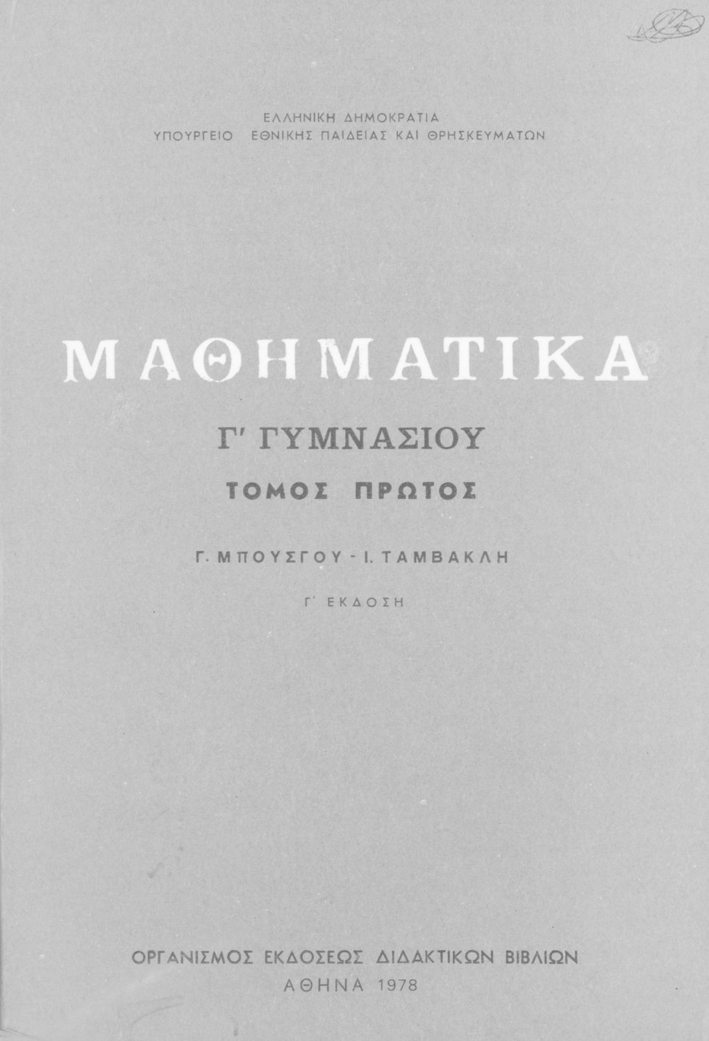 Κωδικός αναγνώρισης: 01-50216 Τίτλος: Μαθηματικά Γ΄ Γυμνασίου, τόμος Α΄ Συγγραφέας: Γ. Μπούσγος, Ι. Ταμβακλής Μέγεθος και υπόστρωμα: Σχολικό εγχειρίδιο, 22εκ., μαλακό εξώφυλλο, 219 σελίδες. Σκίτσα (ασπρόμαυρα). |