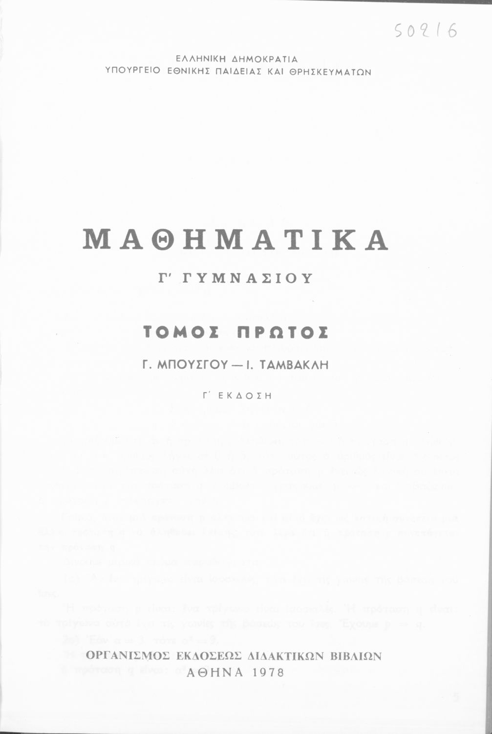 LDR 01326 2200217 4500 035 ## _a01-50216 040 ## _aΙνστιτούτο Εκπαιδευτικής Πολιτικής 041 ## _ael 100 ## _aΓ. Μπούσγος _aΙ. Ταμβακλής 110 ## _a50216 245 0# _aΜαθηματικά Γ΄ Γυμνασίου, τόμος Α΄ 250 ## _a10η Έκδοση 260 ## _aΑθήνα _bΟργανισμός Εκδόσεως Διδακτικών Βιβλίων _c1978 300 ## _a219 _bΣκίτσα (ασπρόμαυρα) _c22 520 ## _aΣχολικό εγχειρίδιο Μαθηματικών Γ΄ Γυμνασίου που περιέχει θεωρία, παραδείγματα και ασκήσεις και περιλαμβάνει Άλγεβρα, Τριγωνομετρία και στοιχεία Περιγραφικής Στατιστικής. Το εγχειρίδιο μεταγλωττίστηκε από τον συγγραφέα και τον Αθ. Ματσούκα. 521 ## _aΓ' Γυμνασίου 522 ## _aΕλλάδα 546 ## _aΔημοτική 563 ## _aΜαλακό Εξώφυλλο 583 ## _a3032/8-3-1978 _c1978 650 #4 _aΑλγεβρικές παραστάσεις _aΕξισώσεις _aΗμίτονο _aΣτατιστικά δεδομένα _aΣυνημίτονο