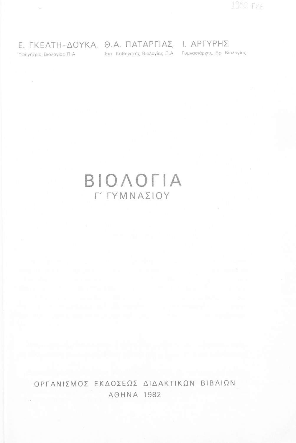 Κωδικός αναγνώρισης: 02-00273 Τίτλος: Βιολογία Γ΄ Γυμνασίου Συγγραφέας: Ε. Γκέλτη-Δούκα, Θ.Α. Παταργιάς, Ι. Αργύρης Μέγεθος και υπόστρωμα: Σχολικό εγχειρίδιο, μαλακό εξώφυλλο, 152 σελίδες. Εικόνες (ασπρόμαυρες), σκίτσα (ασπρόμαυρα), εικόνες (έγχρωμες). |