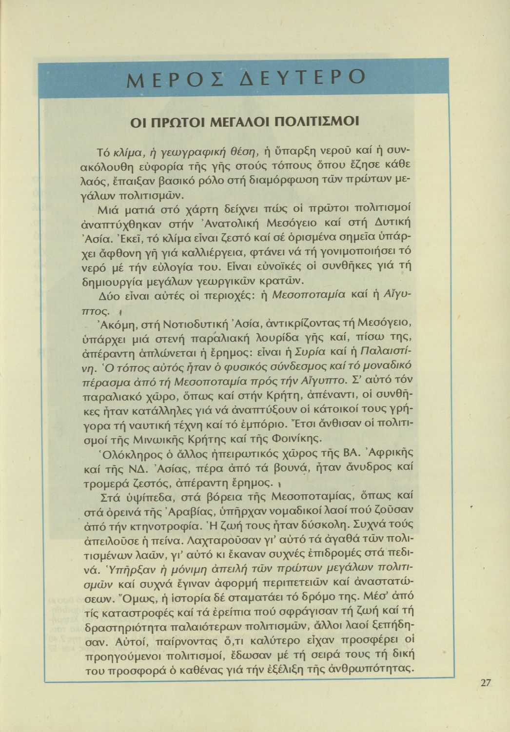 Σχολικό εγχειρίδιο Ιστορίας Α΄ Γυμνασίου που καλύπτει την περίοδο από την περίοδο από την εμφάνιση των πρώτων πολιτισμών μέχρι τους Καρχηδονικούς Πολέμους. Περιλαμβάνει χρονολόγιο και γλωσσάριο με επεξήγηση ορισμών.