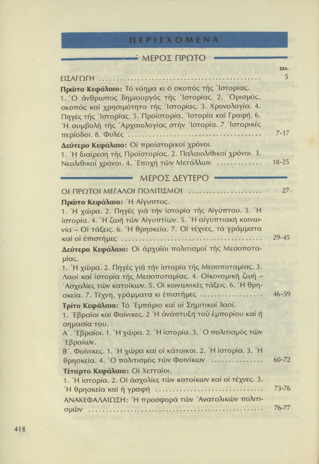 Σχολικό εγχειρίδιο Ιστορίας Α΄ Γυμνασίου και Α΄ Λυκείου που καλύπτει την περίοδο από την περίοδο από την εμφάνιση των πρώτων πολιτισμών μέχρι τους Καρχηδονικούς Πολέμους. Περιλαμβάνει χρονολόγιο και γλωσσάριο ...