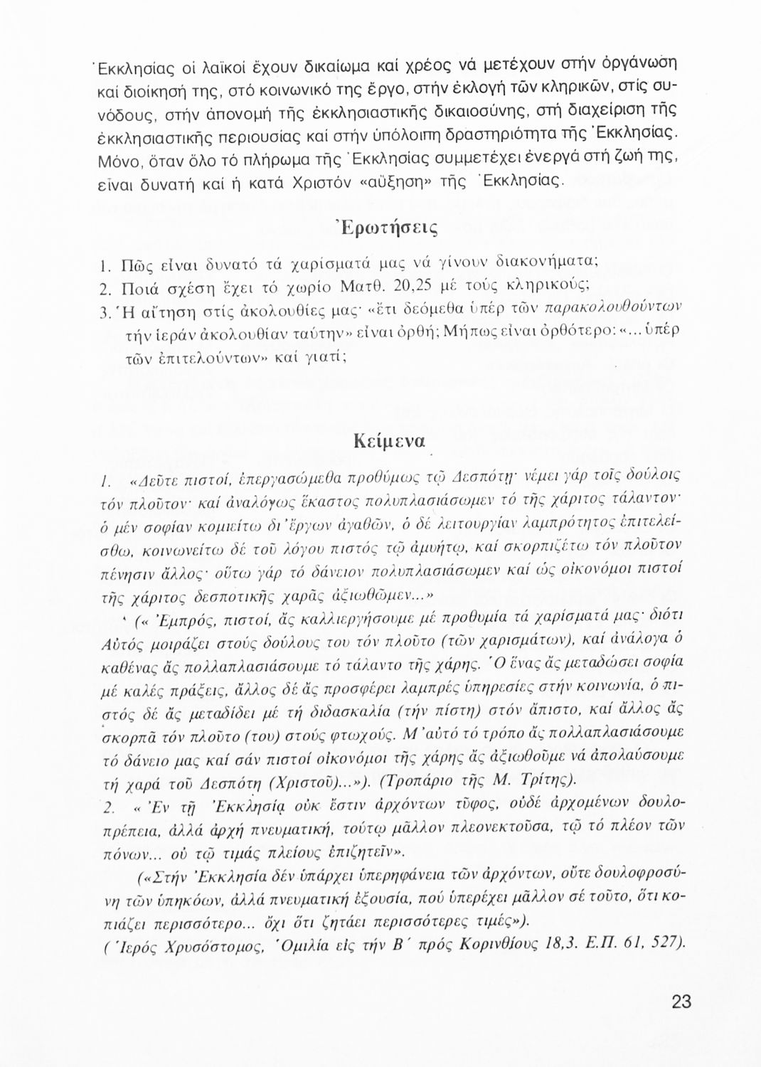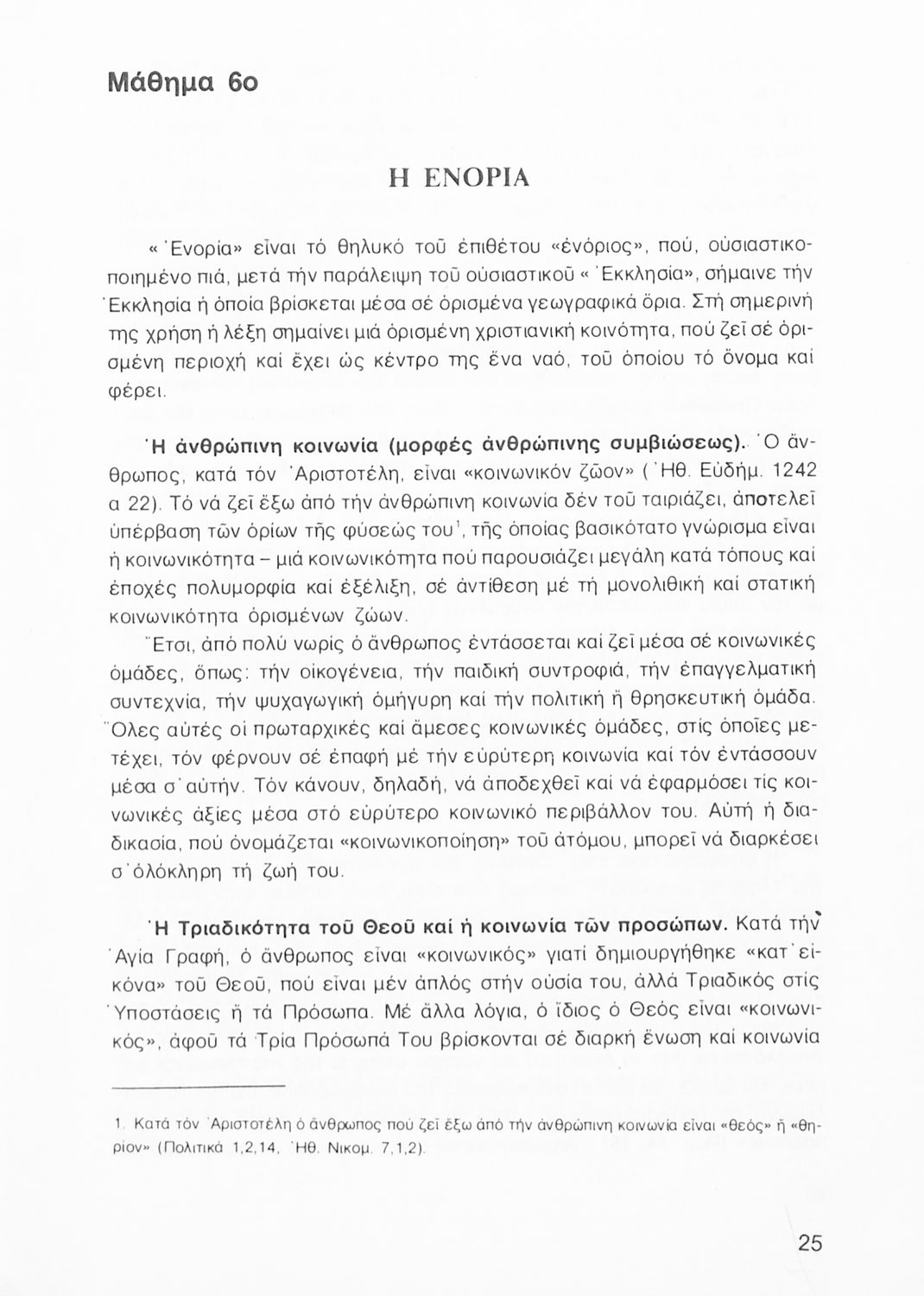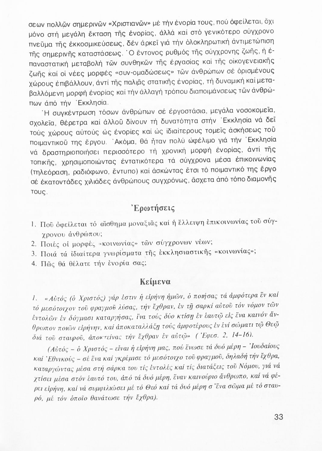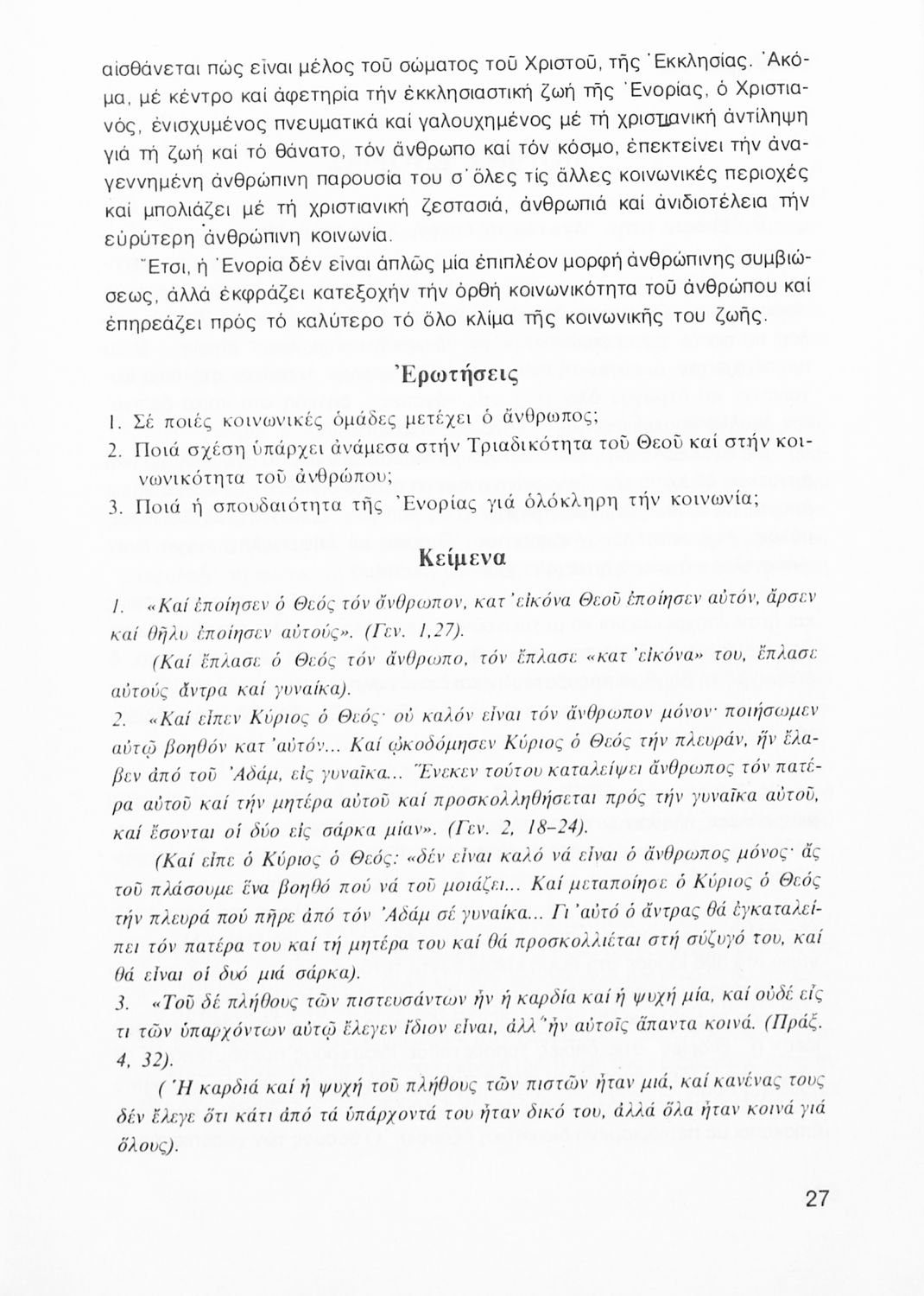 Σχολικό εγχειρίδιο Θρησκευτικών Α΄ Λυκείου που πραγματεύεται εκκλησιολογικά ζητήματα όπως η δομή και η οργάνωση της εκκλησίας και η σχέση της με άλλα δόγματα και αιρέσεις Περιέχει και στοιχεία για την κοινωνική δράση της Εκκλησίας και για τις μορφές της χριστιανικής τέχνης και αναλύει φαινόμενα όπως ο ασκητισμός και ο μοναχισμός.