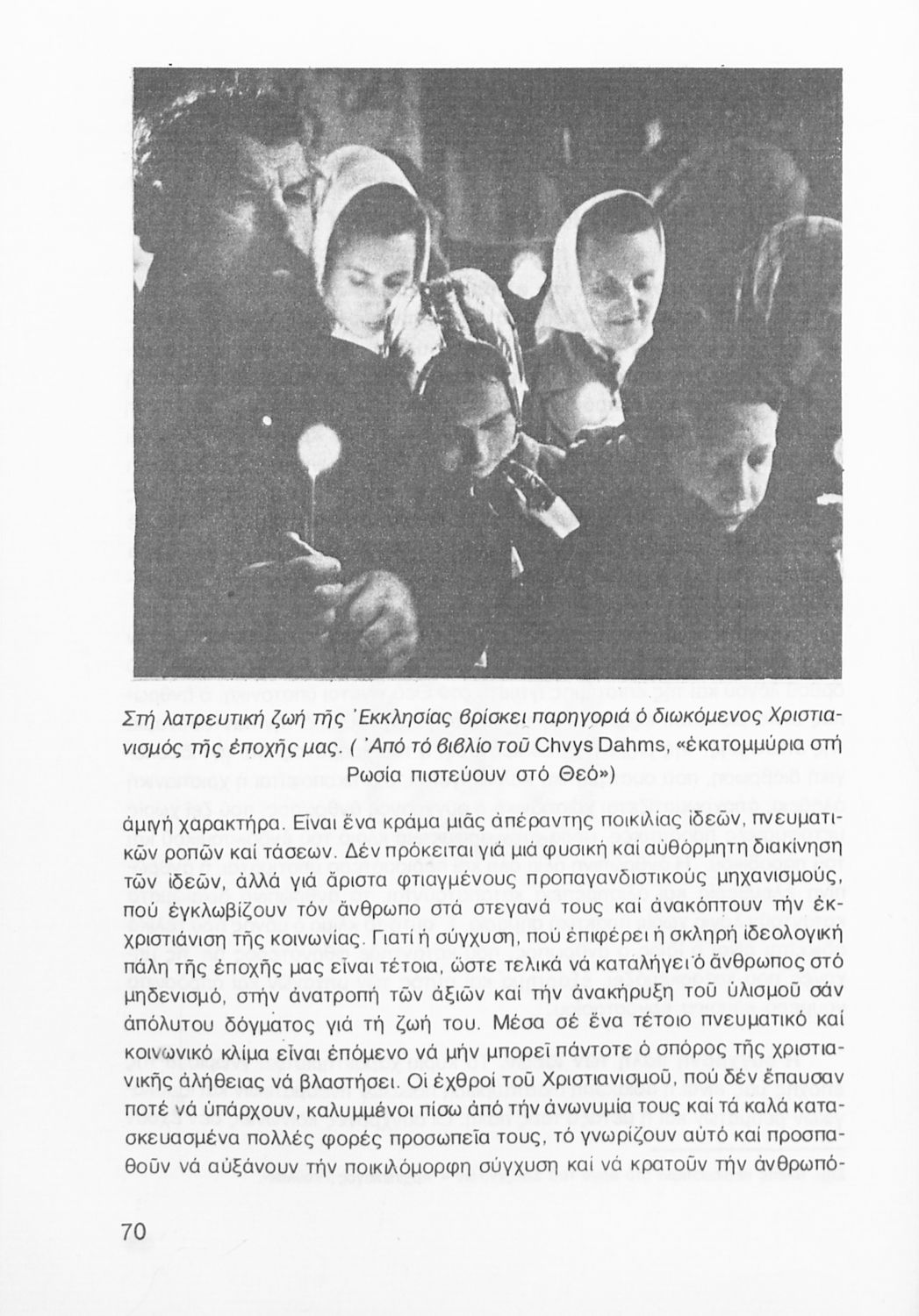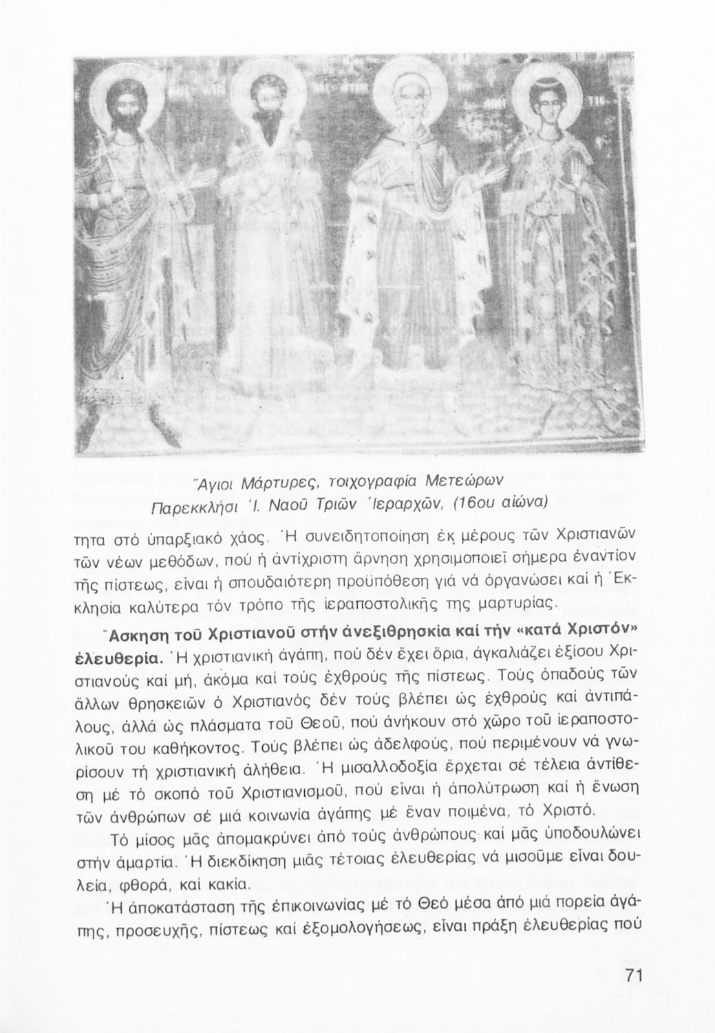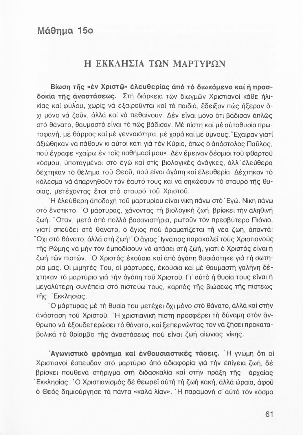 Σχολικό εγχειρίδιο Θρησκευτικών Α΄ Λυκείου που πραγματεύεται εκκλησιολογικά ζητήματα όπως η δομή και η οργάνωση της εκκλησίας και η σχέση της με άλλα δόγματα και αιρέσεις Περιέχει και στοιχεία για την κοινωνική δράση της Εκκλησίας και για τις μορφές της χριστιανικής τέχνης και αναλύει φαινόμενα όπως ο ασκητισμός και ο μοναχισμός.