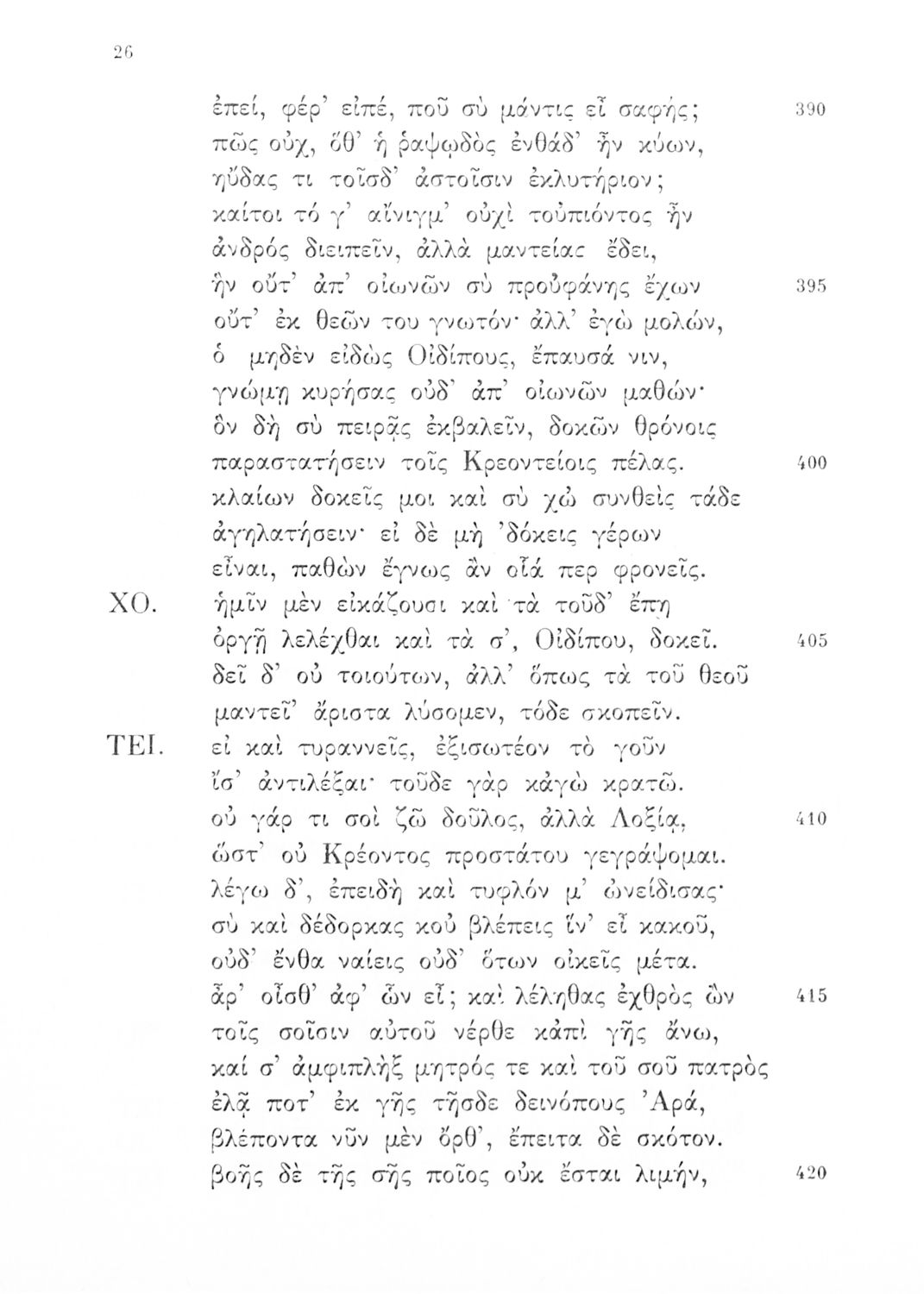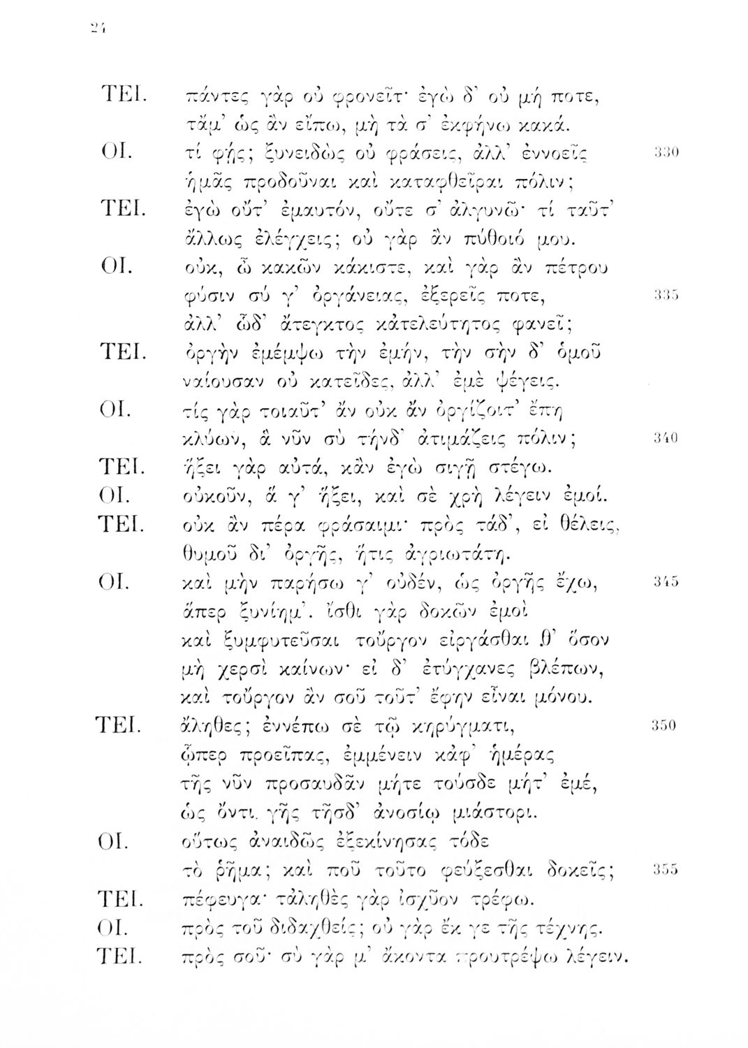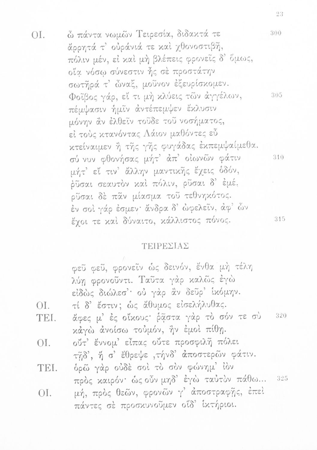 Σχολικό εγχειρίδιο Αρχαίων Ελληνικών της Γ΄ Λυκείου το οποίο περιλαμβάνει το έργο του Σοφοκλή 'Οιδίπους Τύραννος'. Το βιβλίο ξεκινάει με μια εισαγωγή στην αρχαία ελληνική τραγωδία και βιογραφικά στοιχεία του Σοφοκλή. Στη συνέχεια παρουσιάζει το εν λόγω κείμενο το οποίο συνοδεύεται από ερμηνευτικές και γλωσσικές σημειώσεις.