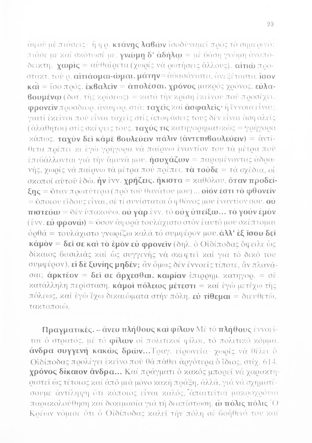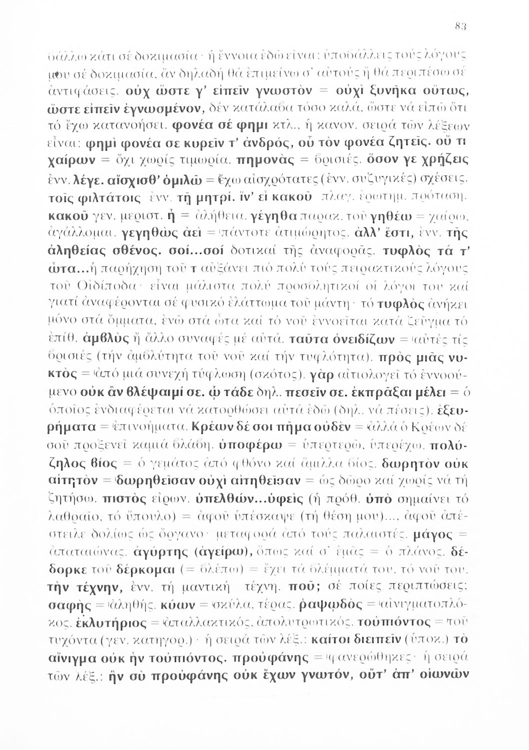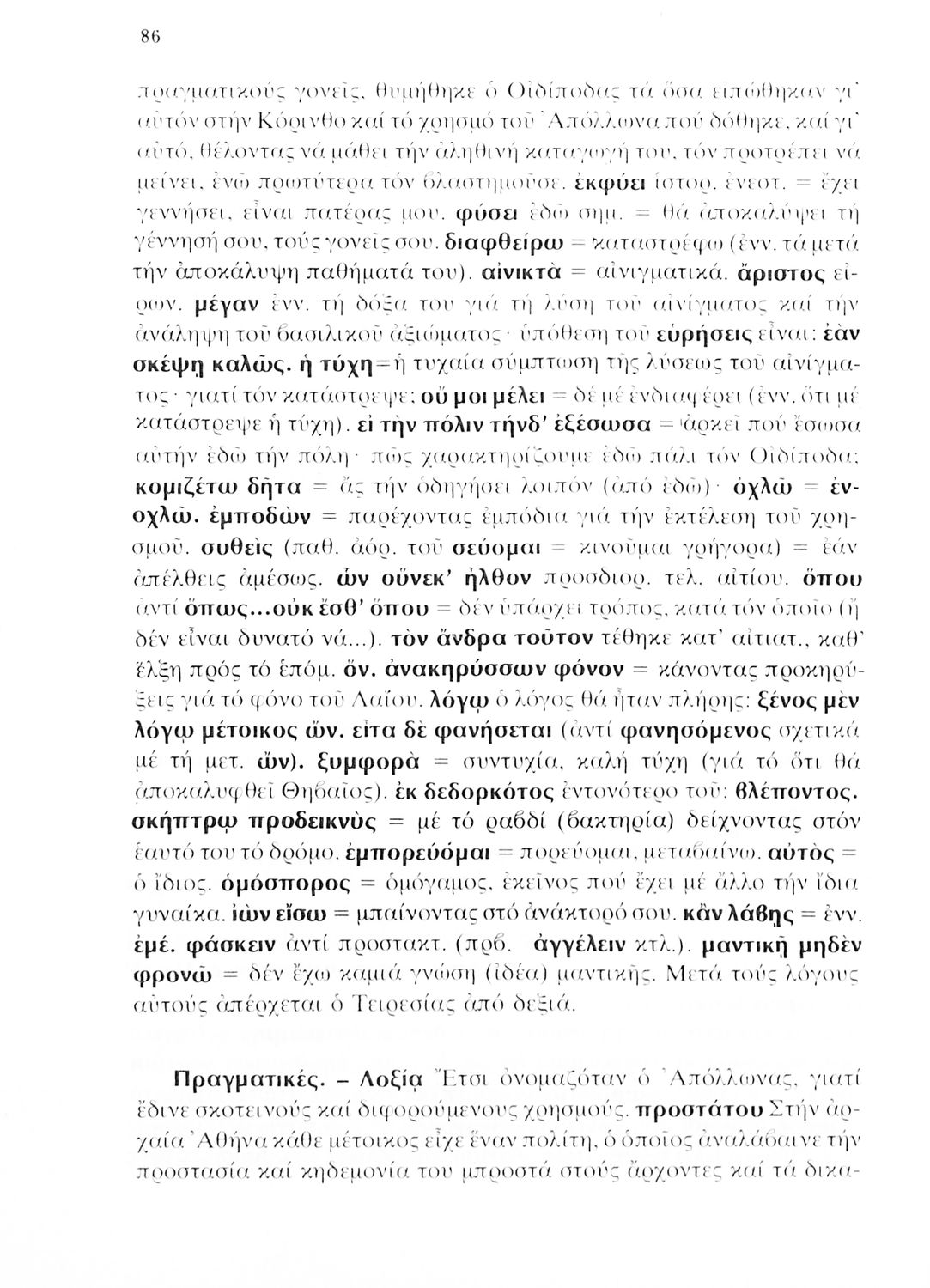 Σχολικό εγχειρίδιο Αρχαίων Ελληνικών της Γ΄ Λυκείου το οποίο περιλαμβάνει το έργο του Σοφοκλή 'Οιδίπους Τύραννος'. Το βιβλίο ξεκινάει με μια εισαγωγή στην αρχαία ελληνική τραγωδία και βιογραφικά στοιχεία του Σοφοκλή. Στη συνέχεια παρουσιάζει το εν λόγω κείμενο το οποίο συνοδεύεται από ερμηνευτικές και γλωσσικές σημειώσεις.