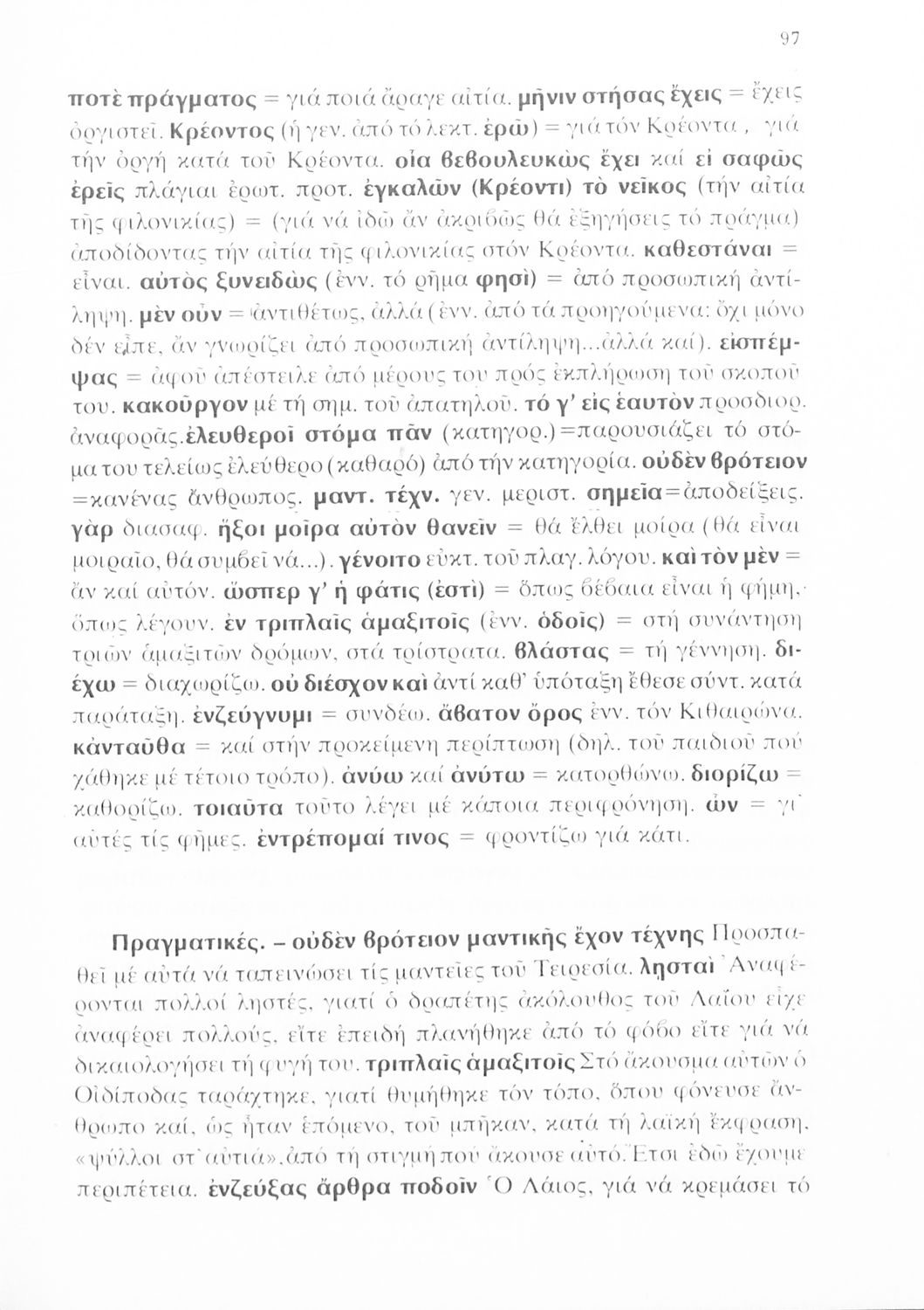 Σχολικό εγχειρίδιο Αρχαίων Ελληνικών για τη Γ΄ Λυκείου με πρωτότυπο κείμενο του Σοφοκλή. Το βιβλίο περιλαμβάνει εισαγωγή και ερμηνευτικές σημειώσεις στη Δημοτική. Σχόλια μαθητή στα περιθώρια.