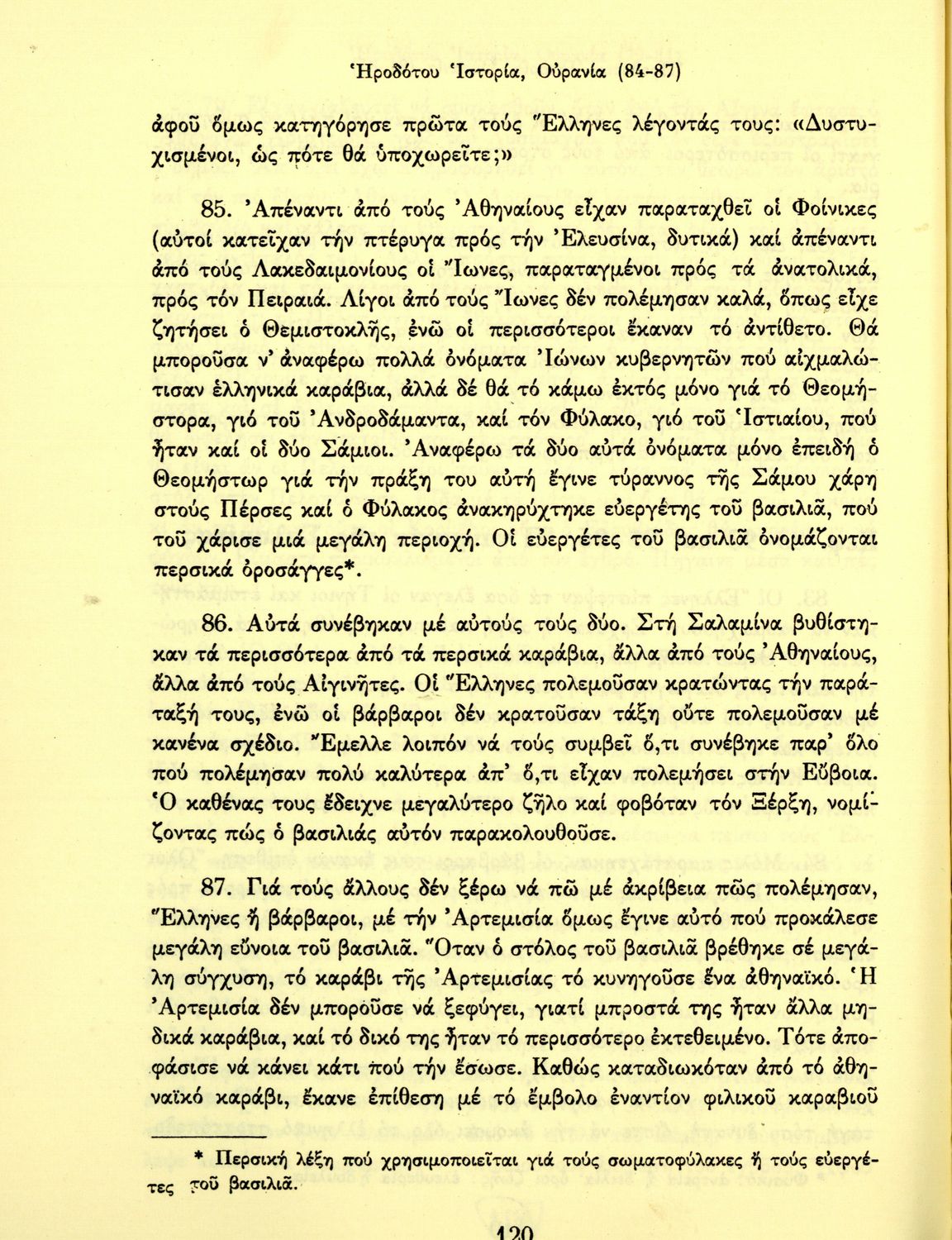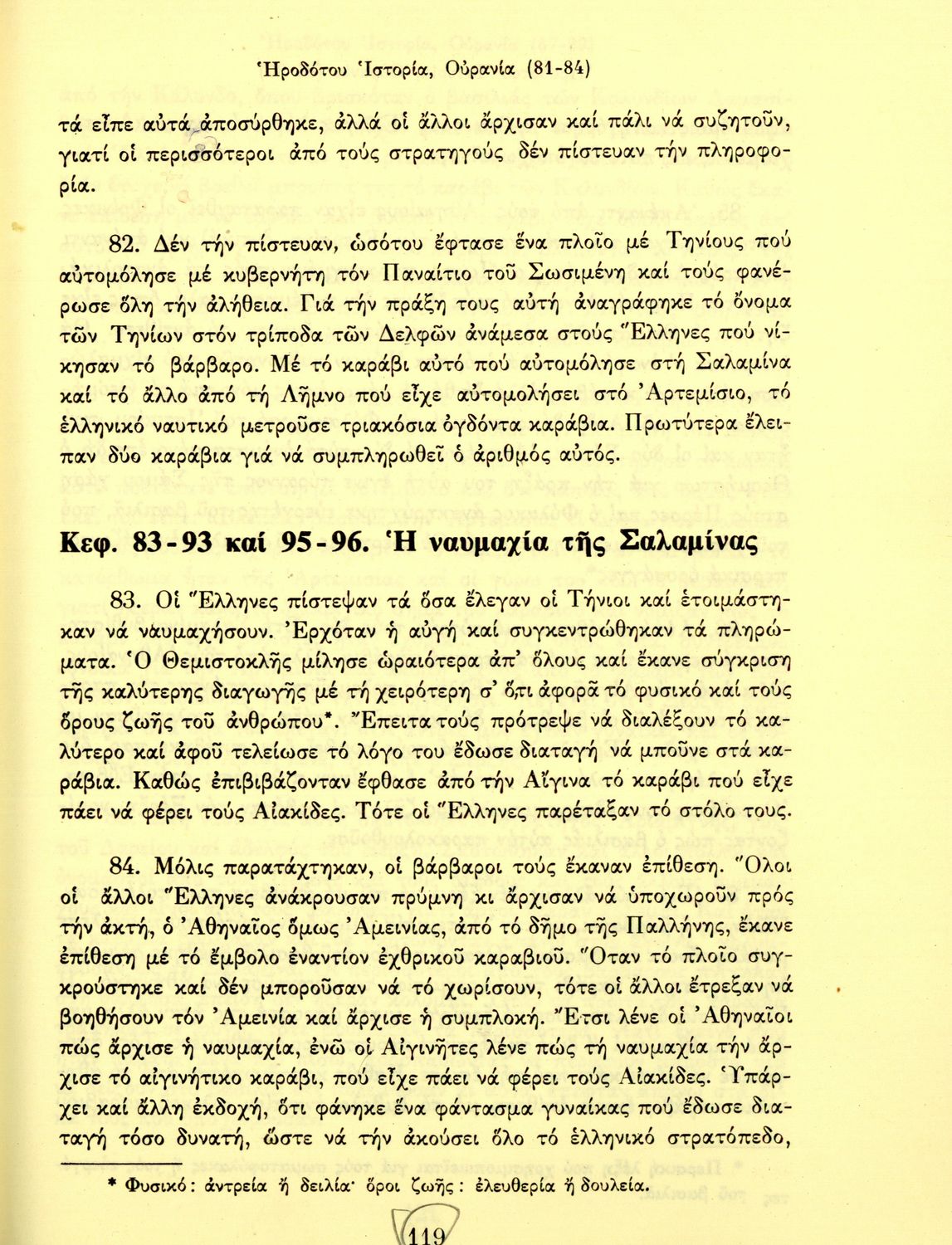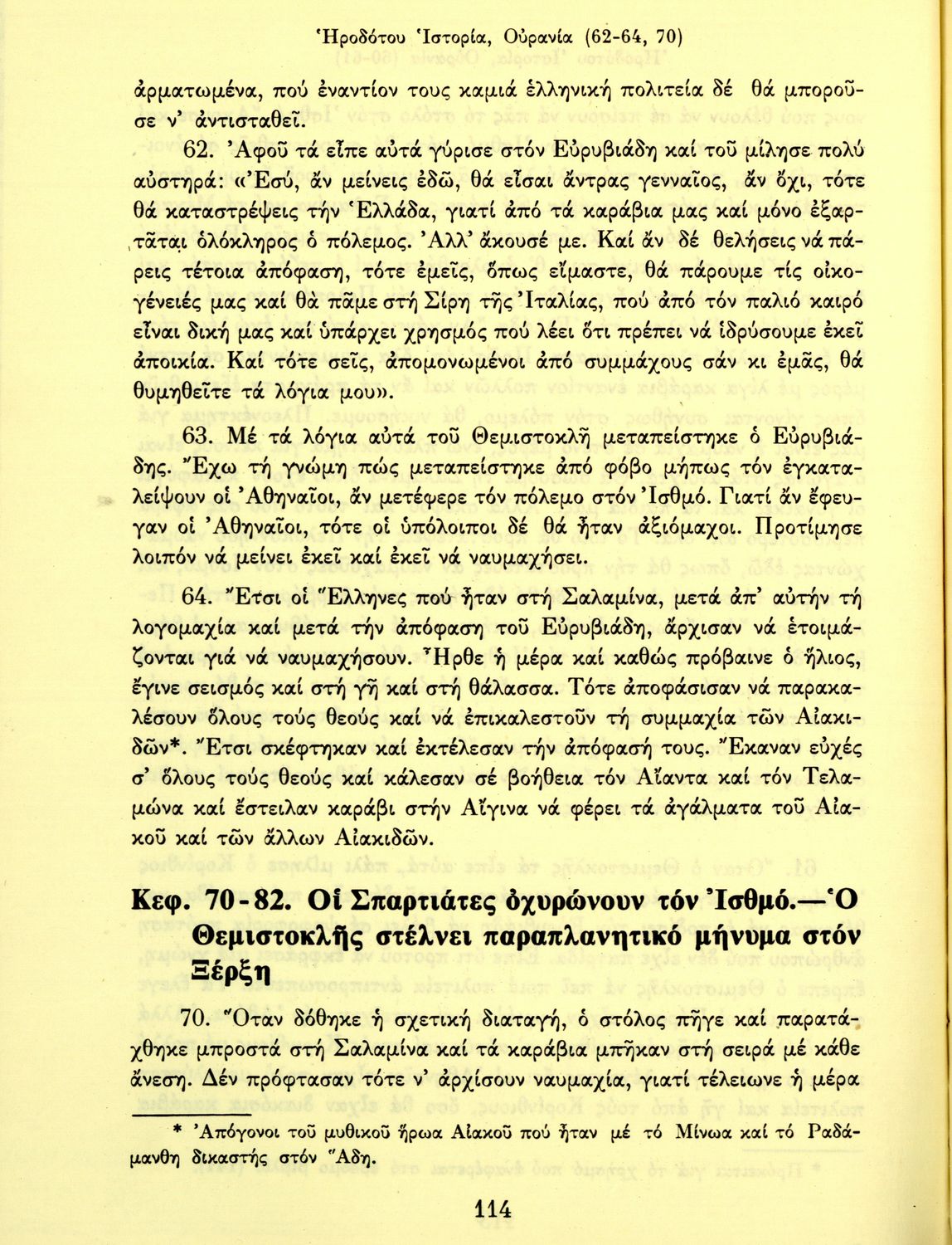 Σχολικό εγχειρίδιο Αρχαίων Ελληνικών Α΄ Γυμνασίου που περιλαμβάνει αποσπάσματα από την Ιστορία του Ηρόδοτου σε μετάφραση, εισαγωγή στη ζωή, το έργο και τη διάλεκτό του και ερμηνευτικά και πραγματολογικά σχόλια.