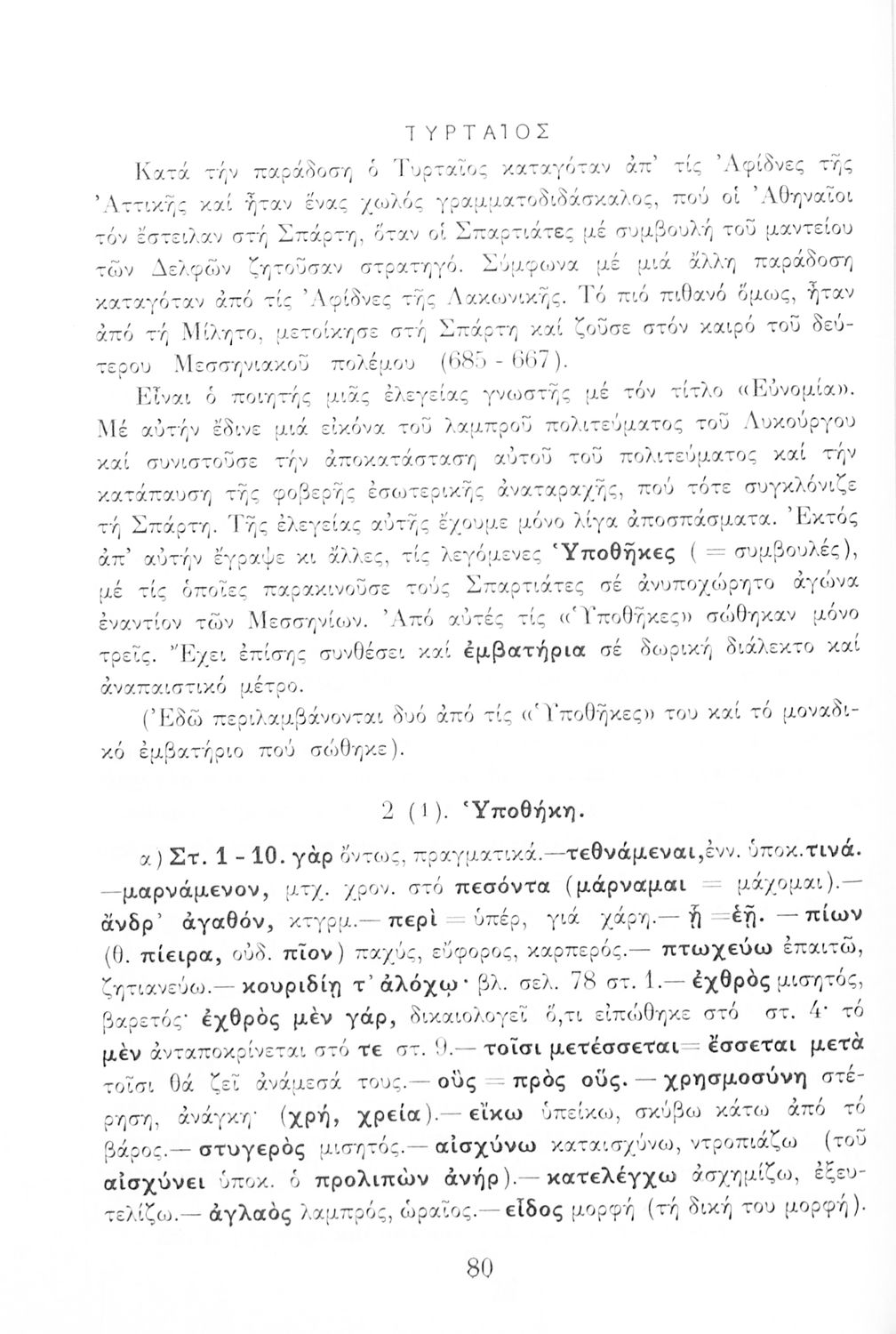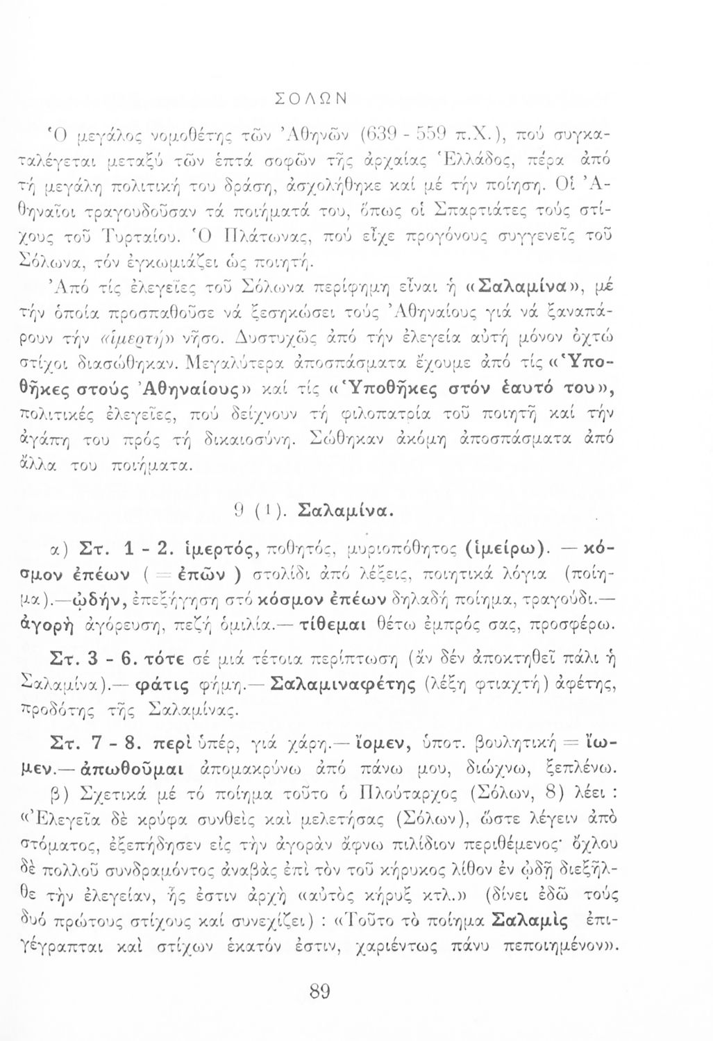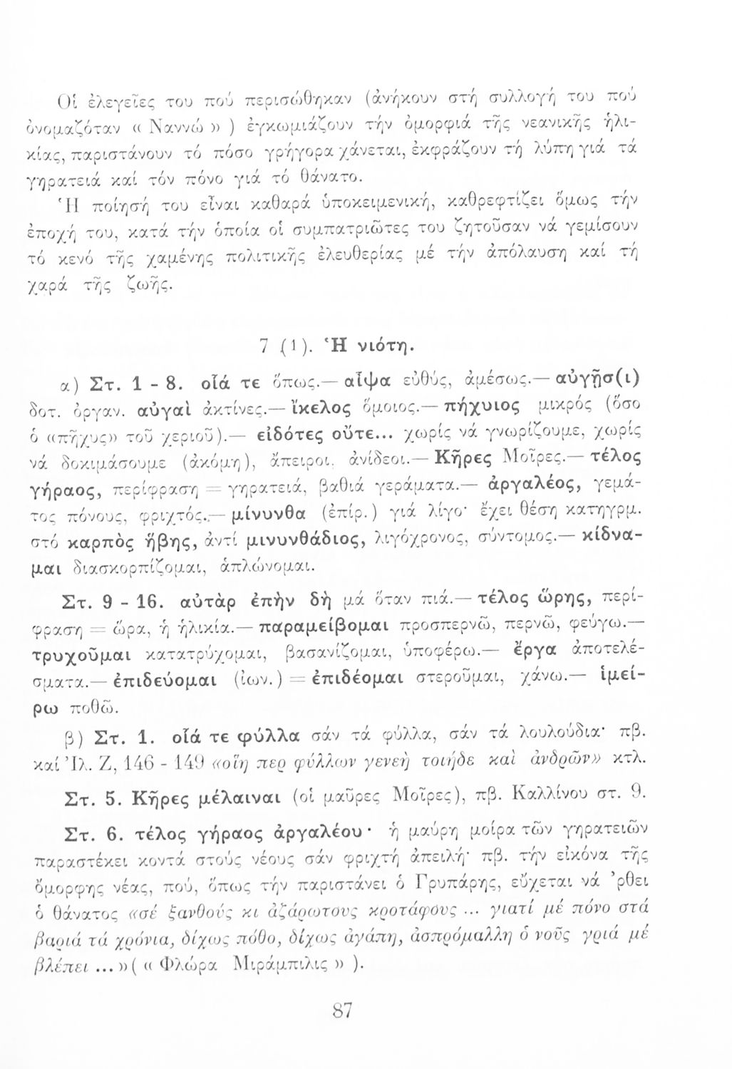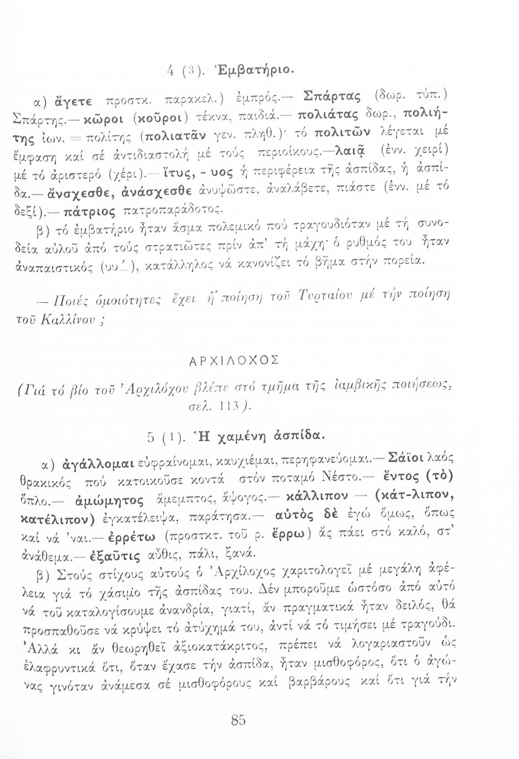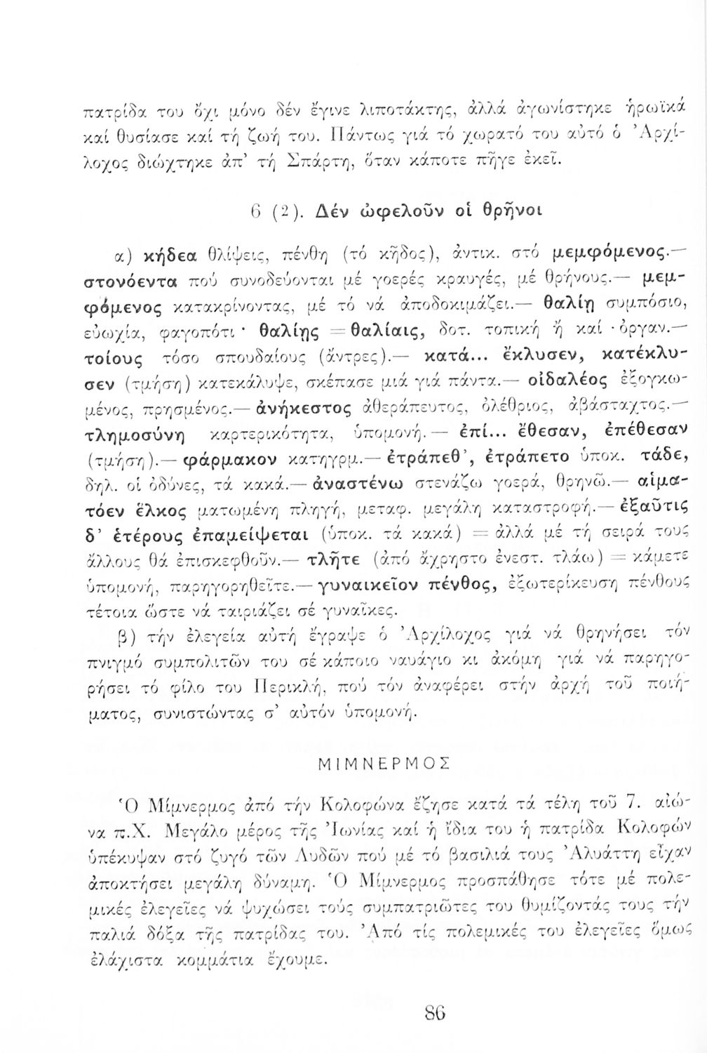 Σχολικό εγχειρίδιο Αρχαίων Ελληνικών Γ΄ Λυκείου που περιλαμβάνει αποσπάσματα έργων αρχαίων Ελλήνων λυρικών, πολιτικές και γνωμικές ελεγείες, ιάμβους και επιγράμματα. Περιέχει υπόμνημα με ερμηνευτικά, πραγματολογικά, γλωσσικά και γραμματικά σχόλια και μετρικό παράρτημα.