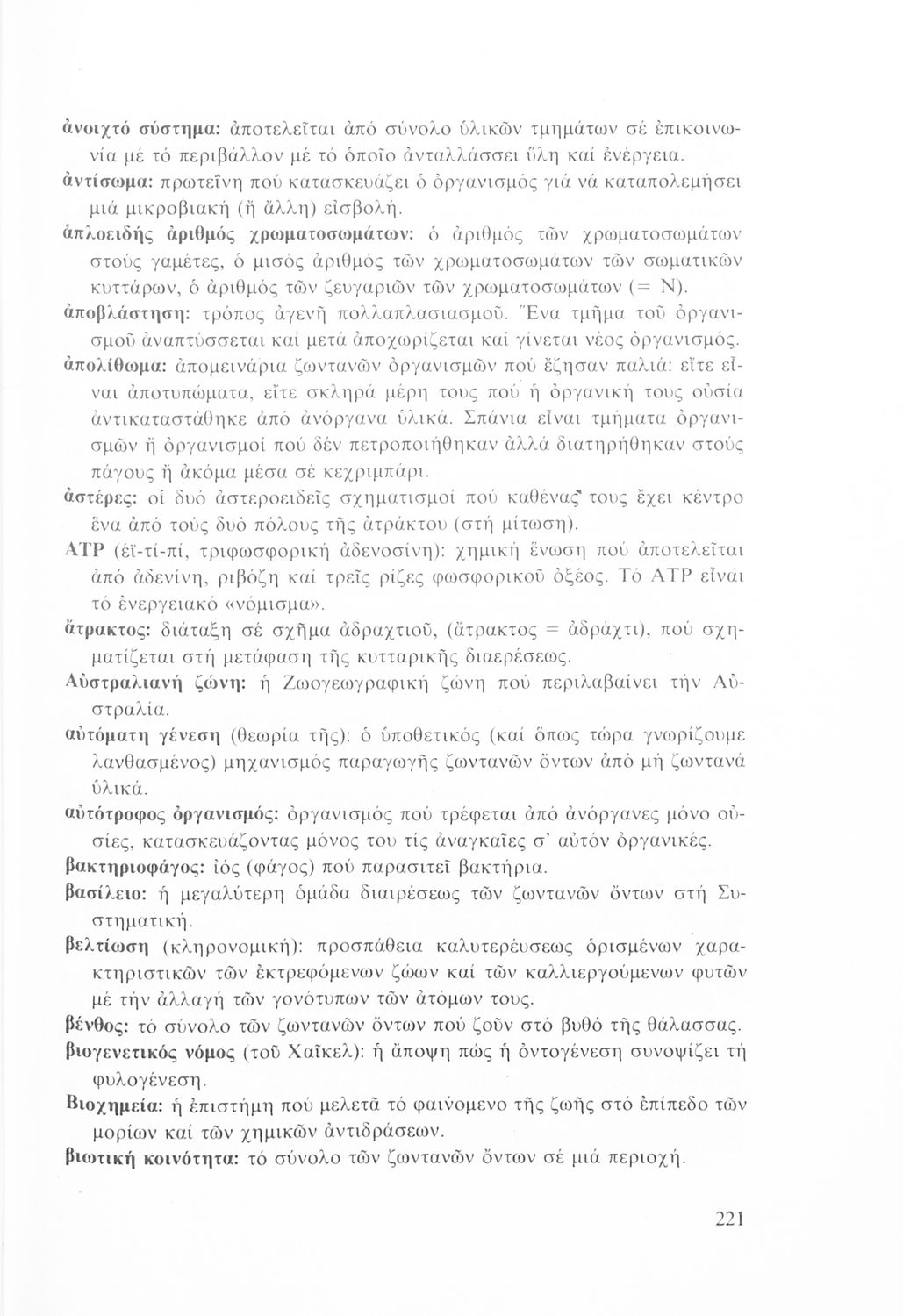 Σχολικό εγχειρίδιο Βιολογίας Γ΄ Γυμνασίου που εστιάζει στις συνθήκες γέννησης, μεταβολής και θανάτου των έμβιων οργανισμών. Φέρει το σύμβολο της δικτατορίας.