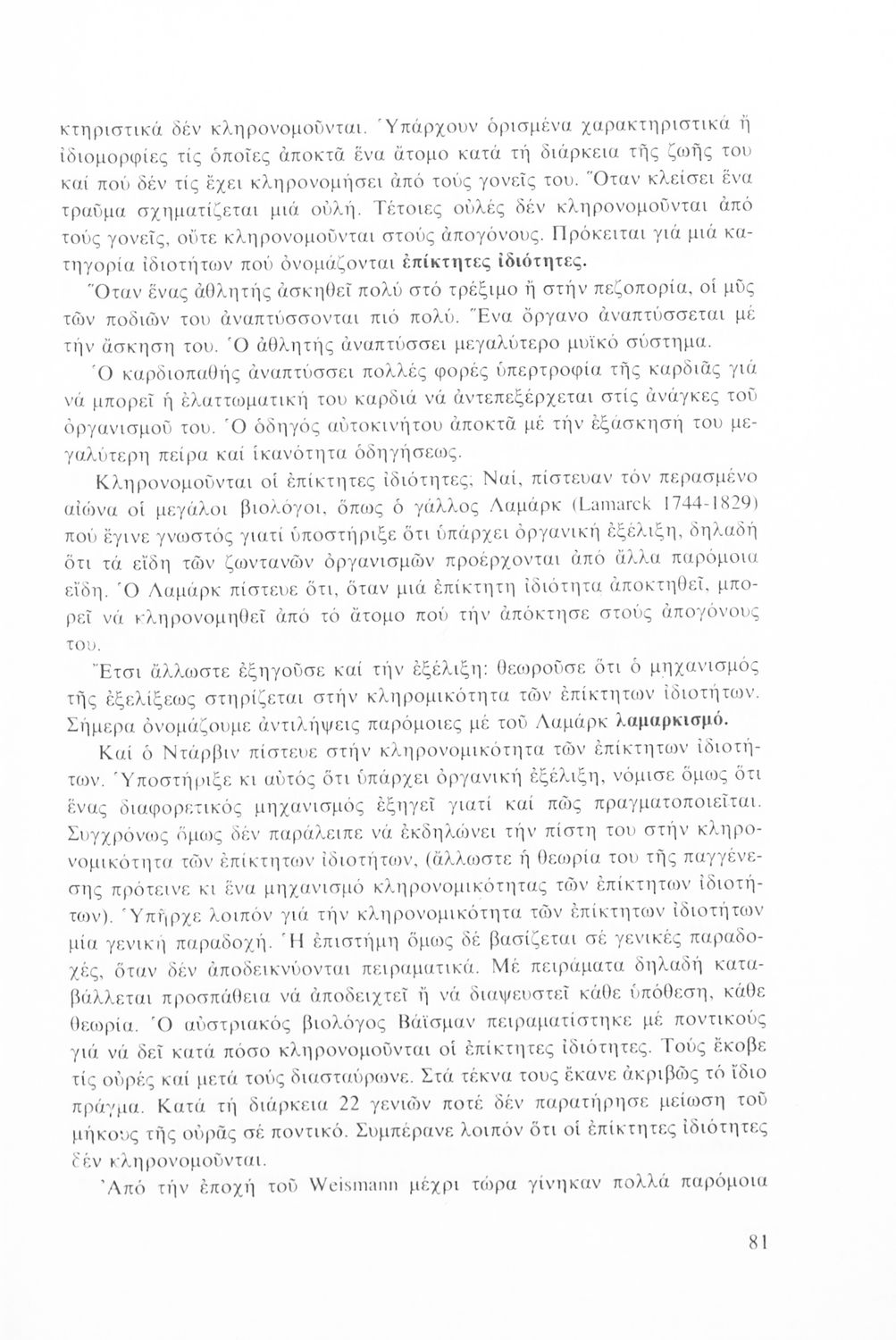 Σχολικό εγχειρίδιο Βιολογίας Γ΄ Γυμνασίου που εστιάζει στις συνθήκες γέννησης, μεταβολής και θανάτου των έμβιων οργανισμών. Φέρει το σύμβολο της δικτατορίας.