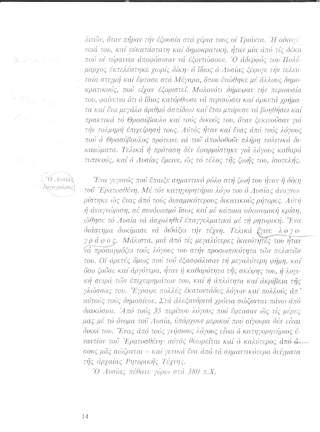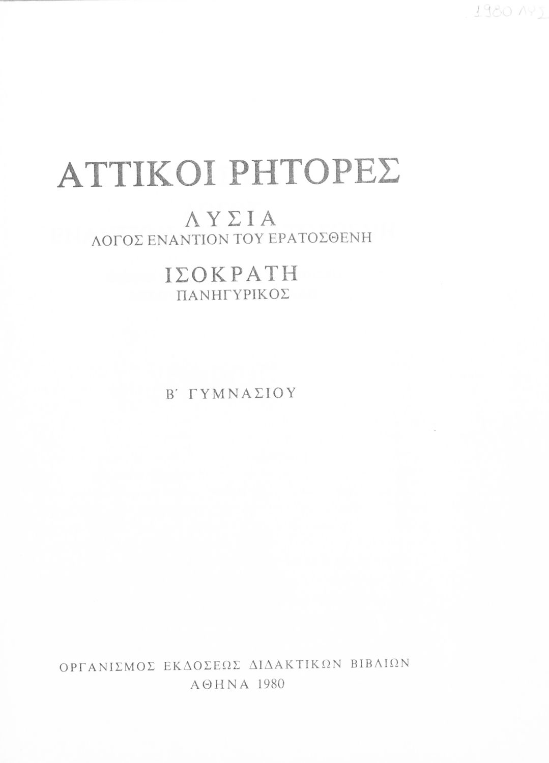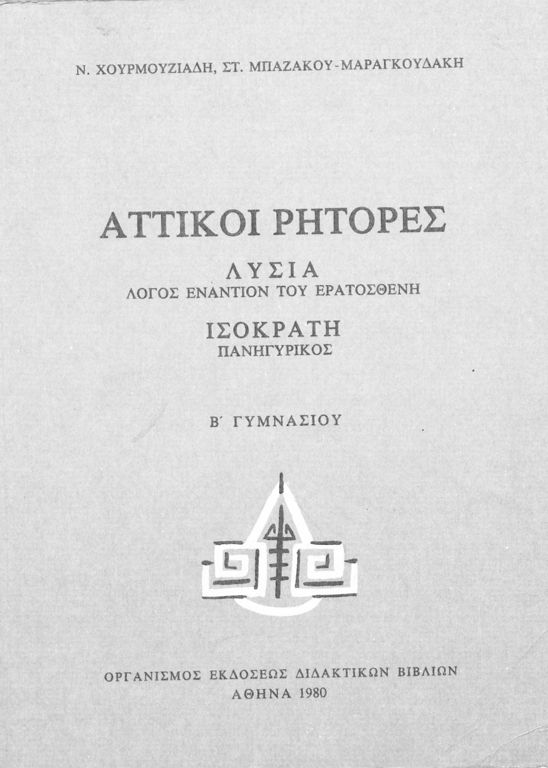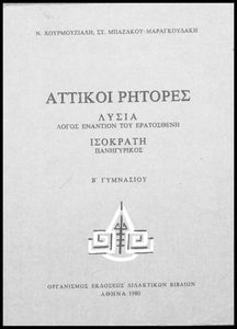 Σχολικό εγχειρίδιο Αρχαίων Ελληνικών για τη Β΄ Γυμνασίου που περιλαμβάνει Λόγους των Λυσία και Ισοκράτη και αποσπάσματα από τα Ελληνικά του Ξενοφώντα σε μετάφραση, εισαγωγή στη ζωή και το έργο τους και ερμηνευτικές σημειώσεις.