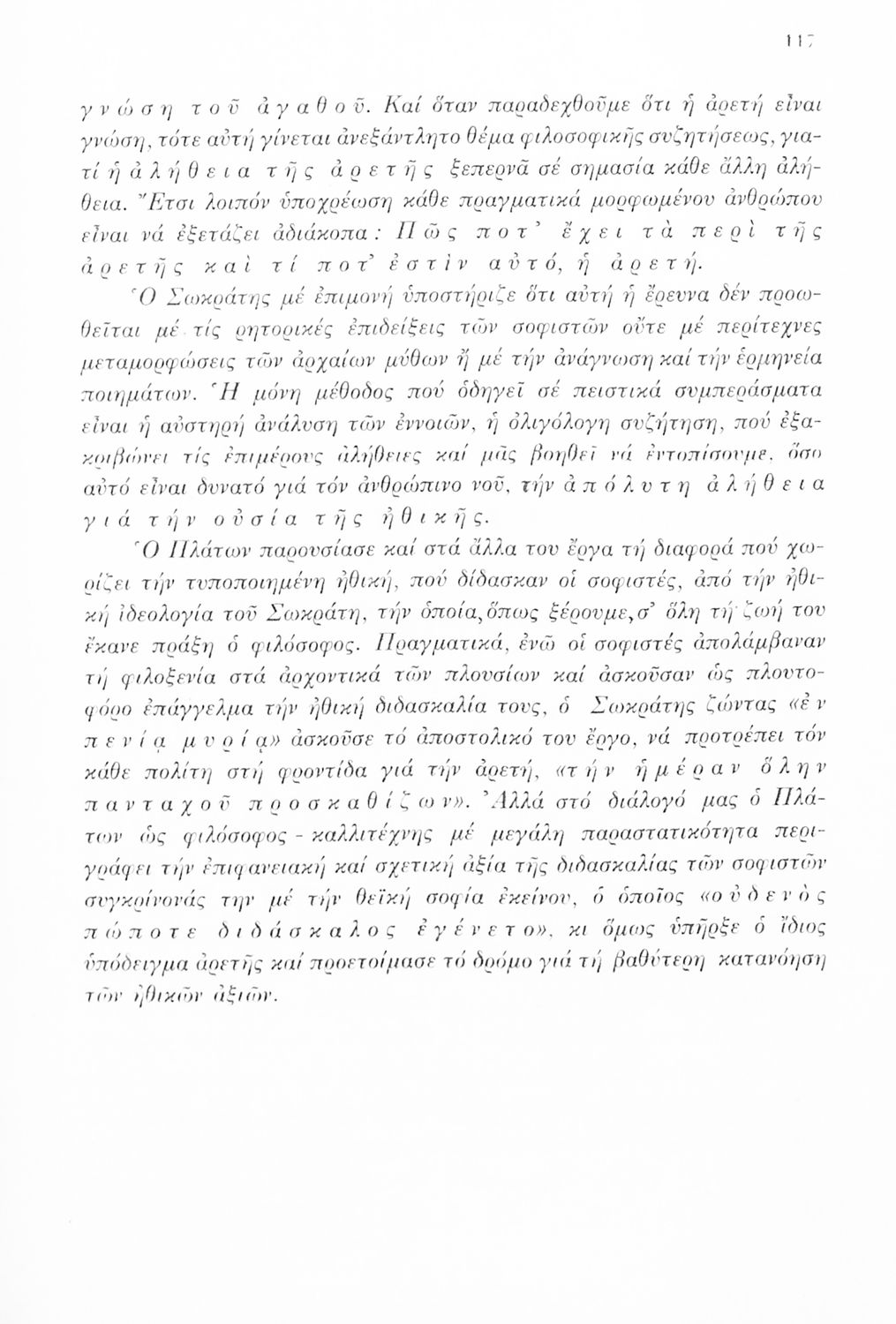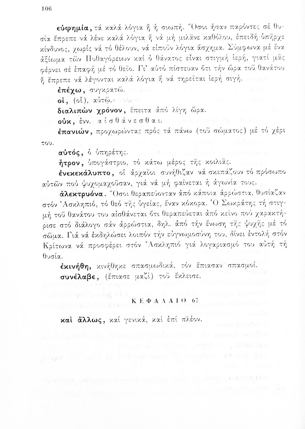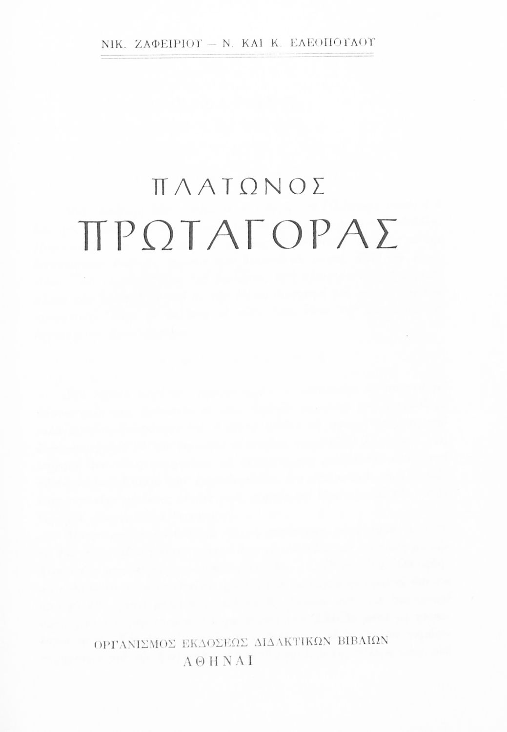 Σχολικό εγχειρίδιο Αρχαίων Ελληνικών της Γ΄ Λυκείου. Το βιβλίο ξεκινάει με μία εισαγωγή στη ζωή και το έργο του Πλάτωνα. Στην συνέχεια παρουσιάζει τα έργα του Πλάτωνα 'Φαίδων' και 'Πρωταγόρας'. Τα κείμενα συνοδεύονται από γλωσσικές και ερμηνευτικές σημειώσεις.
