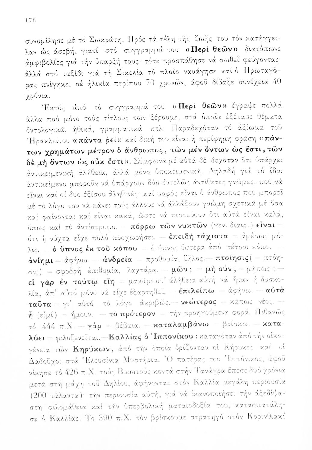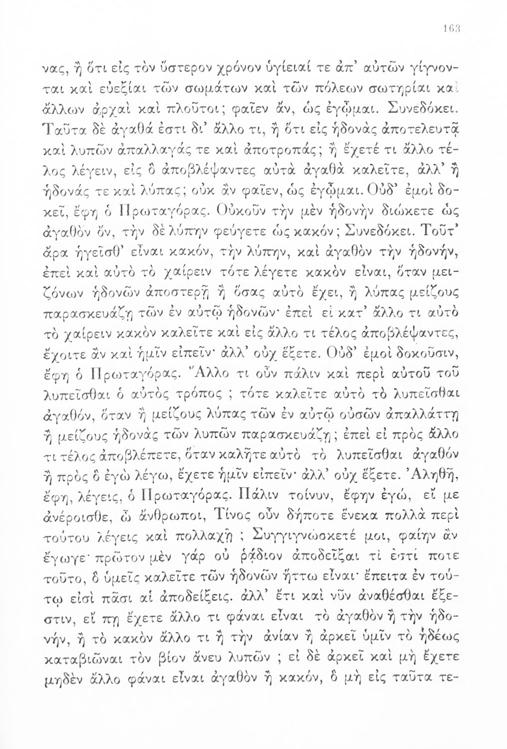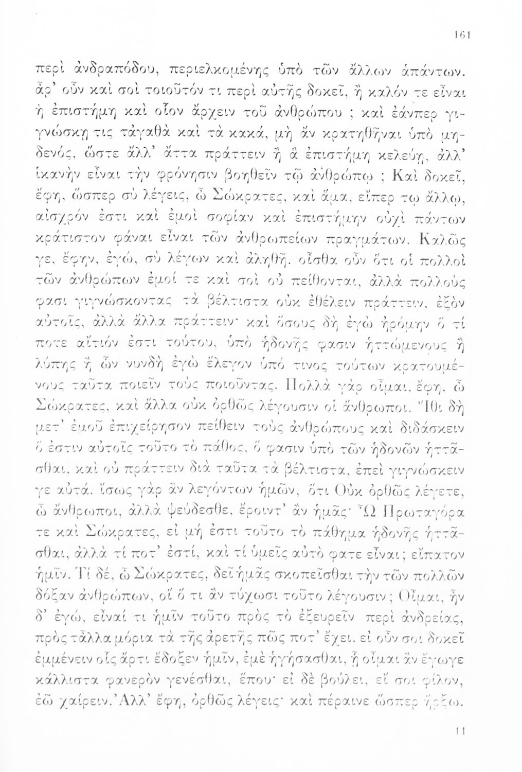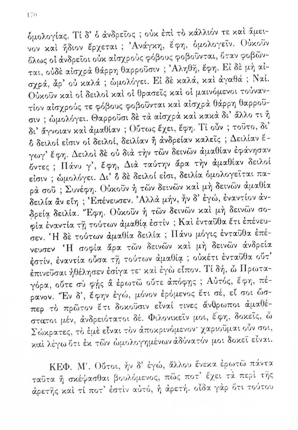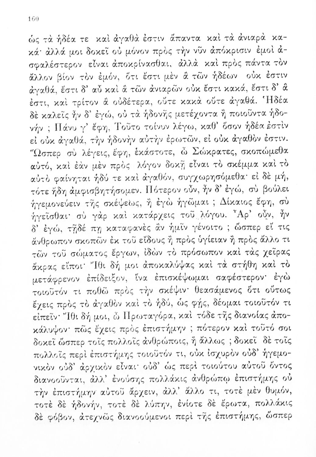 Σχολικό εγχειρίδιο Αρχαίων Ελληνικών της Γ΄ Λυκείου. Το βιβλίο ξεκινάει με μία εισαγωγή στη ζωή και το έργο του Πλάτωνα. Στην συνέχεια παρουσιάζει τα έργα του Πλάτωνα 'Φαίδων' και 'Πρωταγόρας'. Τα κείμενα συνοδεύονται από γλωσσικές και ερμηνευτικές σημειώσεις.