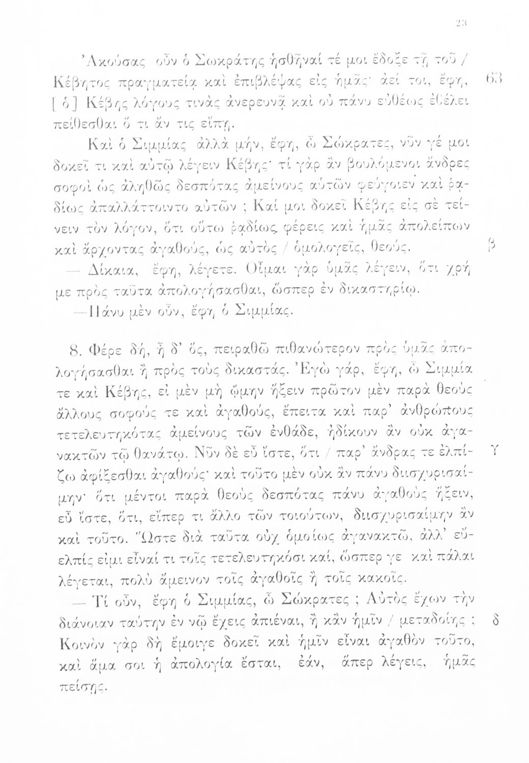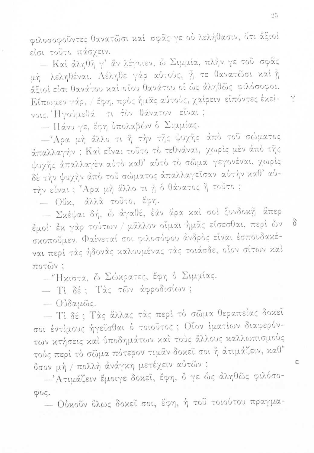 Σχολικό εγχειρίδιο Αρχαίων Ελληνικών της Γ΄ Λυκείου. Το βιβλίο ξεκινάει με μία εισαγωγή στη ζωή και το έργο του Πλάτωνα. Στην συνέχεια παρουσιάζει τα έργα του Πλάτωνα 'Φαίδων' και 'Πρωταγόρας'. Τα κείμενα συνοδεύονται από γλωσσικές και ερμηνευτικές σημειώσεις.