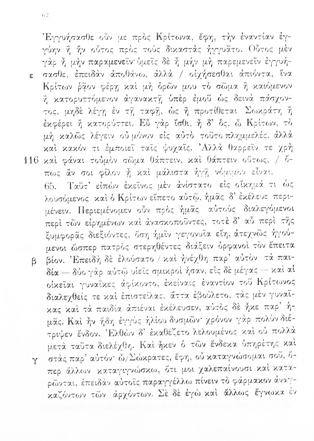 Σχολικό εγχειρίδιο Αρχαίων Ελληνικών Γ΄ Γυμνασίου που περιλαμβάνει το έργο του Πλάτωνα Κρίτων, εισαγωγή, μετάφραση και ερμηνευτικές παρατηρήσεις.