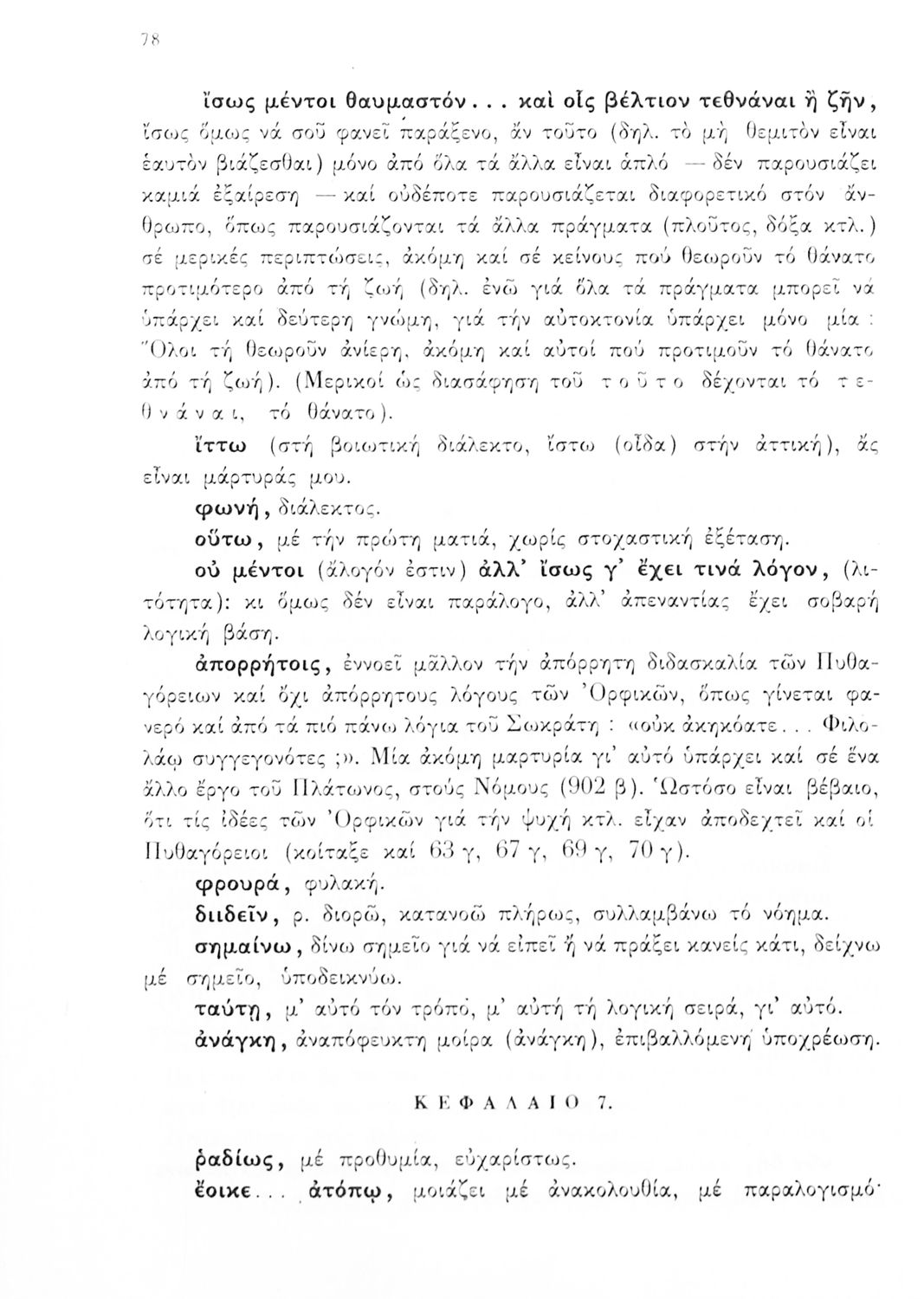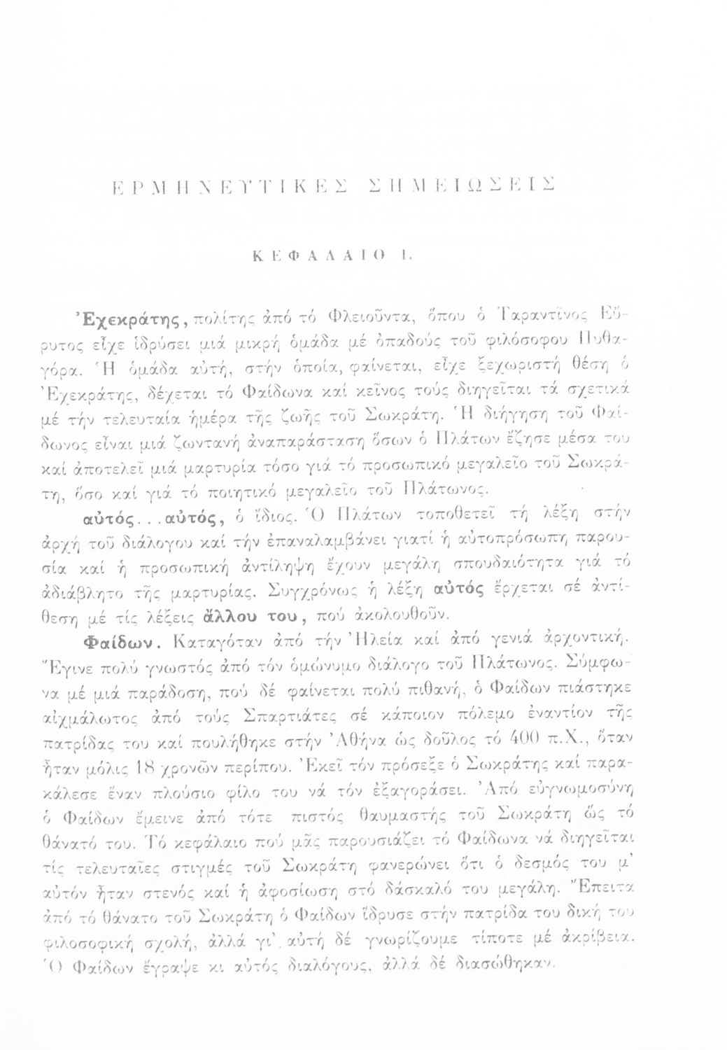Σχολικό εγχειρίδιο Αρχαίων Ελληνικών της Γ΄ Λυκείου. Το βιβλίο ξεκινάει με μία εισαγωγή στη ζωή και το έργο του Πλάτωνα. Στην συνέχεια παρουσιάζει τα έργα του Πλάτωνα 'Φαίδων' και 'Πρωταγόρας'. Τα κείμενα συνοδεύονται από γλωσσικές και ερμηνευτικές σημειώσεις.