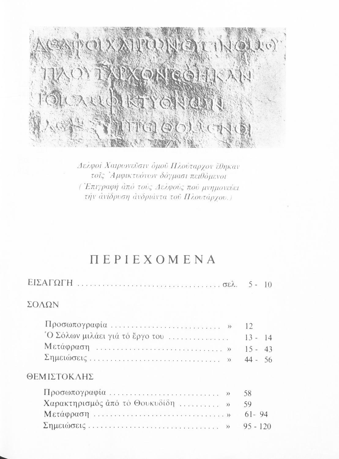 Σχολικό εγχειρίδιο Αρχαίων Ελληνικών της Β' Γυμνασίου. Το βιβλίο περιλαμβάνει τέσσερις από τους “Βίους” του Πλούταρχου: του Σόλωνα, του Θεμιστοκλή, του Περικλή και του Φωκίωνα