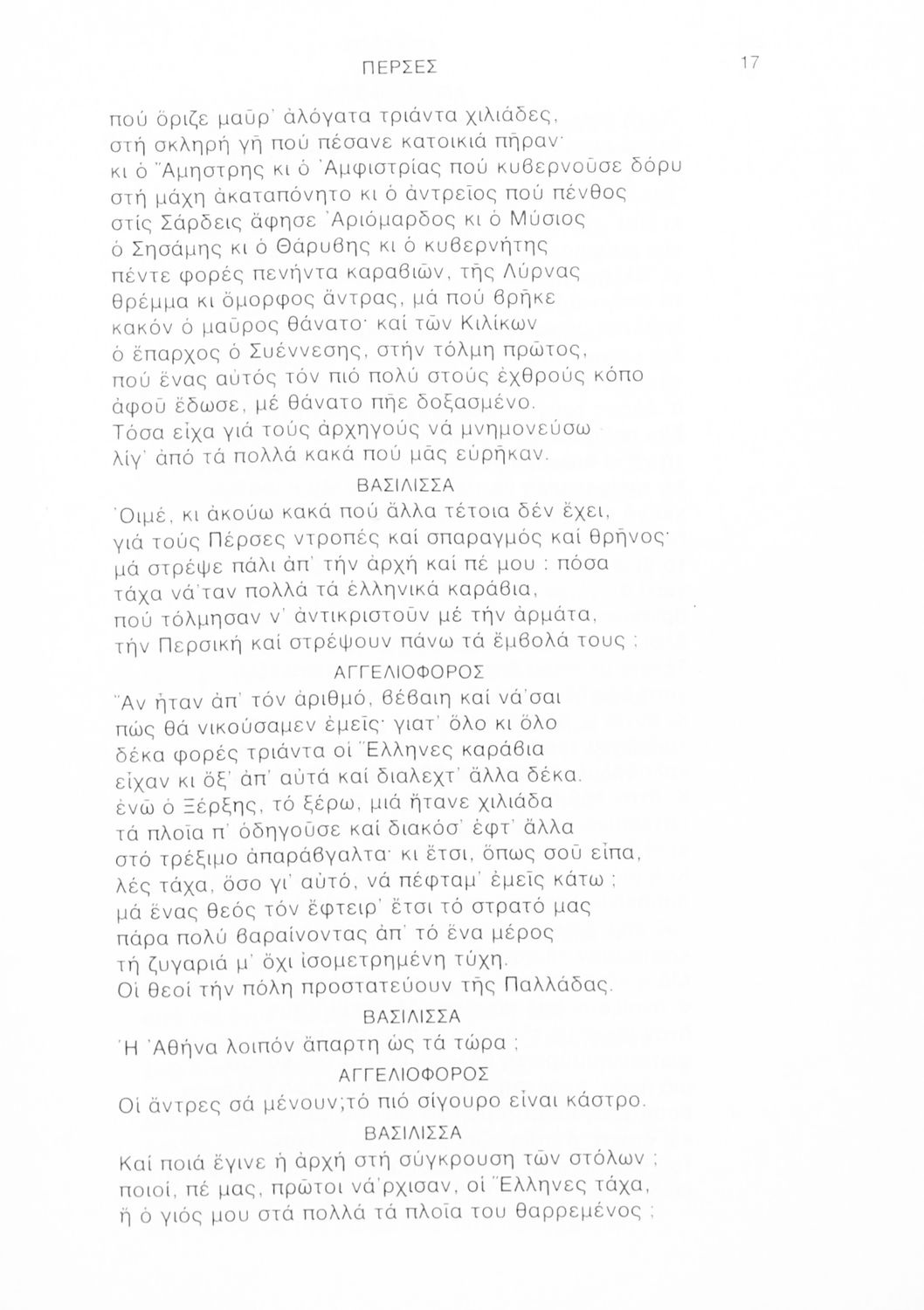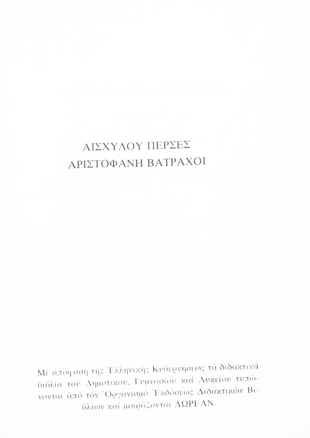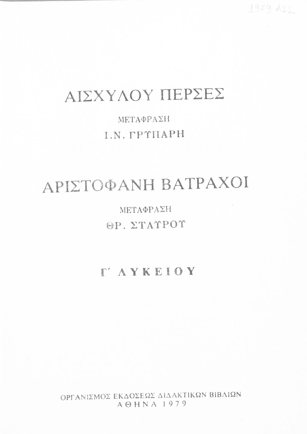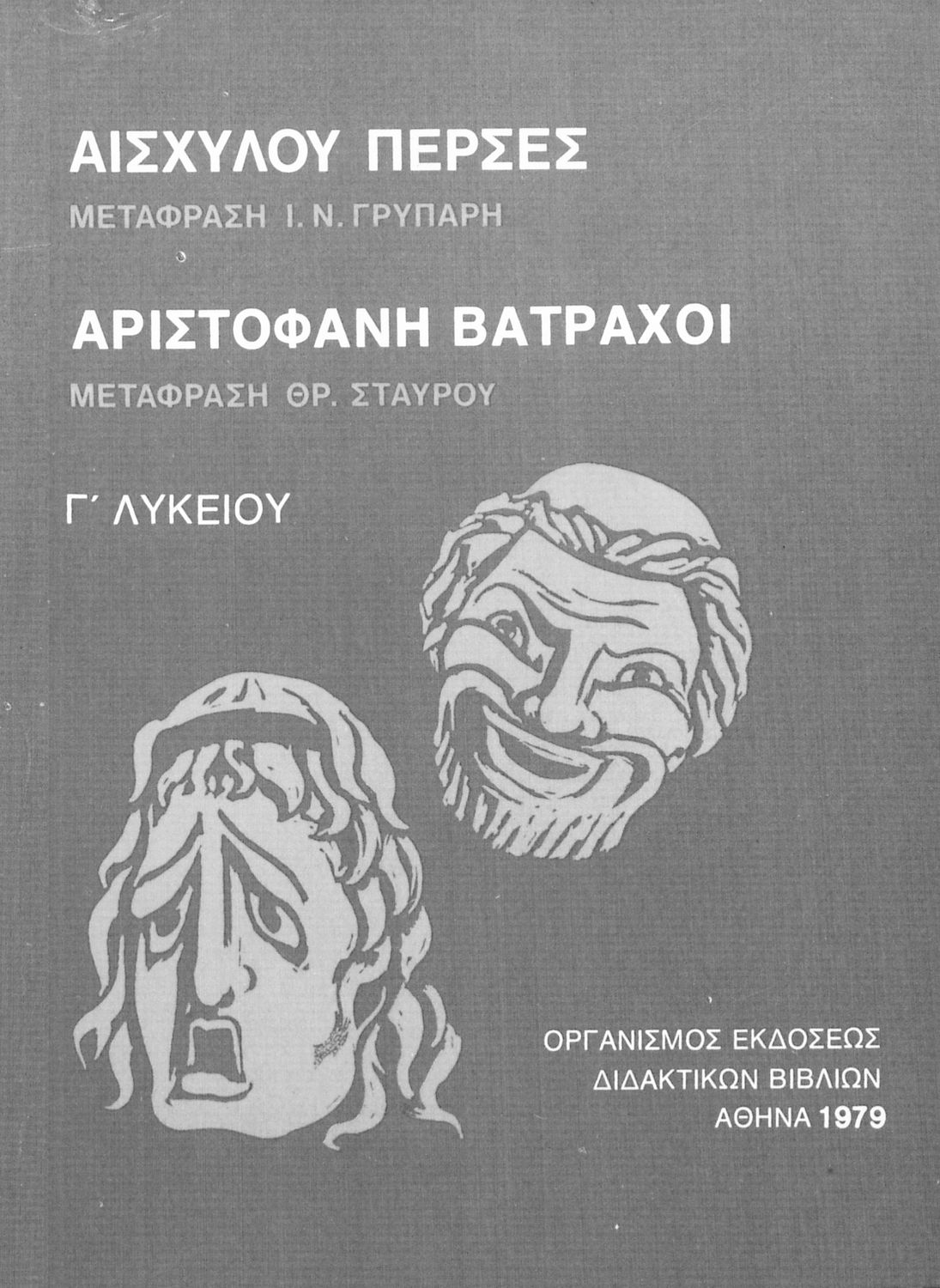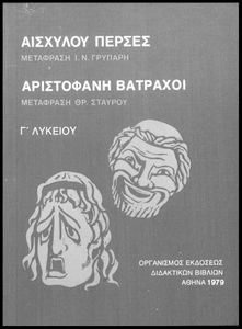 Σχολικό εγχειρίδιο Αρχαίων Ελληνικών Γ΄ Λυκείου που περιλαμβάνει αποσπάσματα από την Τραγωδία του Αισχύλου Πέρσες σε μετάφραση Ι. Ν. Γρυπάρη, εισαγωγικό σημείωμα σχετικά με την αρχαία ελληνική κωμωδία του Ι. Κ. Κακριδή και αποσπάσματα από την κωμωδία του Αριστοφάνη Βάτραχοι σε μετάφραση και ερμηνευτικά σχόλια του Θρ. Σταύρου.
