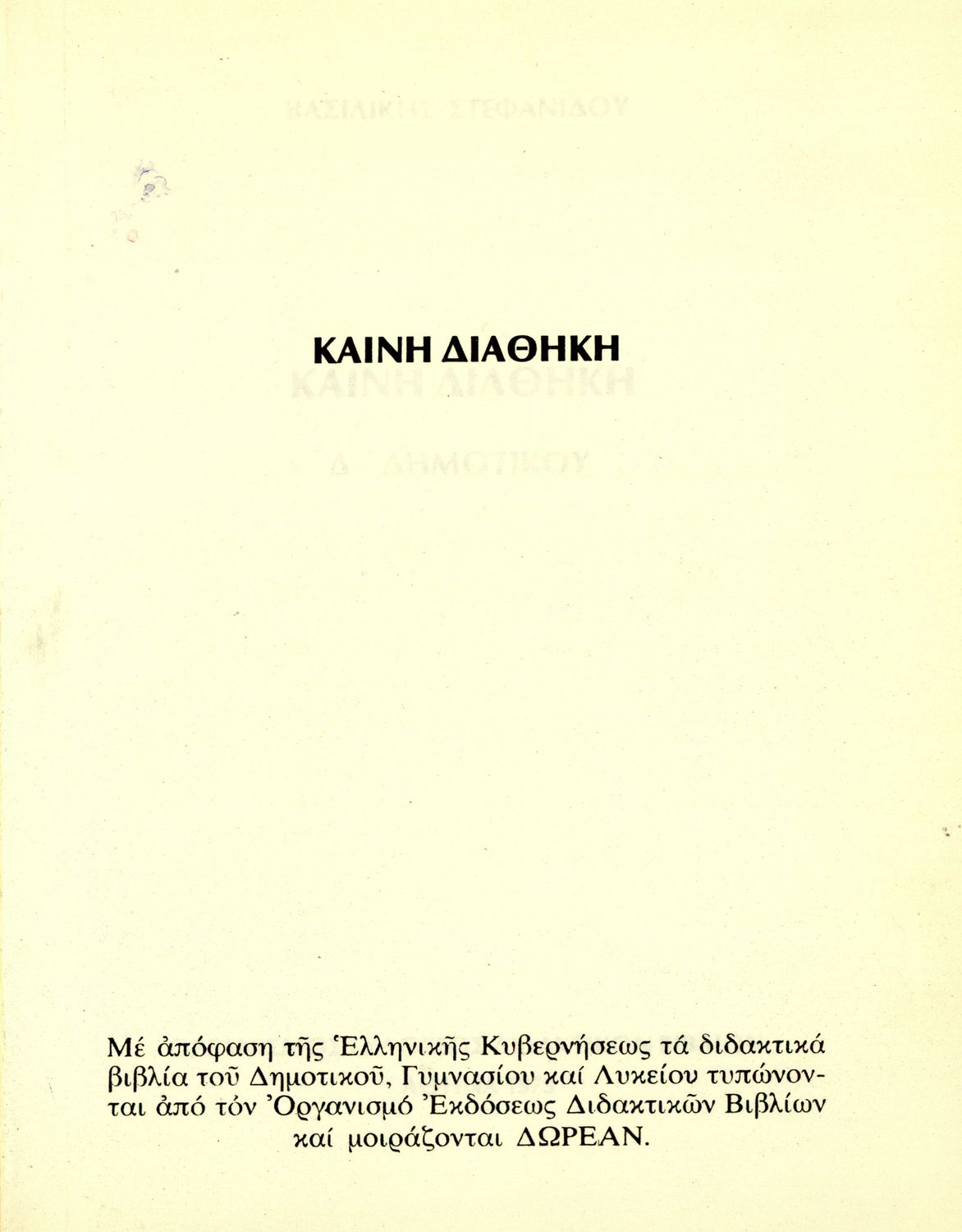 Κωδικός αναγνώρισης: 02-00379 Τίτλος: Καινή Διαθήκη Δ΄ Δημοτικού Συγγραφέας: Βασιλική Στεφανίδου Μέγεθος και υπόστρωμα: Σχολικό εγχειρίδιο, μαλακό εξώφυλλο, 132 σελίδες. Σκίτσα (ασπρόμαυρα). |