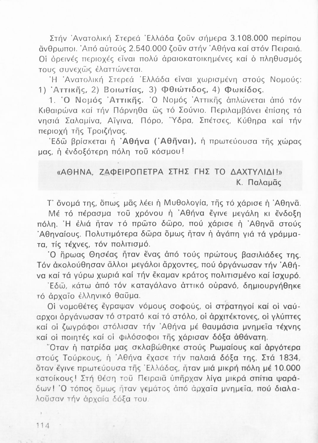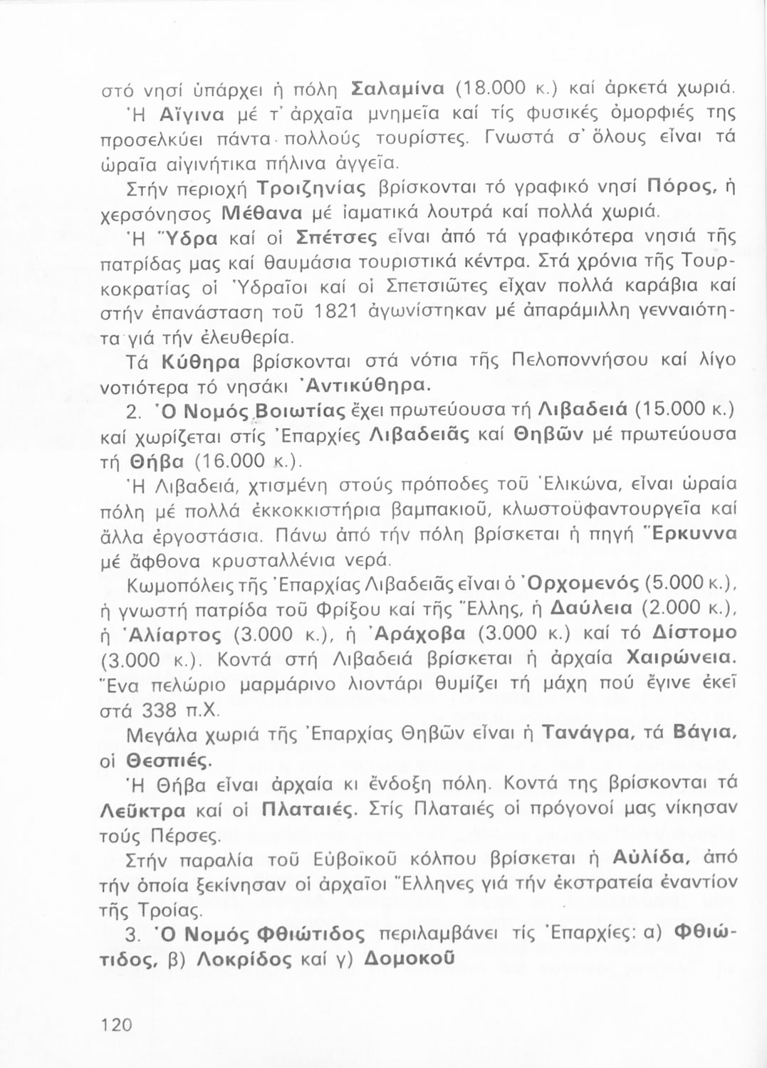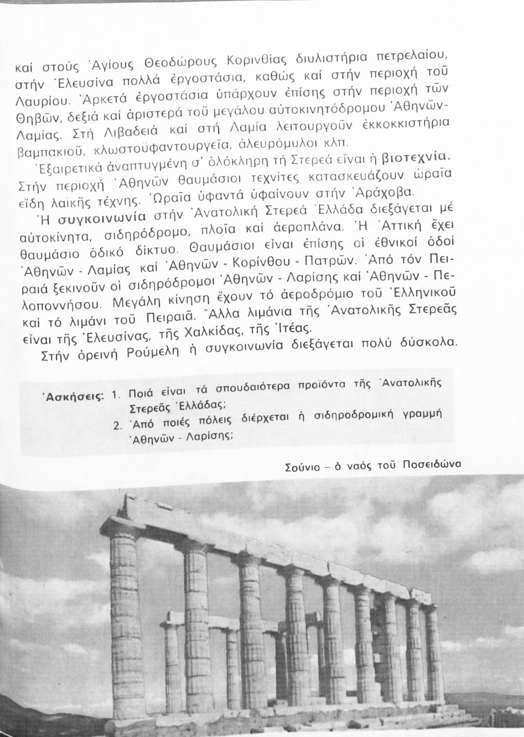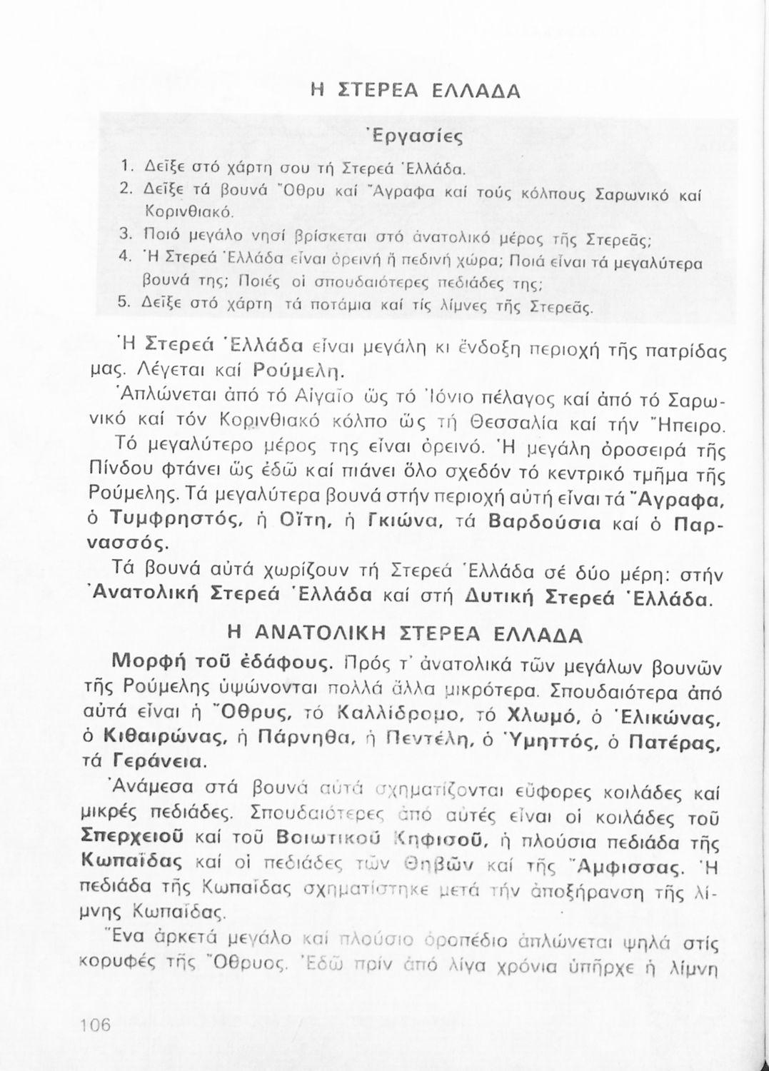 Βαθμίδα εκπαίδευσης: Πρωτοβάθμια Τάξη: Γ' Δημοτικού / Δ' Δημοτικού Μάθημα: Γεωγραφία Γλώσσα: Δημοτική Παρουσίαση περιεχομένου: Σχολικό εγχειρίδιο Γεωγραφίας Γ ΄ και Δ' Δημοτικού. Το πρώτο μέρος του βιβλίου απευθύνεται σε μαθητές της Γ' Δημοτικού και αποτελεί μια εισαγωγή στην πατριδογνωσία με έμφαση στις παραδόσεις της ελληνικής επαρχίας. Το δεύτερο μέρος αφορά την Δ' Δημοτικού και εξετάζει την οικονομική, πολιτική και γεωφυσική γεωγραφία της Ελλάδας. |