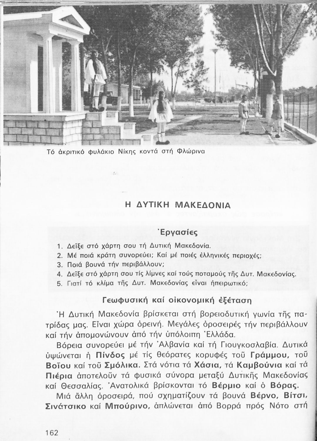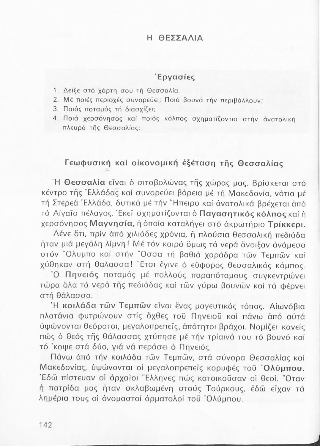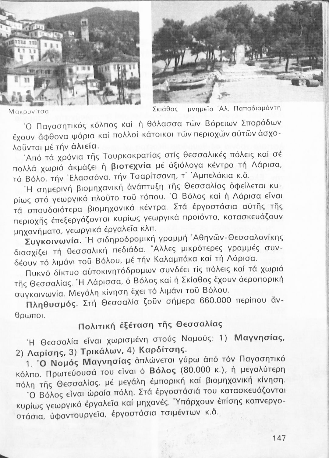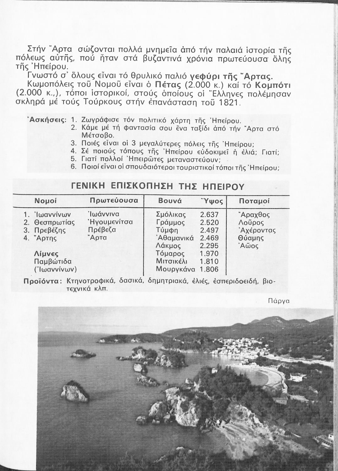 Βαθμίδα εκπαίδευσης: Πρωτοβάθμια Τάξη: Γ' Δημοτικού / Δ' Δημοτικού Μάθημα: Γεωγραφία Γλώσσα: Δημοτική Παρουσίαση περιεχομένου: Σχολικό εγχειρίδιο Γεωγραφίας Γ ΄ και Δ' Δημοτικού. Το πρώτο μέρος του βιβλίου απευθύνεται σε μαθητές της Γ' Δημοτικού και αποτελεί μια εισαγωγή στην πατριδογνωσία με έμφαση στις παραδόσεις της ελληνικής επαρχίας. Το δεύτερο μέρος αφορά την Δ' Δημοτικού και εξετάζει την οικονομική, πολιτική και γεωφυσική γεωγραφία της Ελλάδας. |