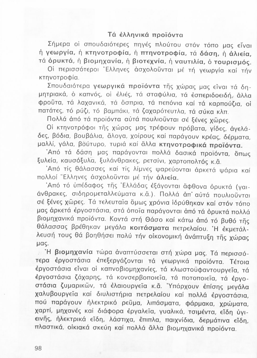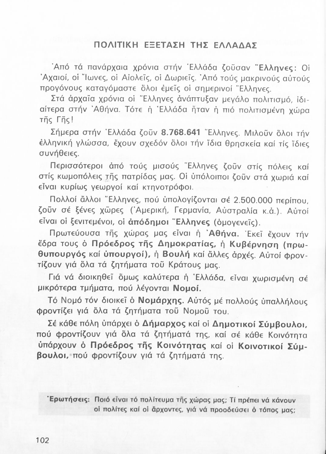 Παρουσίαση περιεχομένου: Σχολικό εγχειρίδιο Γεωγραφίας Γ ΄ και Δ' Δημοτικού. Το πρώτο μέρος του βιβλίου απευθύνεται σε μαθητές της Γ' Δημοτικού και αποτελεί μια εισαγωγή στην πατριδογνωσία με έμφαση στις παραδόσεις της ελληνικής επαρχίας. Το δεύτερο μέρος αφορά την Δ' Δημοτικού και εξετάζει την οικονομική, πολιτική και γεωφυσική γεωγραφία της Ελλάδας.