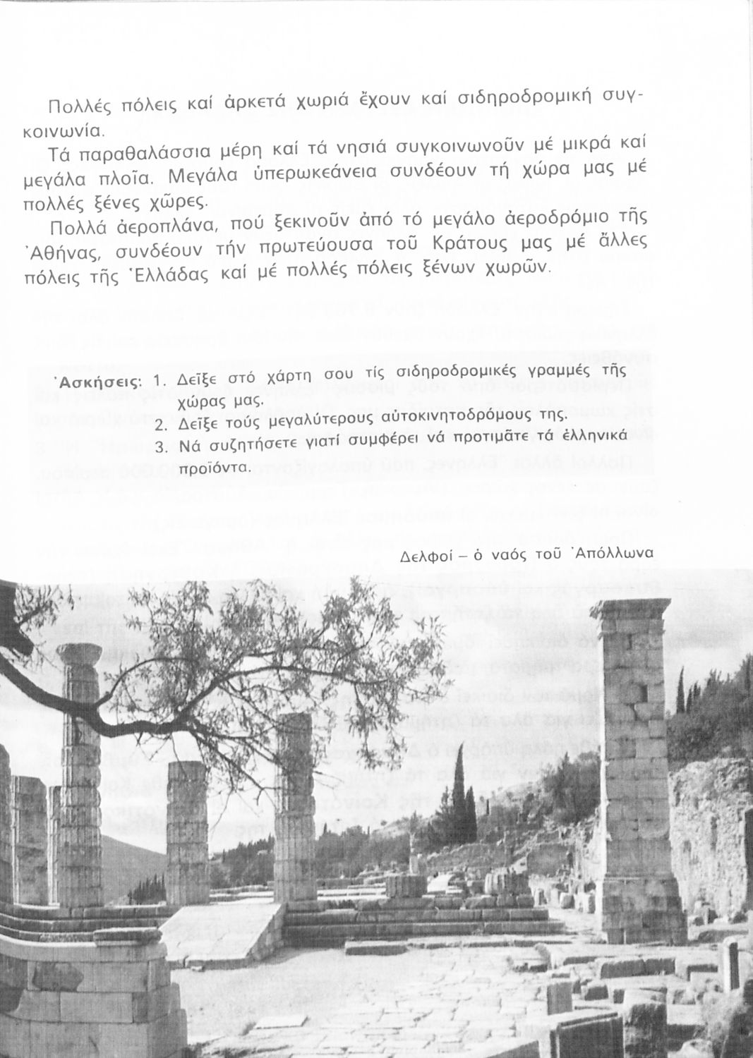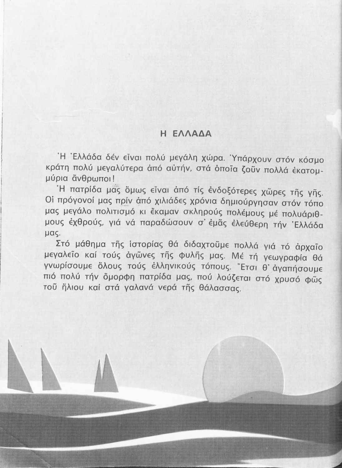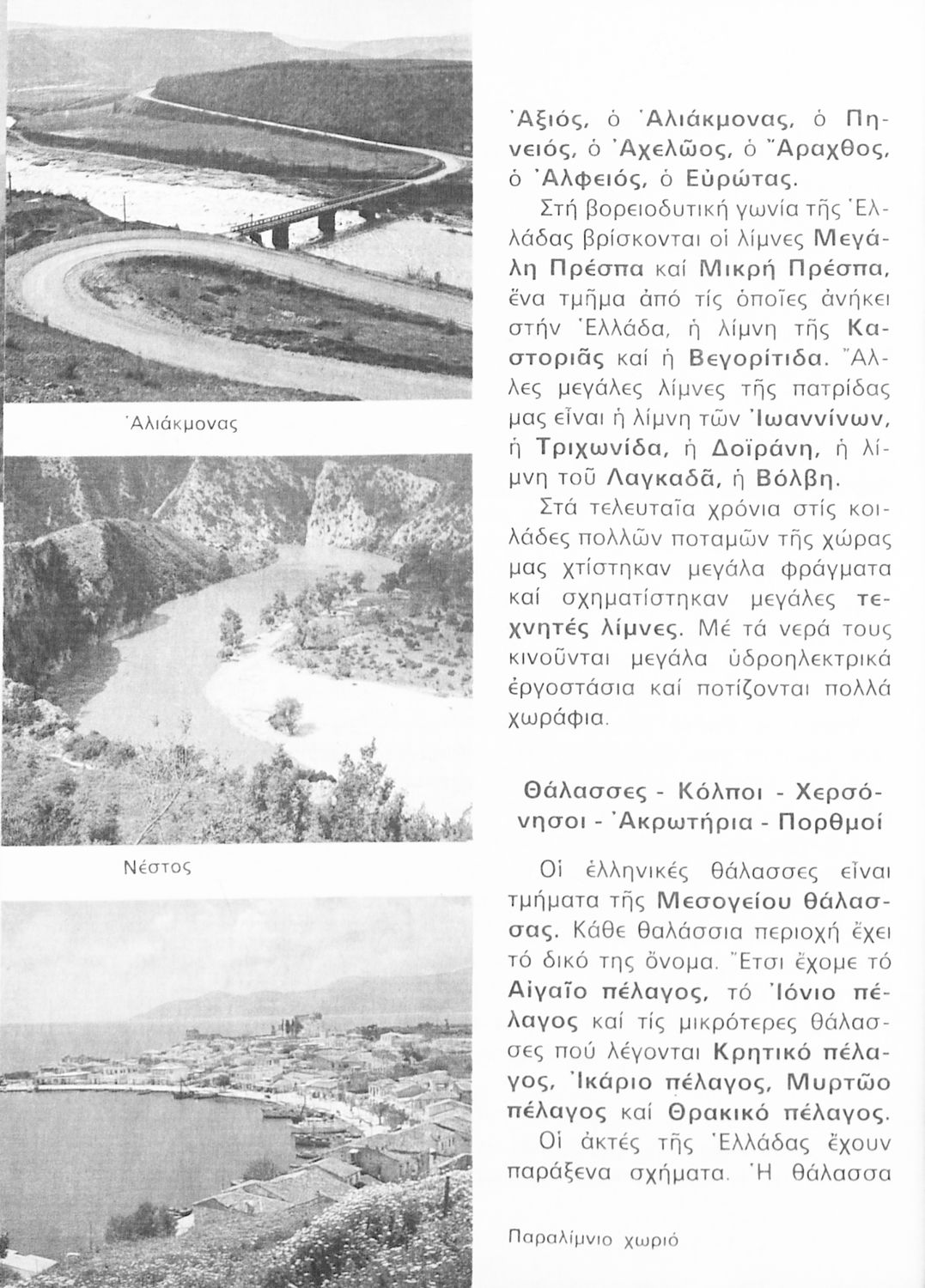 Σχολικό εγχειρίδιο Γεωγραφίας Γ ΄ και Δ' Δημοτικού. Το πρώτο μέρος του βιβλίου απευθύνεται σε μαθητές της Γ' Δημοτικού και αποτελεί μια εισαγωγή στην πατριδογνωσία με έμφαση στις παραδόσεις της ελληνικής επαρχίας. Το δεύτερο μέρος αφορά την Δ' Δημοτικού και εξετάζει την οικονομική, πολιτική και γεωφυσική γεωγραφία της Ελλάδας.