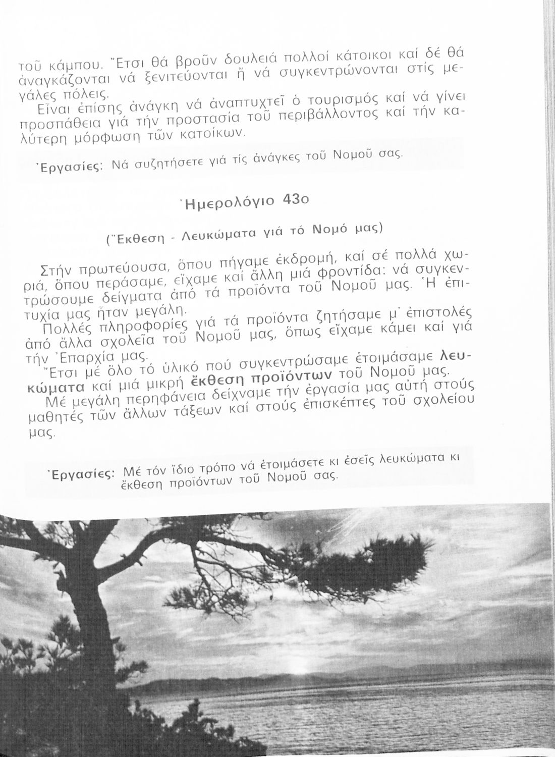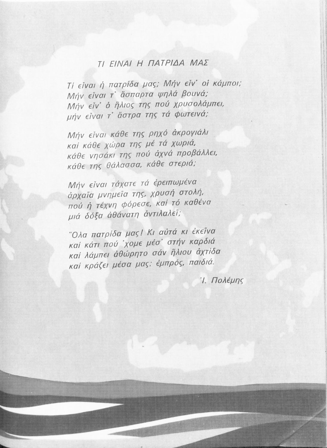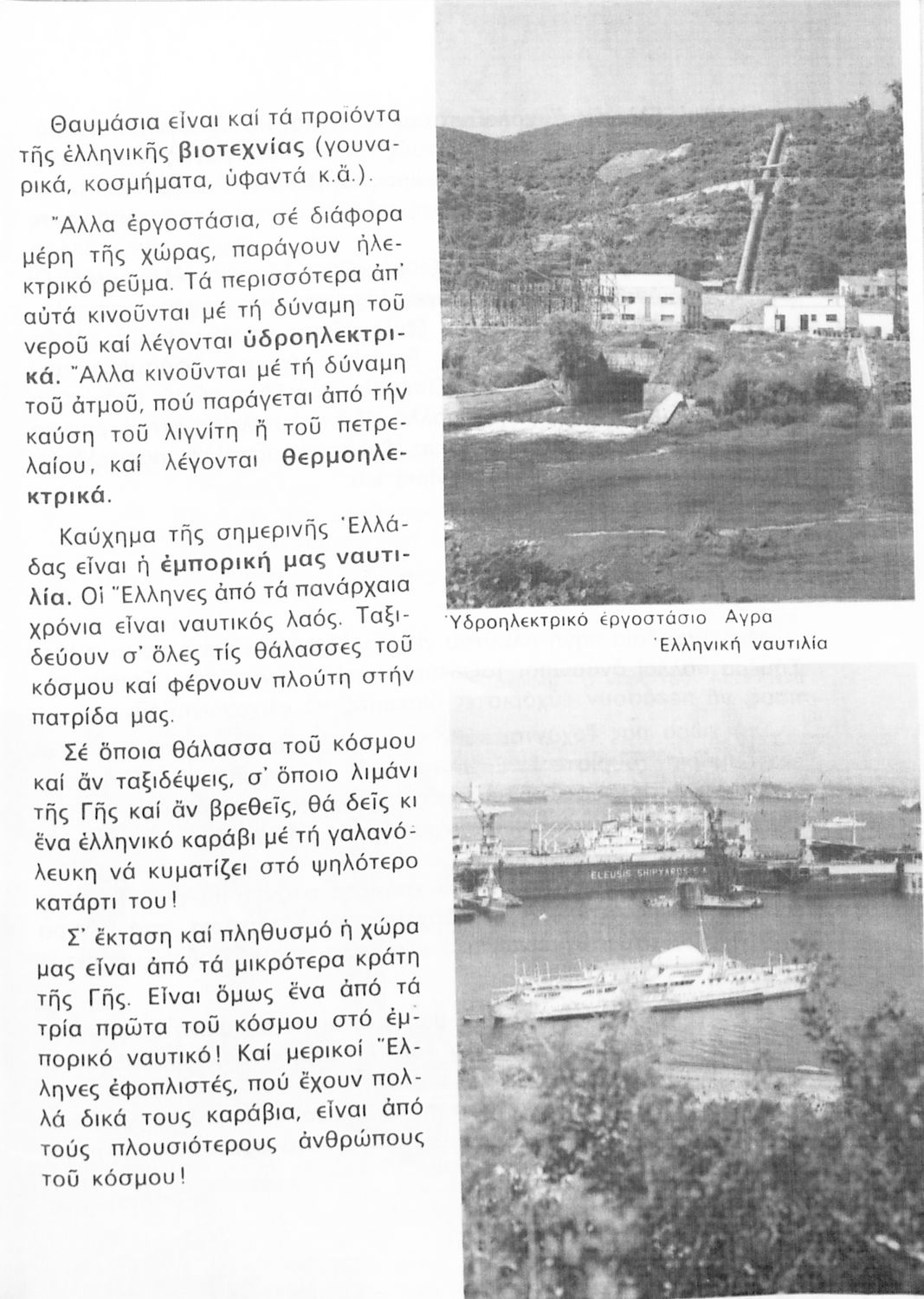 Σχολικό εγχειρίδιο Γεωγραφίας Γ ΄ και Δ' Δημοτικού. Το πρώτο μέρος του βιβλίου απευθύνεται σε μαθητές της Γ' Δημοτικού και αποτελεί μια εισαγωγή στην πατριδογνωσία με έμφαση στις παραδόσεις της ελληνικής επαρχίας. Το δεύτερο μέρος αφορά την Δ' Δημοτικού και εξετάζει την οικονομική, πολιτική και γεωφυσική γεωγραφία της Ελλάδας.