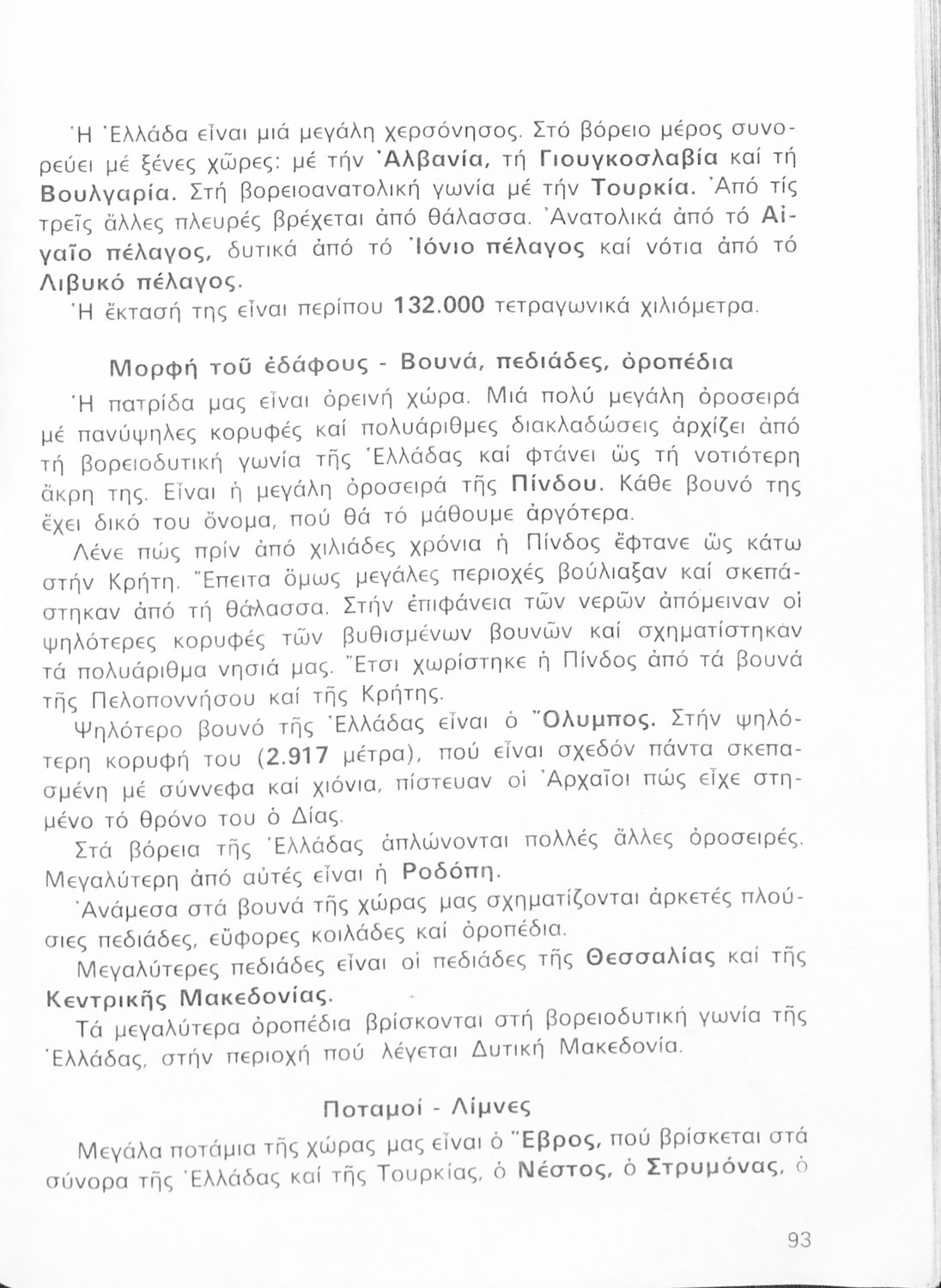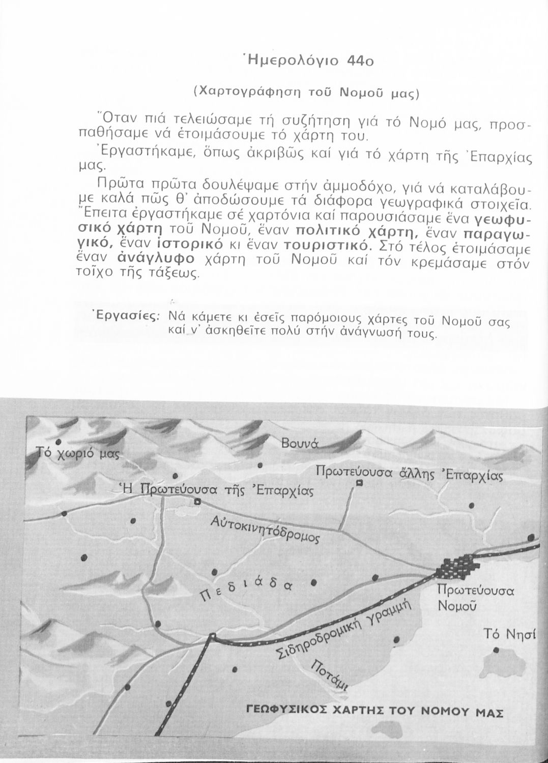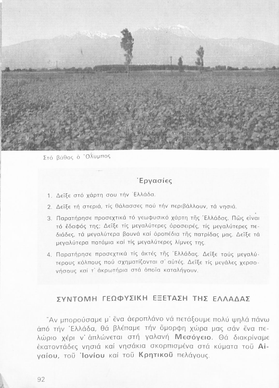 Μαθητικό βοήθημα Γεωγραφίας για τις Γ΄ και Δ΄ Δημοτικού που περιέχει εισαγωγή στη φυσική γεωγραφία και εξετάζει την Ελλάδα ανά διαμέρισμα και νομό από γεωφυσική, οικονομική και πολιτική άποψη.