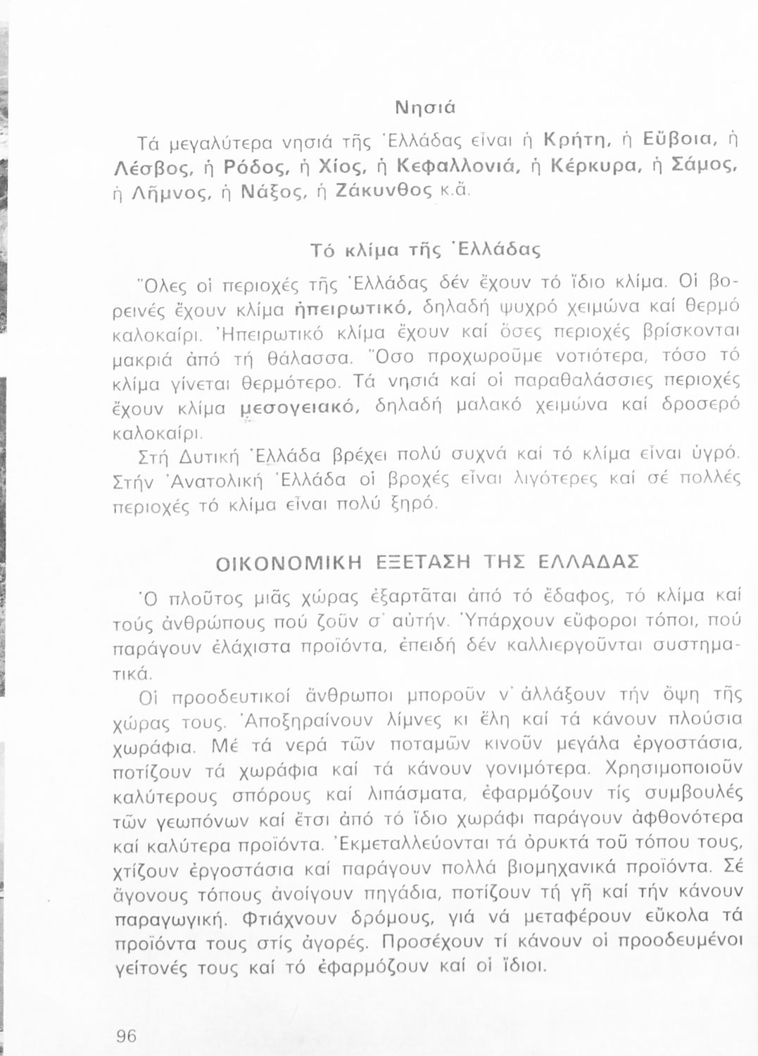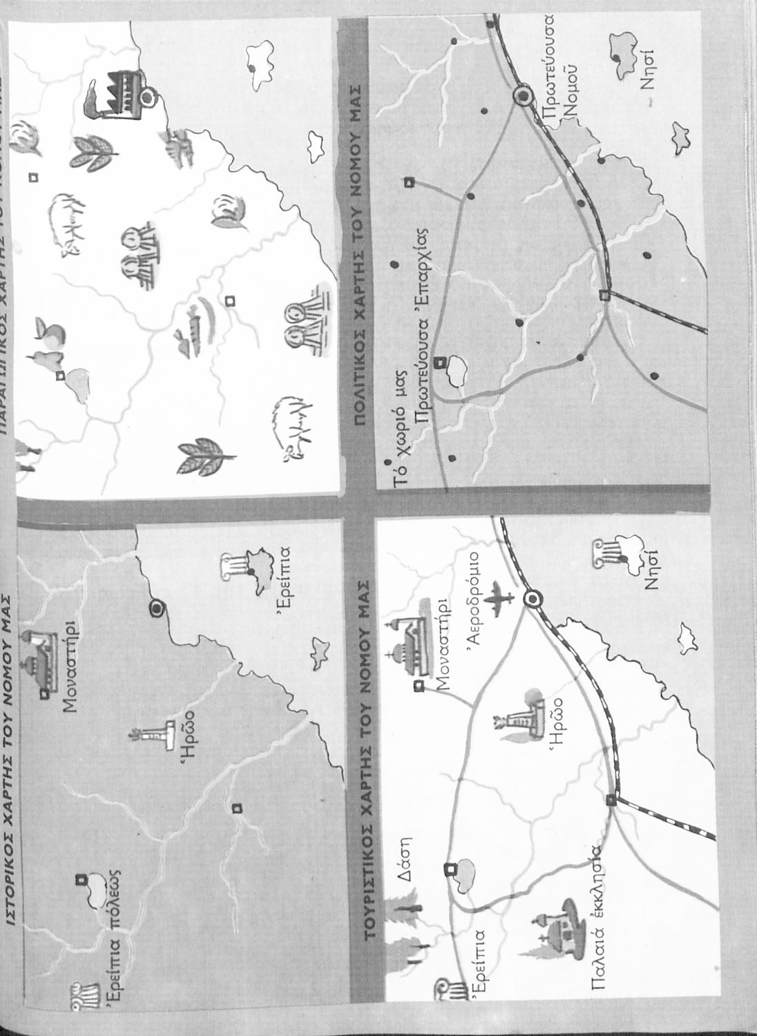 Μαθητικό βοήθημα Γεωγραφίας για την Γ΄ και Δ΄ Δημοτικού που περιέχει χάρτες περιοχών της Ελλάδας τις οποίες εξετάζει από γεωφυσική, πολιτική και οικονομική άποψη.