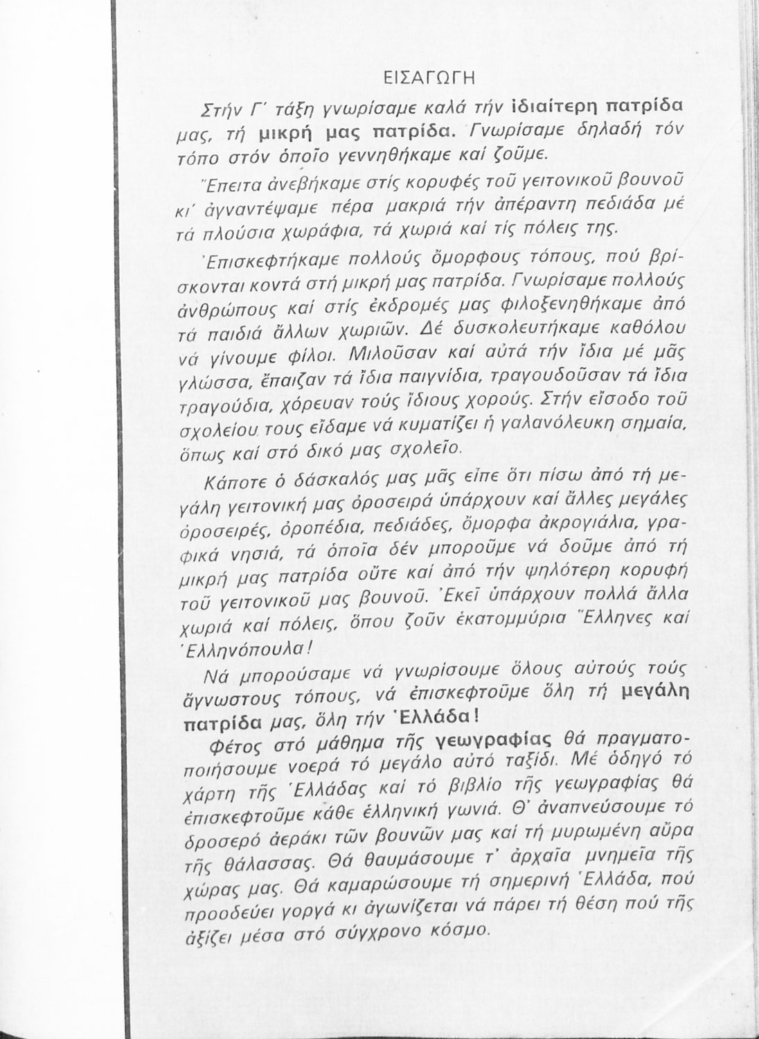 Σχολικό εγχειρίδιο Γεωγραφίας Γ ΄ και Δ' Δημοτικού. Το πρώτο μέρος του βιβλίου απευθύνεται σε μαθητές της Γ' Δημοτικού και αποτελεί μια εισαγωγή στην πατριδογνωσία με έμφαση στις παραδόσεις της ελληνικής ...