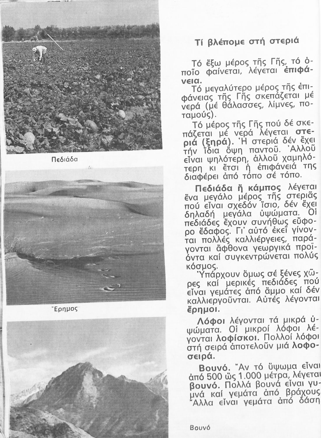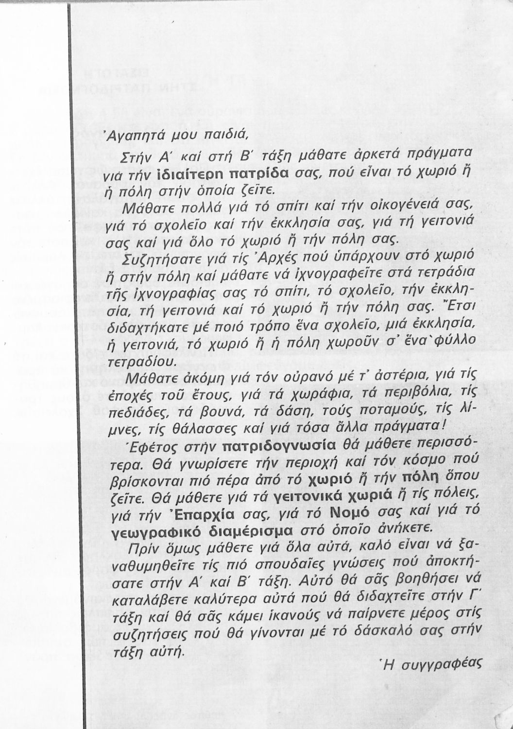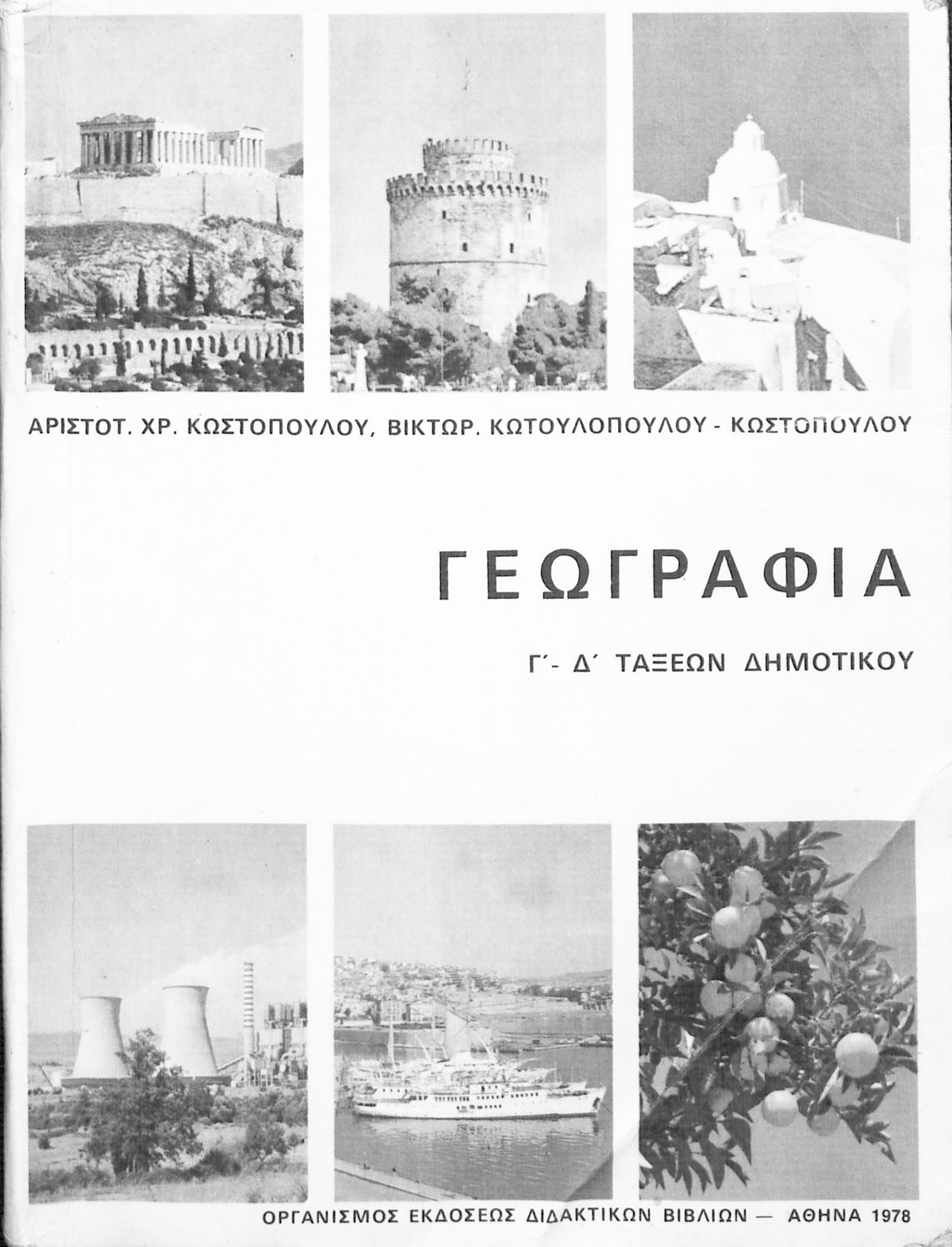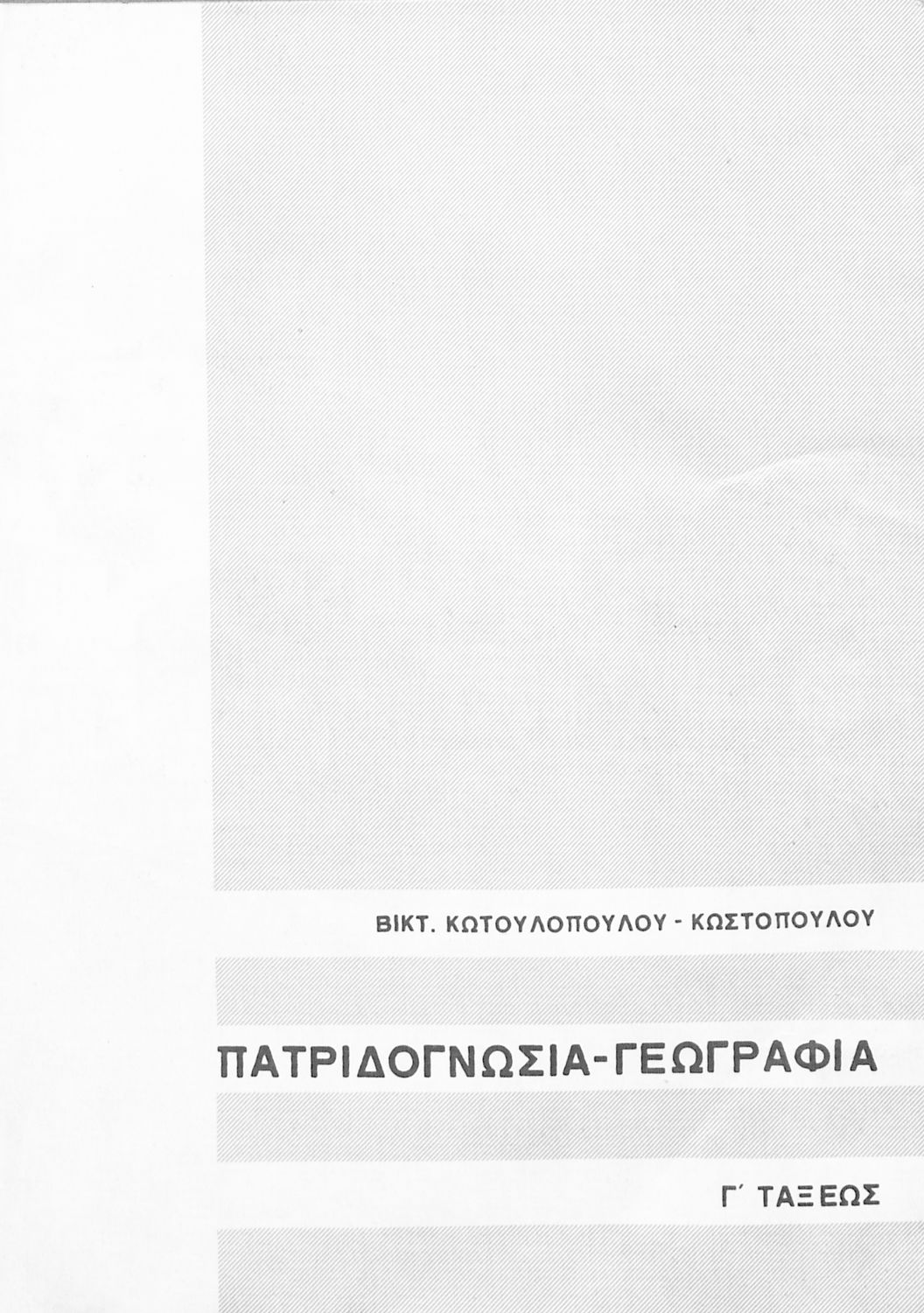 Βαθμίδα εκπαίδευσης: Πρωτοβάθμια Τάξη: Γ' Δημοτικού / Δ' Δημοτικού Μάθημα: Γεωγραφία Γλώσσα: Δημοτική Παρουσίαση περιεχομένου: Σχολικό εγχειρίδιο Γεωγραφίας Γ ΄ και Δ' Δημοτικού. Το πρώτο μέρος του βιβλίου απευθύνεται σε μαθητές της Γ' Δημοτικού και αποτελεί μια εισαγωγή στην πατριδογνωσία με έμφαση στις παραδόσεις της ελληνικής επαρχίας. Το δεύτερο μέρος αφορά την Δ' Δημοτικού και εξετάζει την οικονομική, πολιτική και γεωφυσική γεωγραφία της Ελλάδας. |